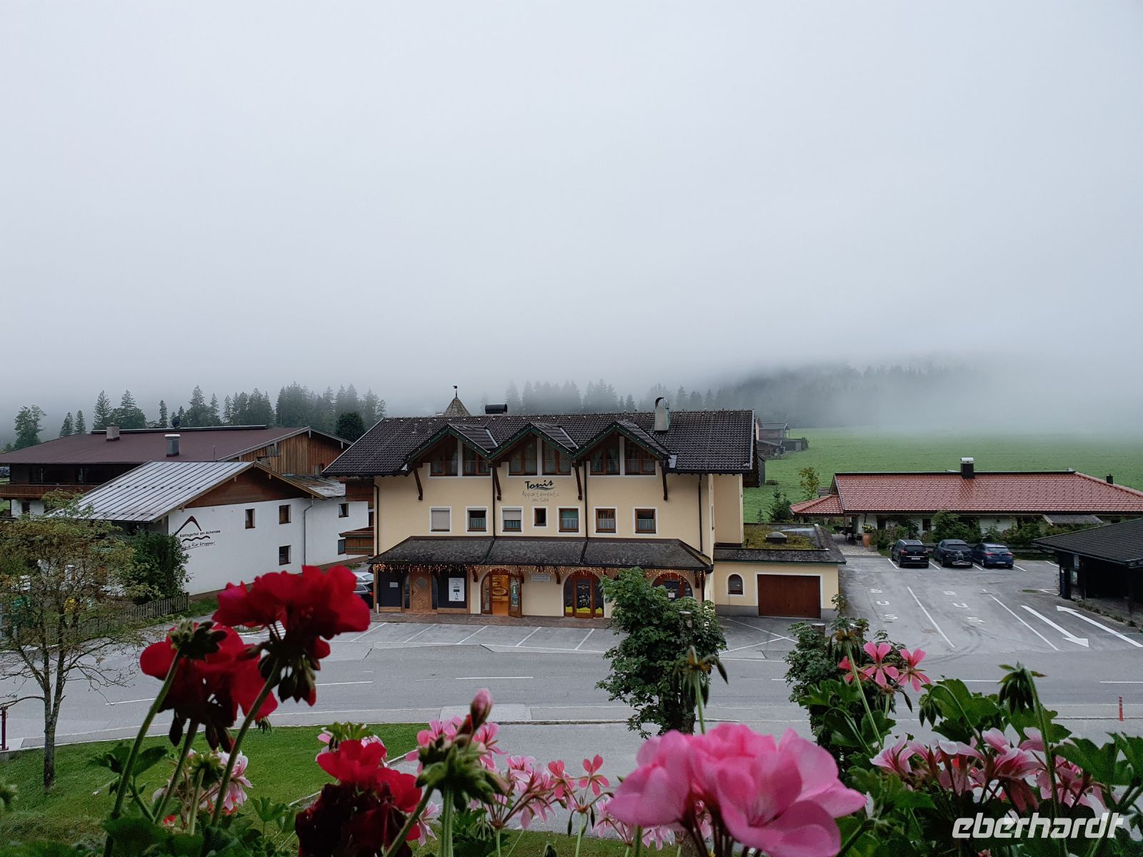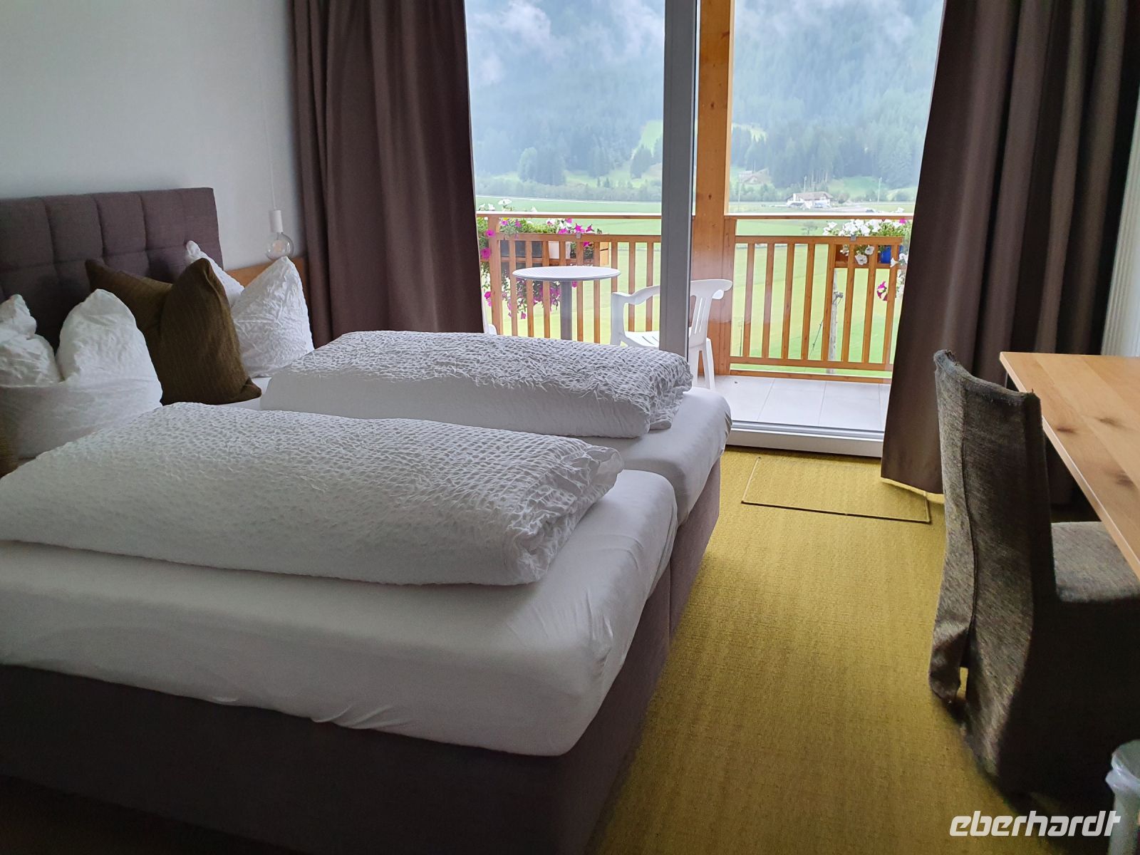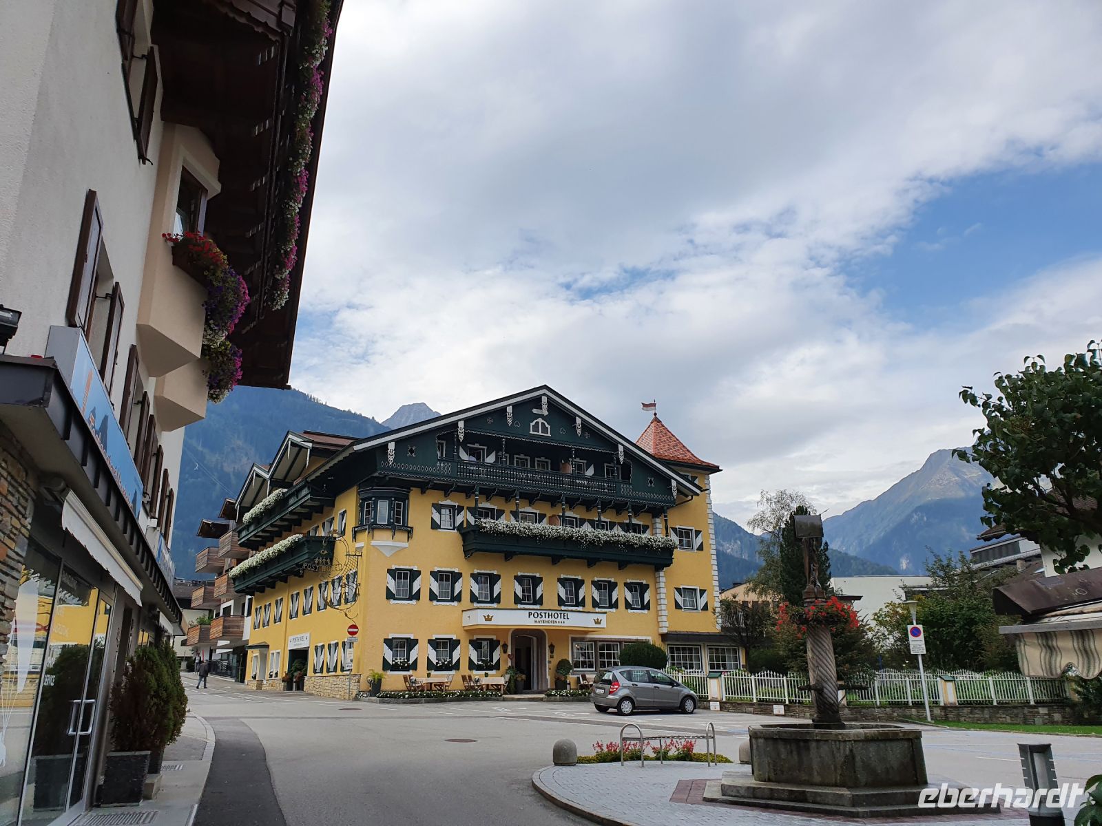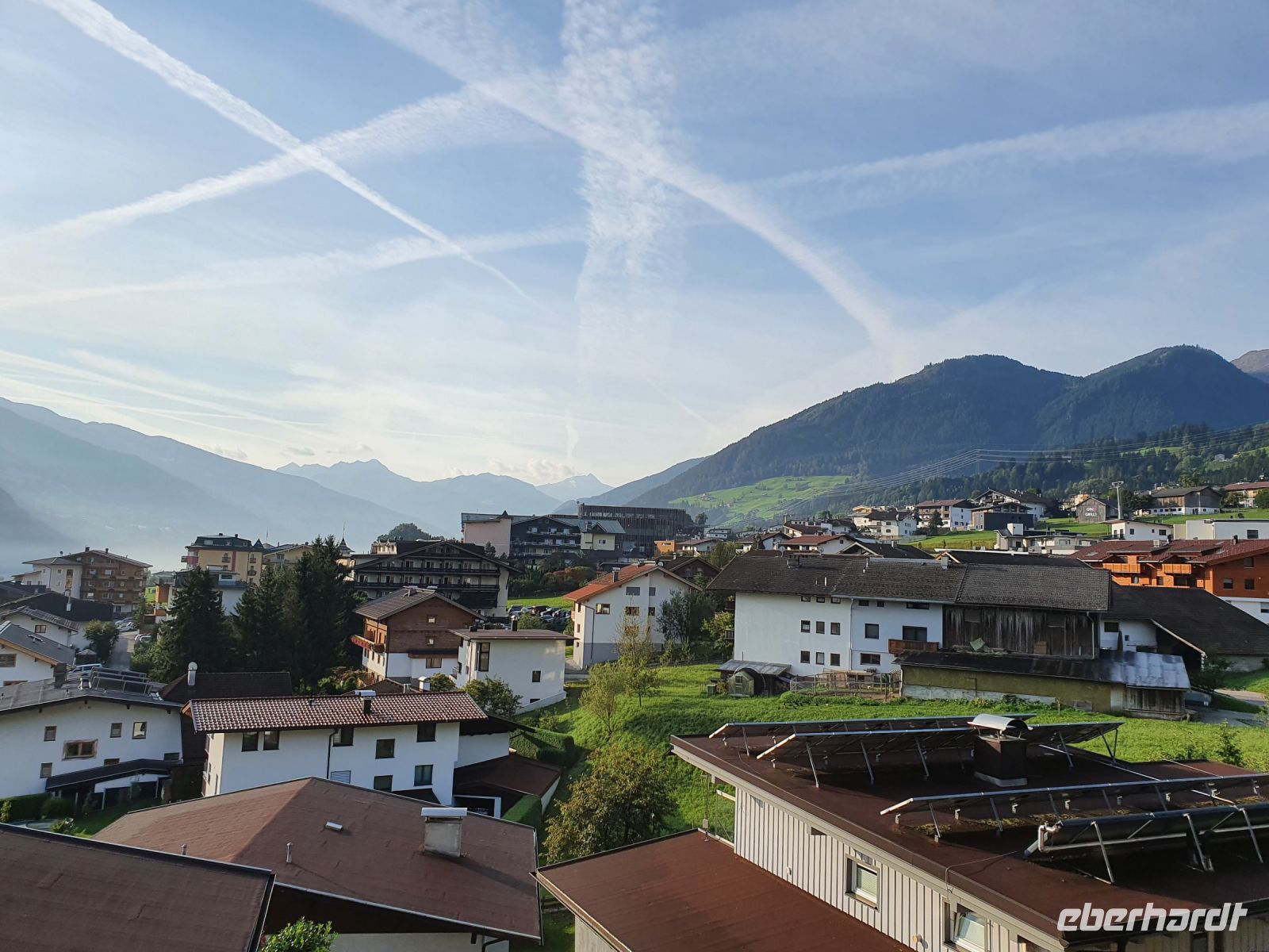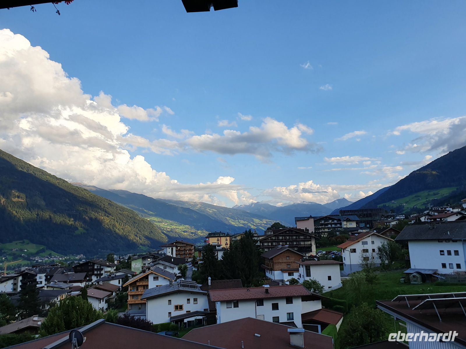 Nach dem Erledigen einiger Einkäufe setzten wir unsere Wanderung fort immer am Seeufer entlang bis nach Maurach. Leider verläuft der Wanderweg parallel zur Strasse und so war es recht laut am Sonntagnachmittag. In Maurach an der Rofanseilbahn nutzten wir die Toiletten und stöberten im Sportgeschäft. Danach fuhren wir mit dem Linienbus 380 m hinunter ins Inntal nach Jenbach und dort stiegen wir um in die Zillertalbahn. Nach kurzer Fahrt erreichten wir Fügen und da gab es nochmals eine Wanderung bergan bis zu unserem Hotel Bruno. Die Wirtin begrüßte uns schon am Eingang und nachdem wir das Abendessen ausgewählt hatten, freute sich jeder auf eine Dusche im Zimmer. Der Ausblick von unseren Balkons war grandios bis hin zur Ahornspitze, der wir dann in 2 Tagen ganz nah sein würden. Das Abendessen war wieder sehr gut und dann endlich gings ins Bett.
