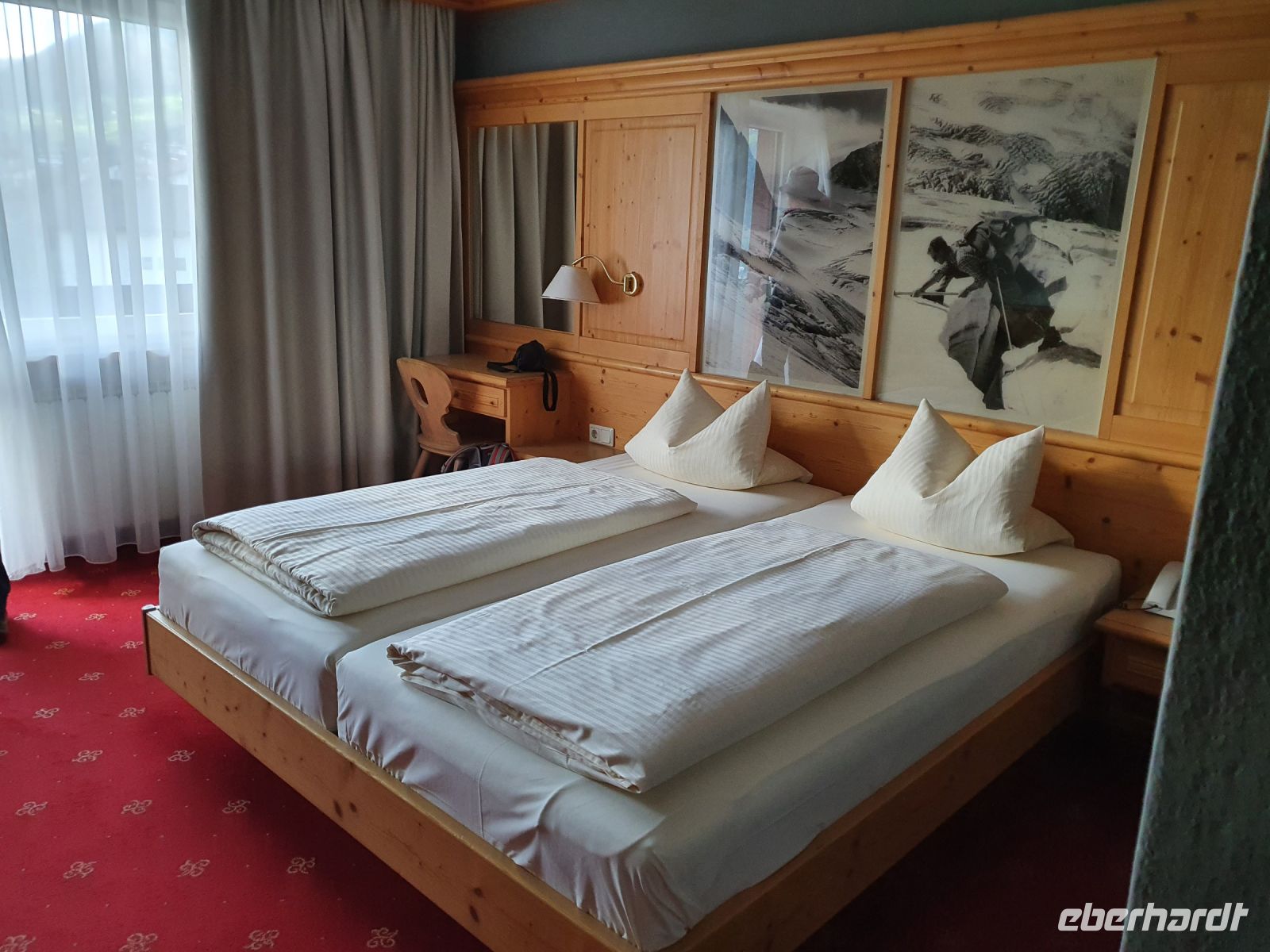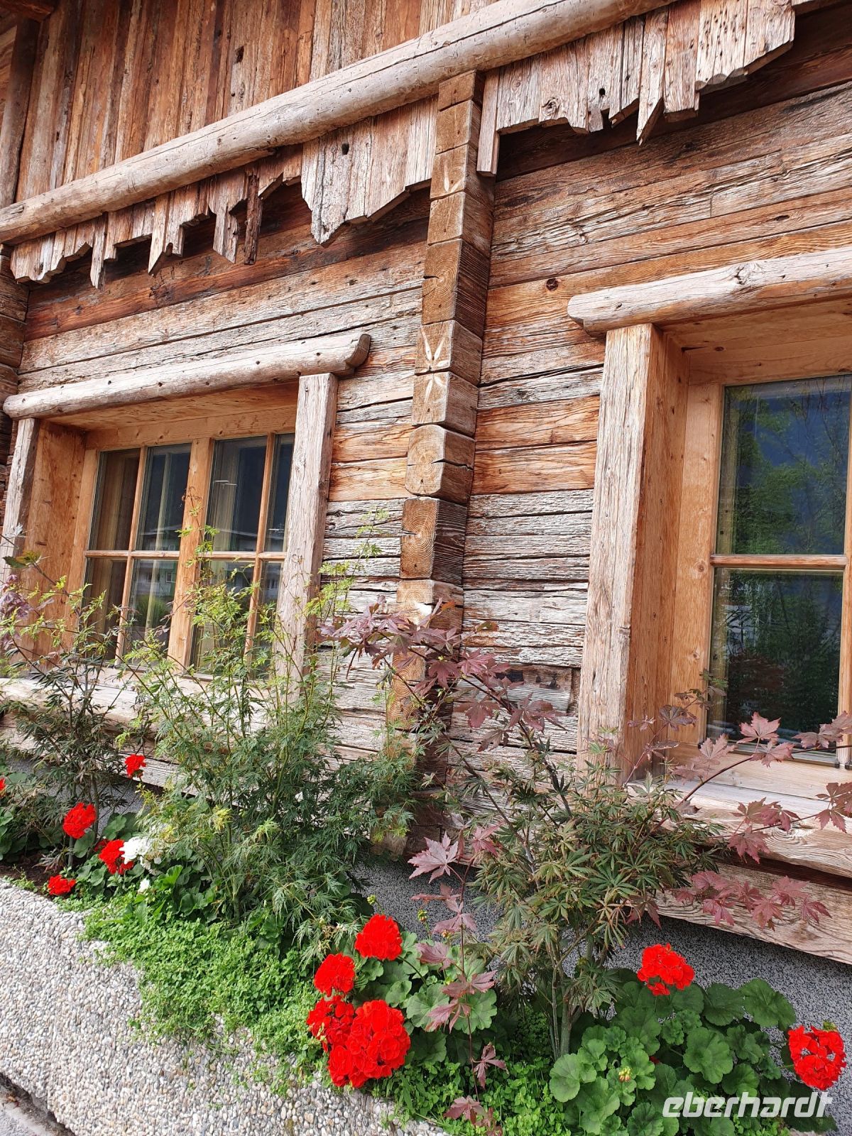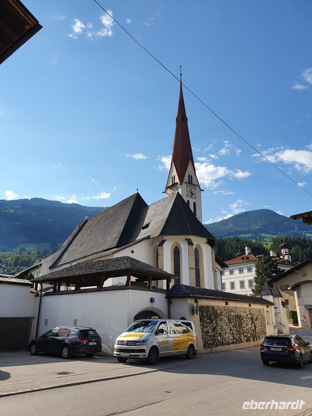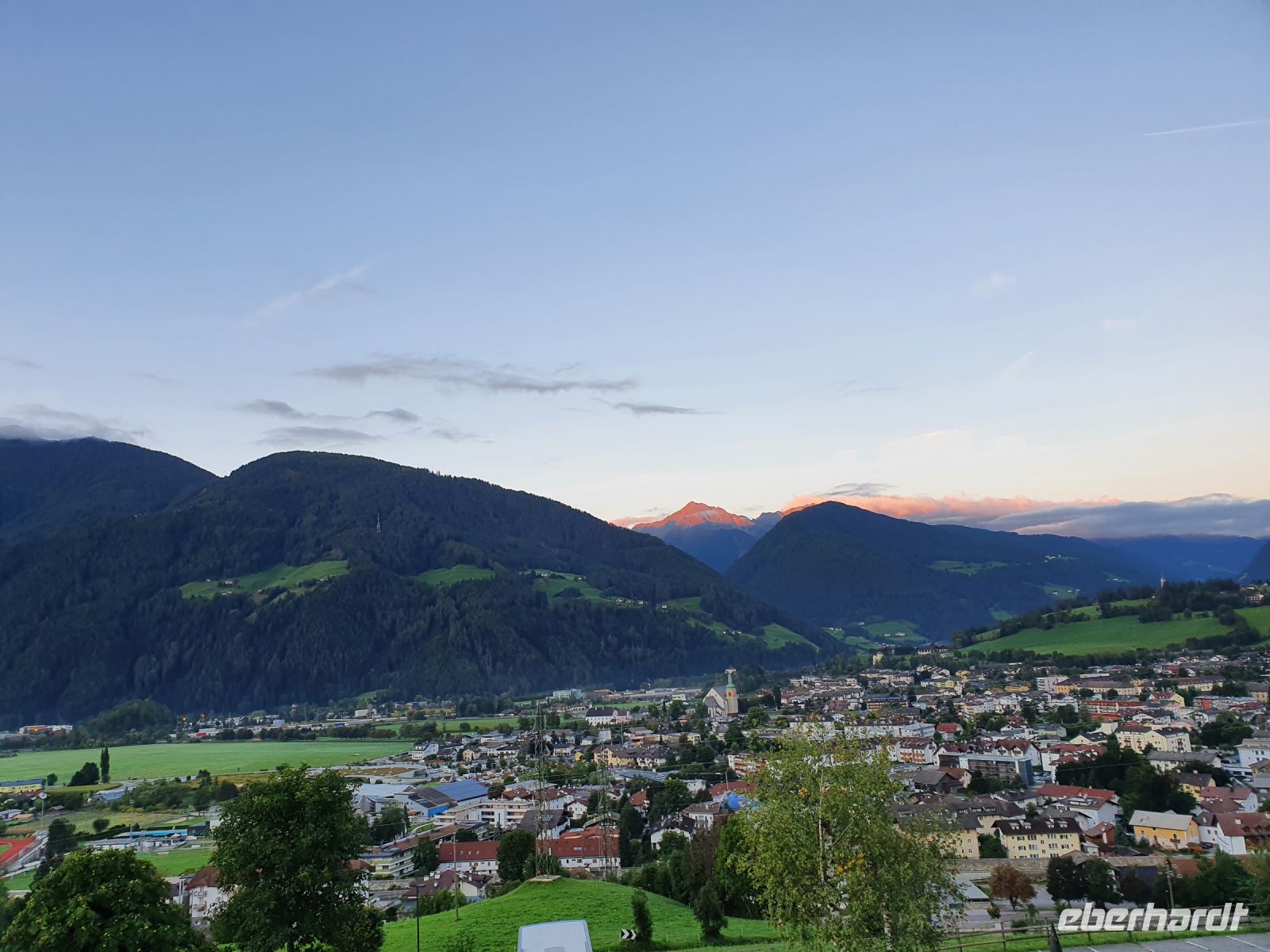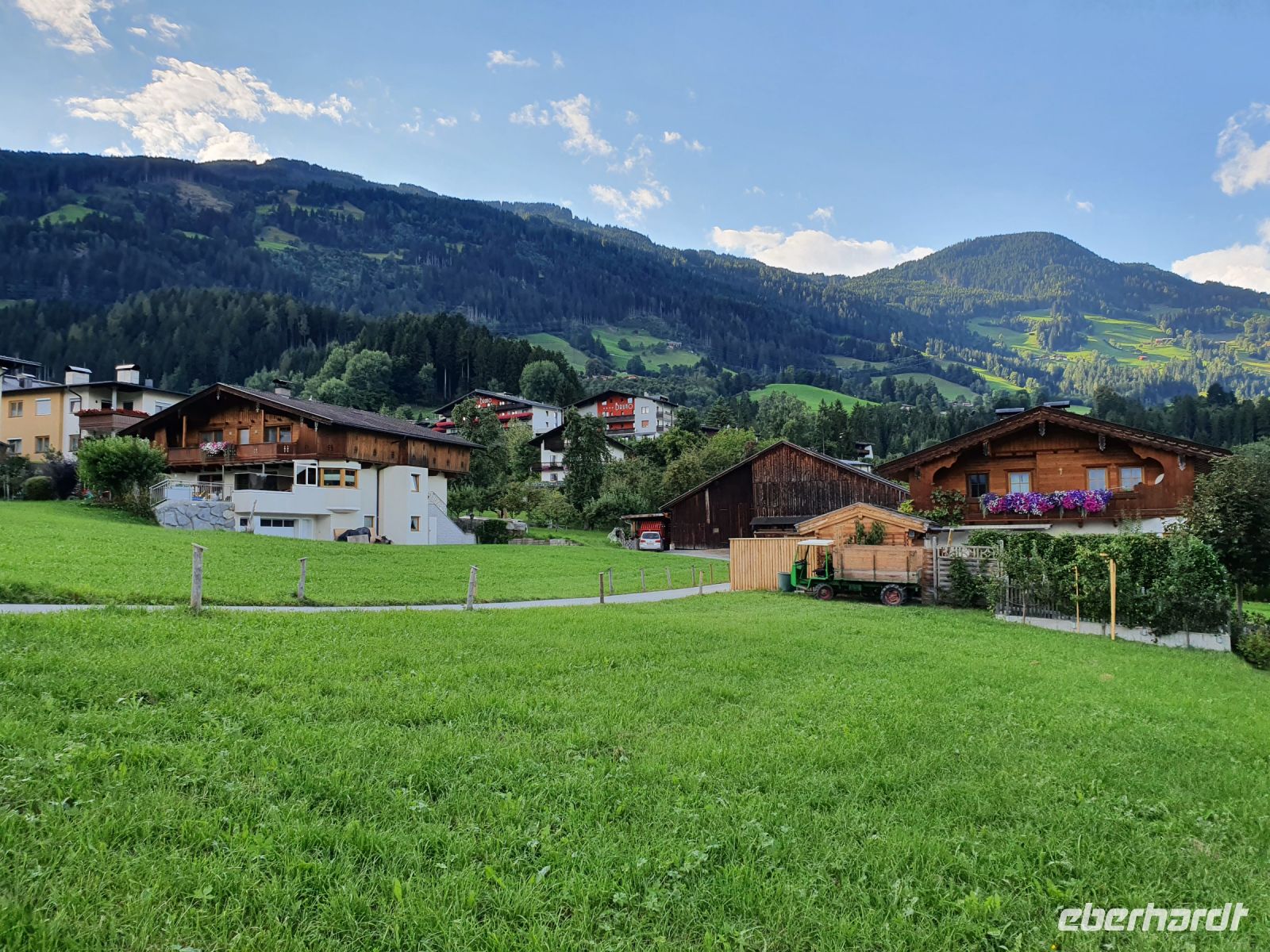 Nach dem Erledigen einiger Einkäufe setzten wir unsere Wanderung fort immer am Seeufer entlang bis nach Maurach. Leider verläuft der Wanderweg parallel zur Strasse und so war es recht laut am Sonntagnachmittag. In Maurach an der Rofanseilbahn nutzten wir die Toiletten und stöberten im Sportgeschäft. Danach fuhren wir mit dem Linienbus 380 m hinunter ins Inntal nach Jenbach und dort stiegen wir um in die Zillertalbahn. Nach kurzer Fahrt erreichten wir Fügen und da gab es nochmals eine Wanderung bergan bis zu unserem Hotel Bruno. Die Wirtin begrüßte uns schon am Eingang und nachdem wir das Abendessen ausgewählt hatten, freute sich jeder auf eine Dusche im Zimmer. Der Ausblick von unseren Balkons war grandios bis hin zur Ahornspitze, der wir dann in 2 Tagen ganz nah sein würden. Das Abendessen war wieder sehr gut und dann endlich gings ins Bett.