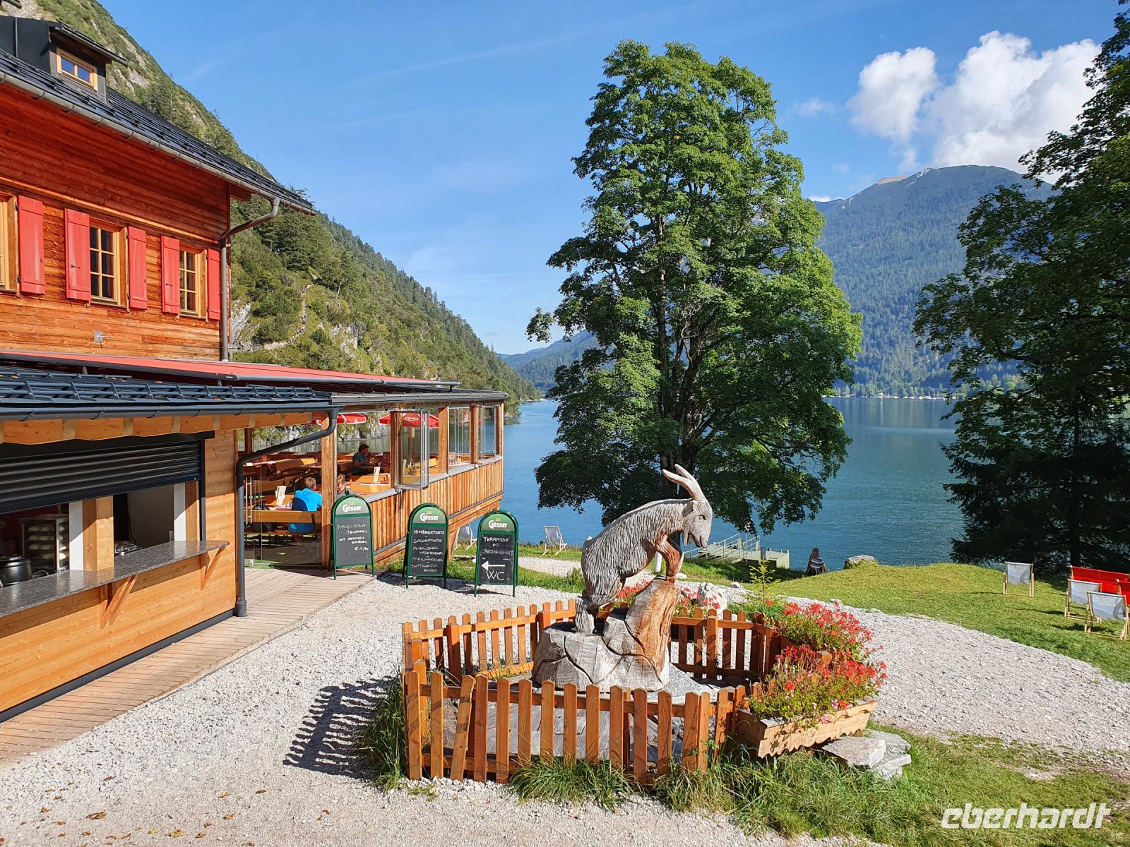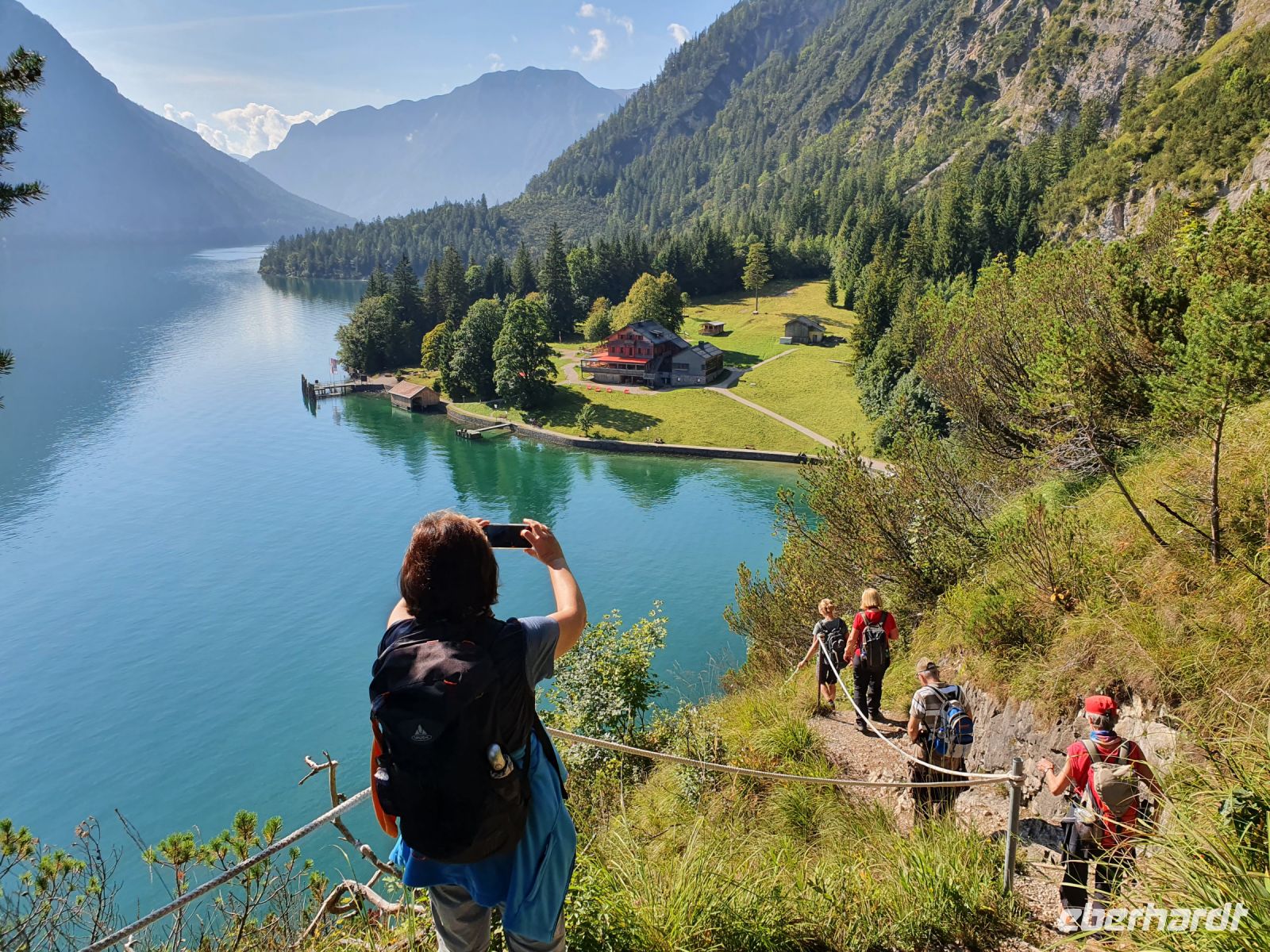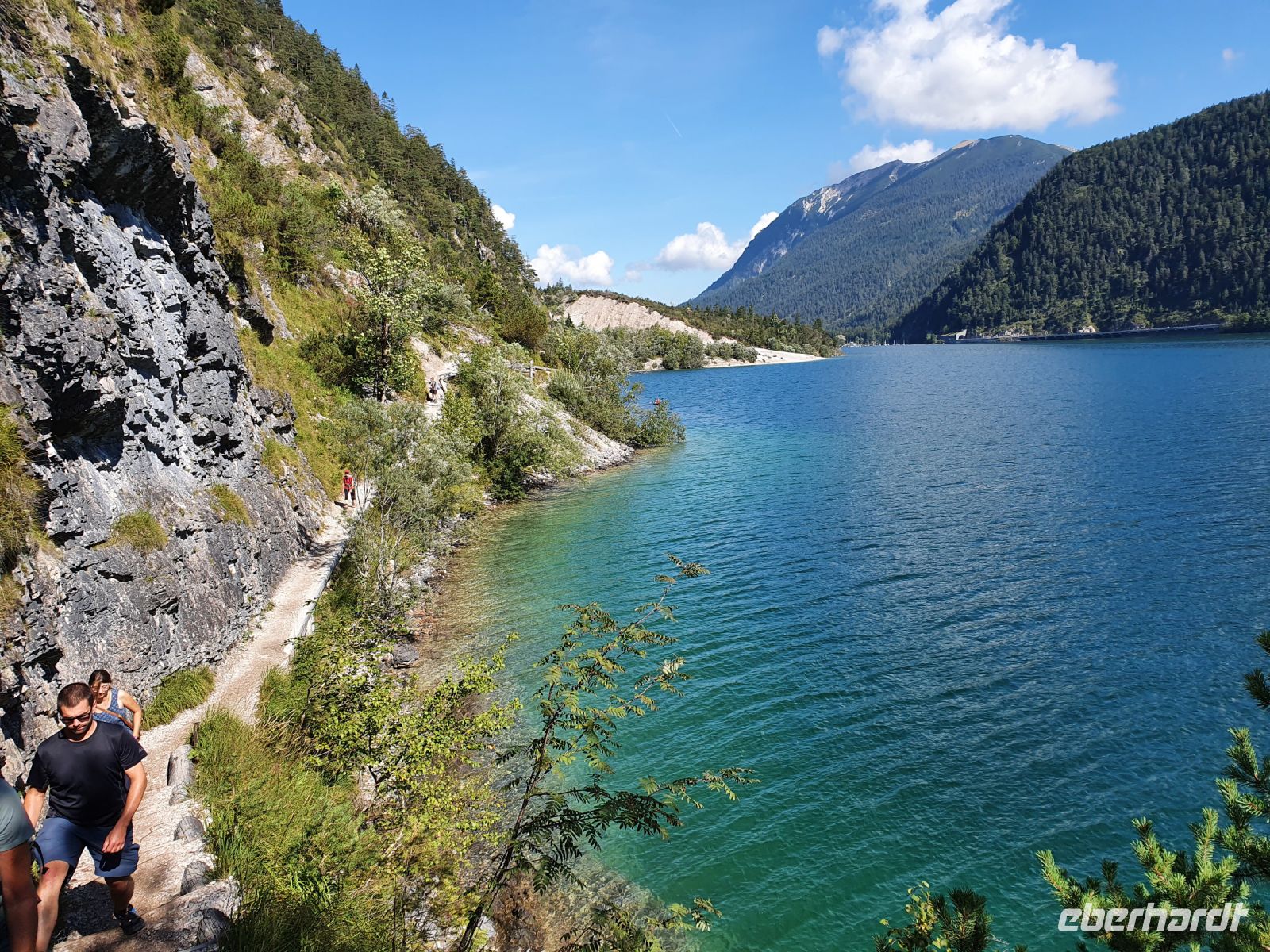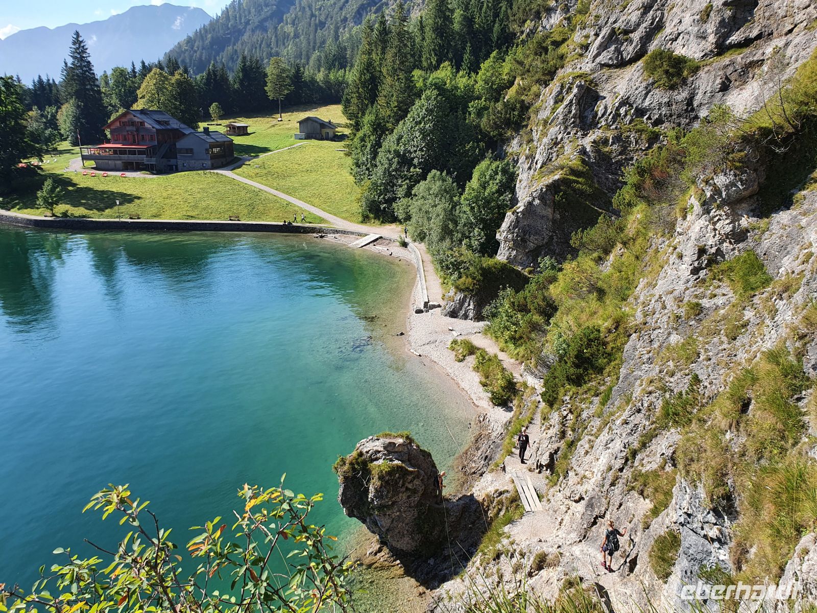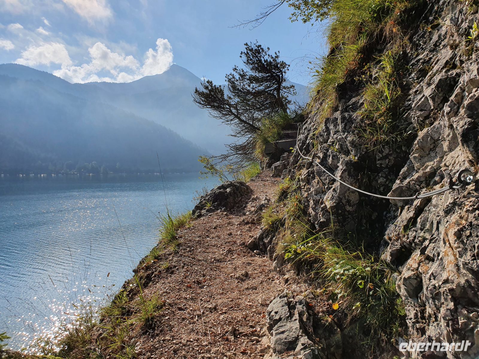 Wieder gab es ein ausgezeichnetes Frühstück und nach dem Abstellen der Koffer ging es gleich vom Hotel los. Vorbei am Campingplatz führte unser Weg durch Wiesen hin zum Felsmassiv am Achensee. Dort begann der eigentliche Gaisalmsteig immer an den Felsen entlang und links mit herrlichen Ausblicken auf den Achensee, der wie ein Fjord anmutete. Die letzten Wolken stiegen auf und gaben die Sicht frei bis nach Pertisau am anderen Ende des Sees. Ab und zu fuhr ein Schiff vorbei und auf dem ersten Abschnitt bis zur Gaisalm waren auch nur wenige Wanderer unterwegs. Der Weg ist traumhaft angelegt, oft steil über dem See, Treppen mal rauf, mal runter und an den schmalsten Stellen sind Sicherungsseile angebracht. Nach der halben Strecke kamen wir zur Gaisalm und gönnten uns eine ausgiebige Pause um Füsse abzukühlen im See oder auf der Terrasse bei einem kühlen Drink. Auf dem folgenden Wegabschnitt kamen uns sehr sehr viele Ausflügler entgegen und so mussten wir zwangsweise immer mal stoppen. Pünktlich zur Mittagszeit erreichten wir Pertisau und kehrten ein in der Konditorei "Christina".