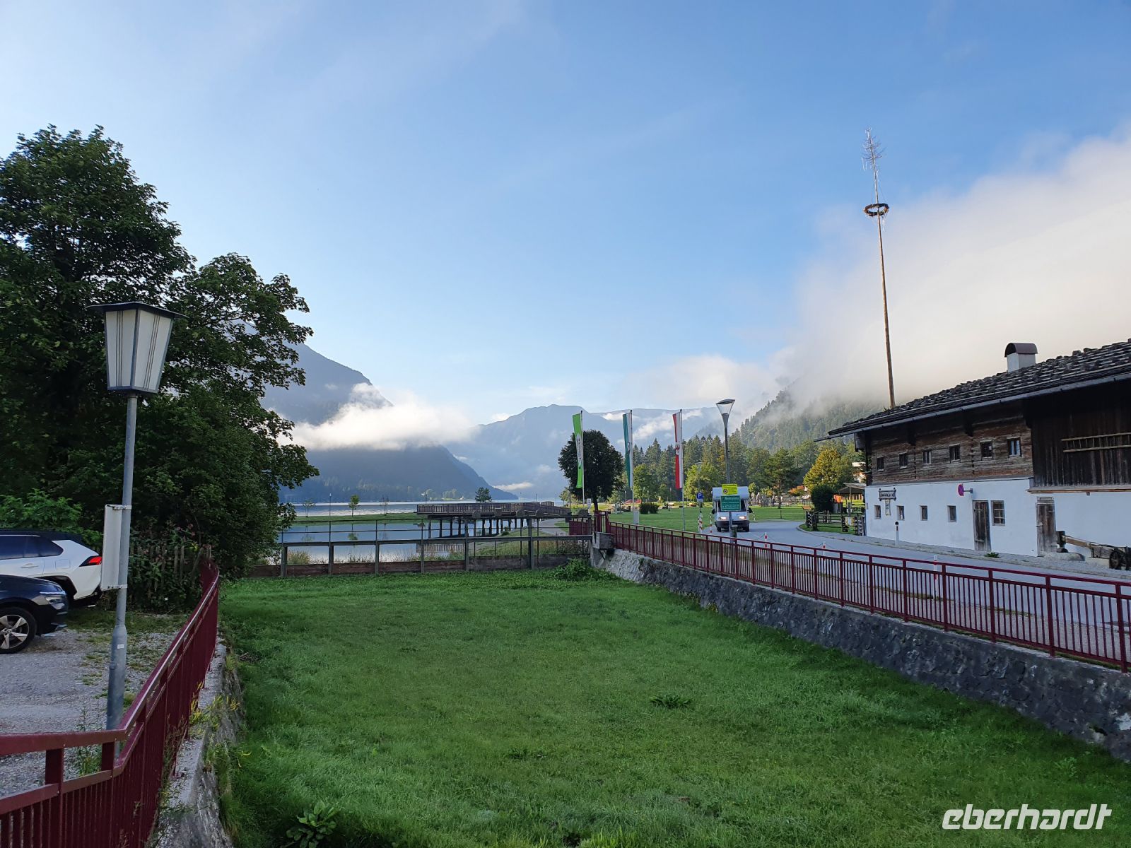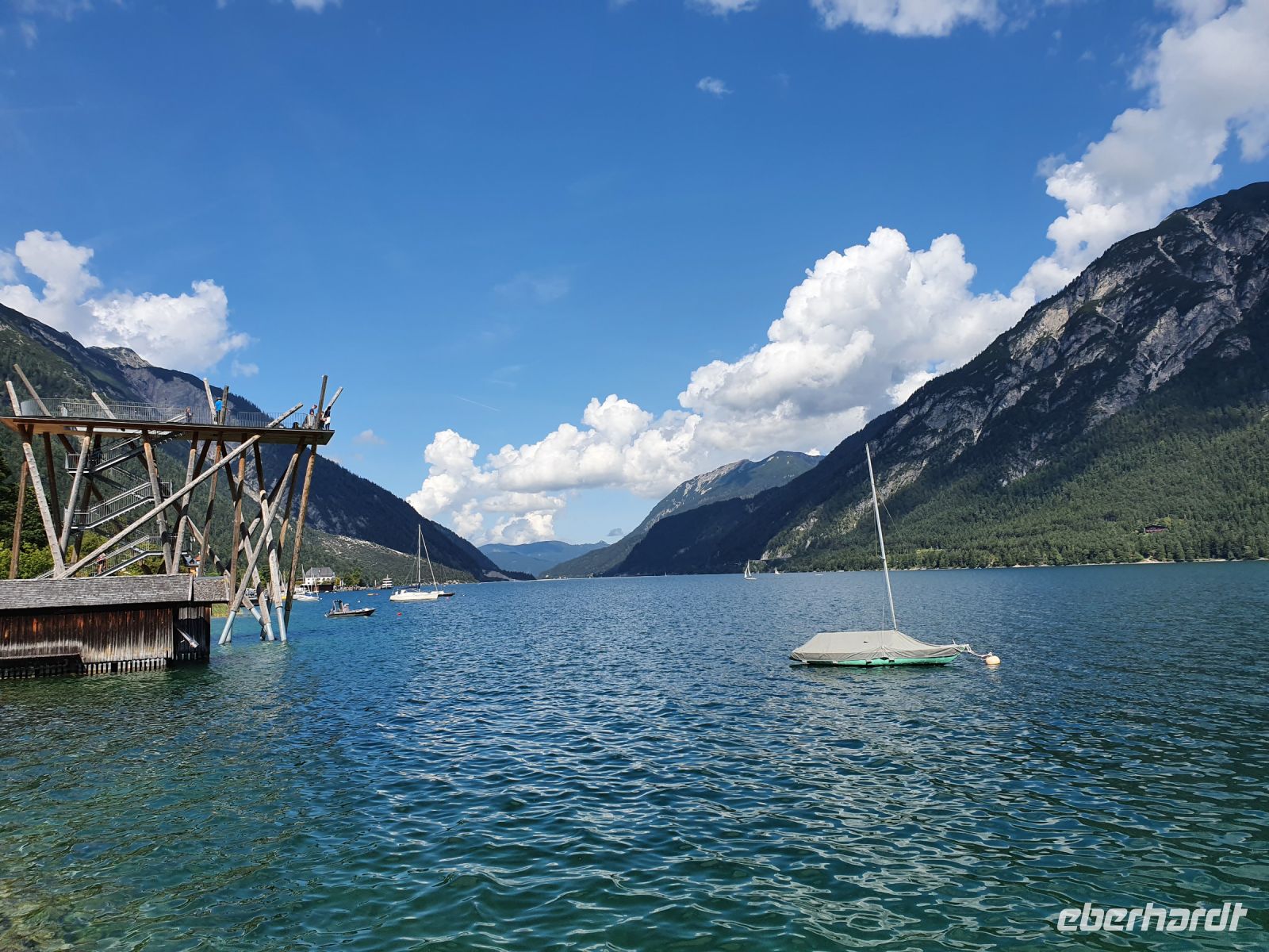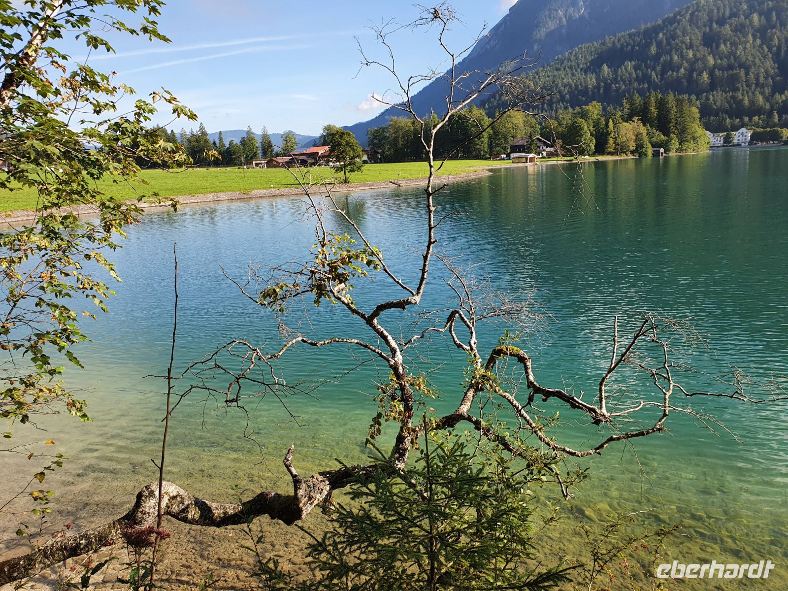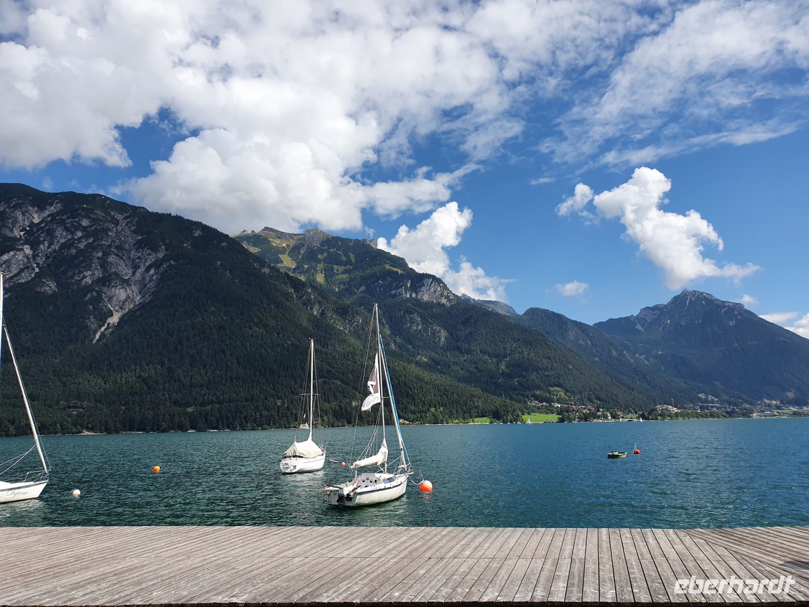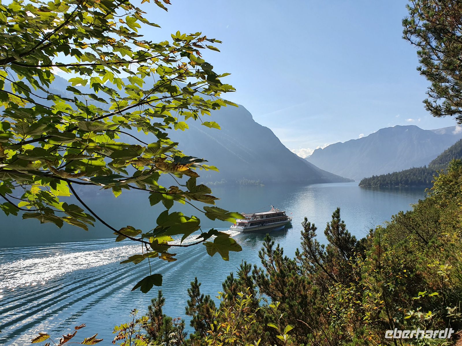 Wieder gab es ein ausgezeichnetes Frühstück und nach dem Abstellen der Koffer ging es gleich vom Hotel los. Vorbei am Campingplatz führte unser Weg durch Wiesen hin zum Felsmassiv am Achensee. Dort begann der eigentliche Gaisalmsteig immer an den Felsen entlang und links mit herrlichen Ausblicken auf den Achensee, der wie ein Fjord anmutete. Die letzten Wolken stiegen auf und gaben die Sicht frei bis nach Pertisau am anderen Ende des Sees. Ab und zu fuhr ein Schiff vorbei und auf dem ersten Abschnitt bis zur Gaisalm waren auch nur wenige Wanderer unterwegs. Der Weg ist traumhaft angelegt, oft steil über dem See, Treppen mal rauf, mal runter und an den schmalsten Stellen sind Sicherungsseile angebracht. Nach der halben Strecke kamen wir zur Gaisalm und gönnten uns eine ausgiebige Pause um Füsse abzukühlen im See oder auf der Terrasse bei einem kühlen Drink. Auf dem folgenden Wegabschnitt kamen uns sehr sehr viele Ausflügler entgegen und so mussten wir zwangsweise immer mal stoppen. Pünktlich zur Mittagszeit erreichten wir Pertisau und kehrten ein in der Konditorei "Christina".