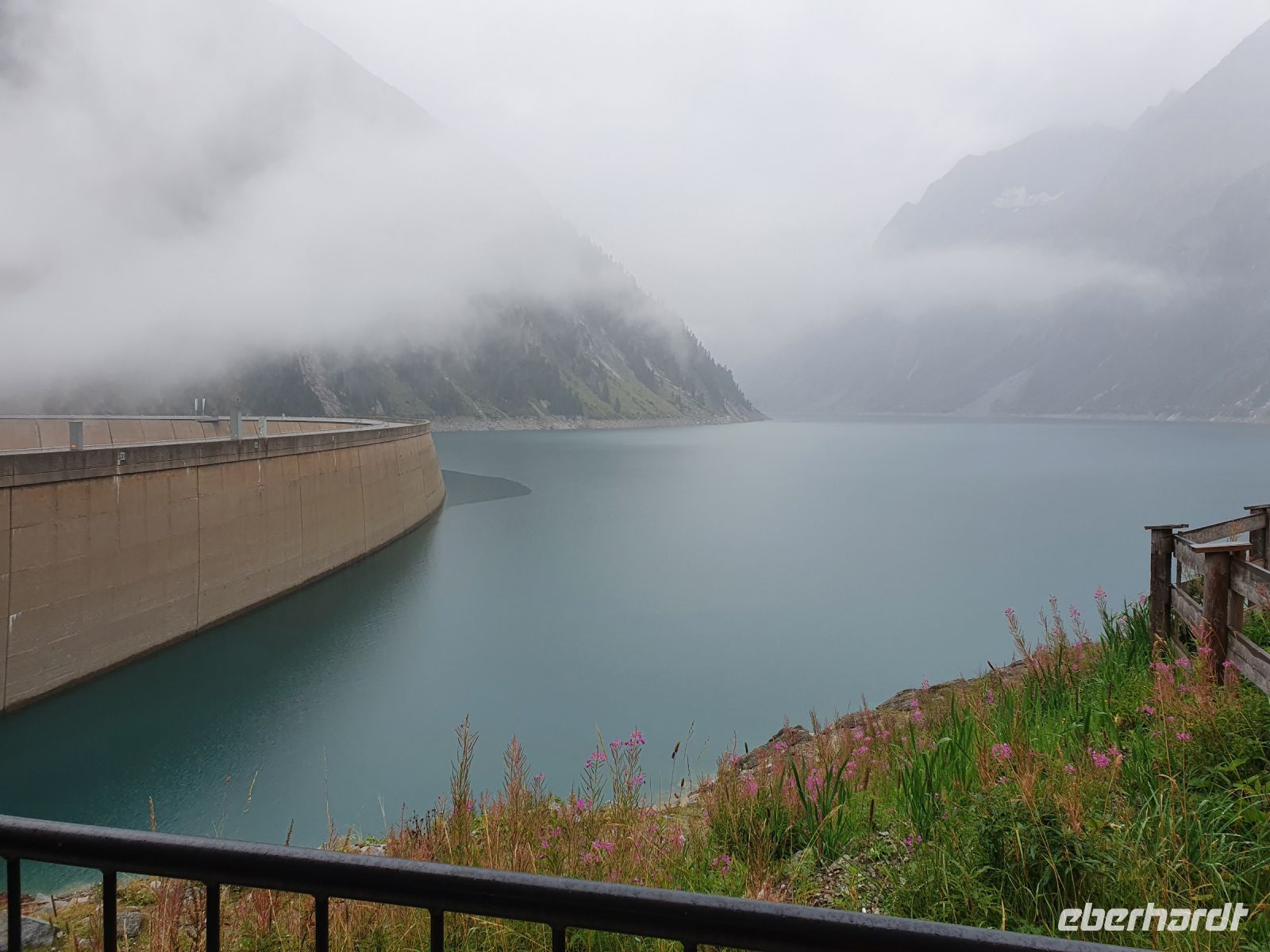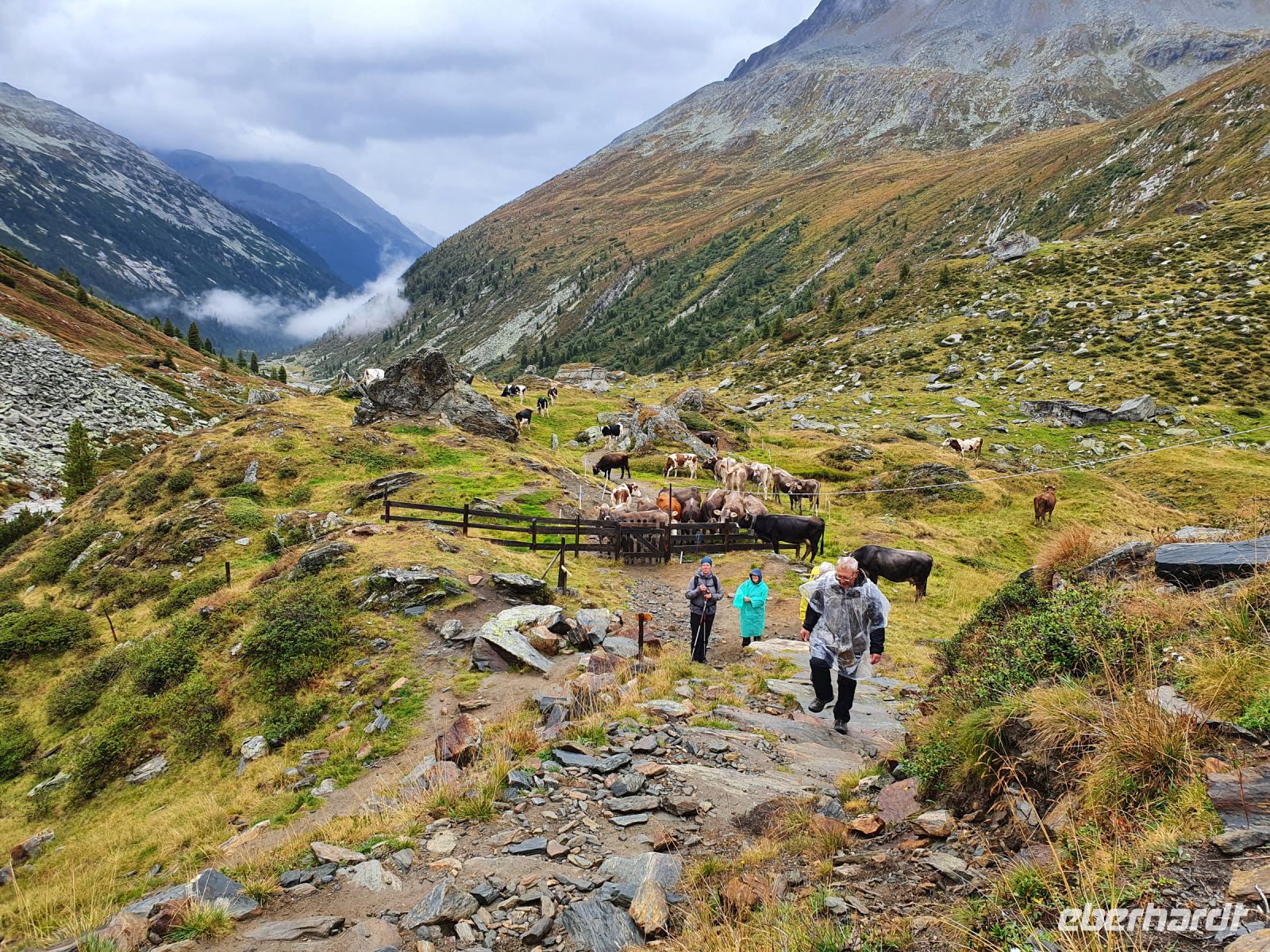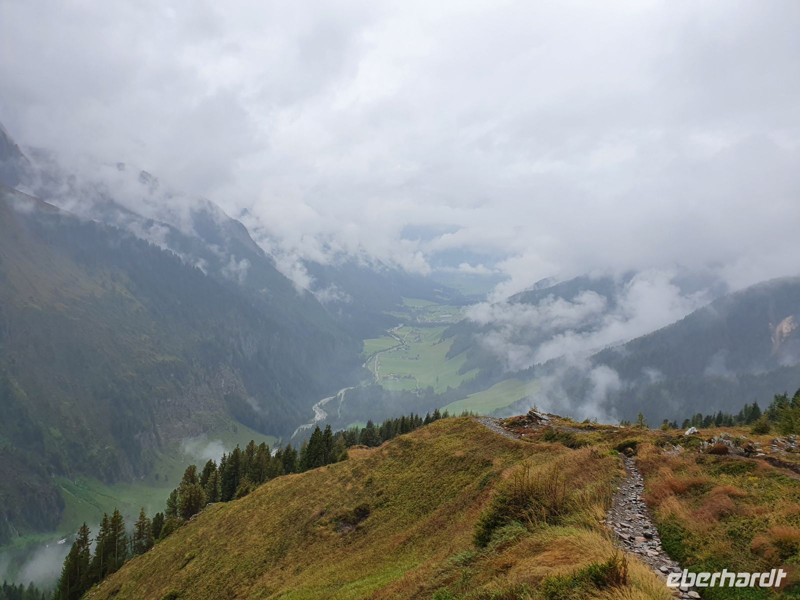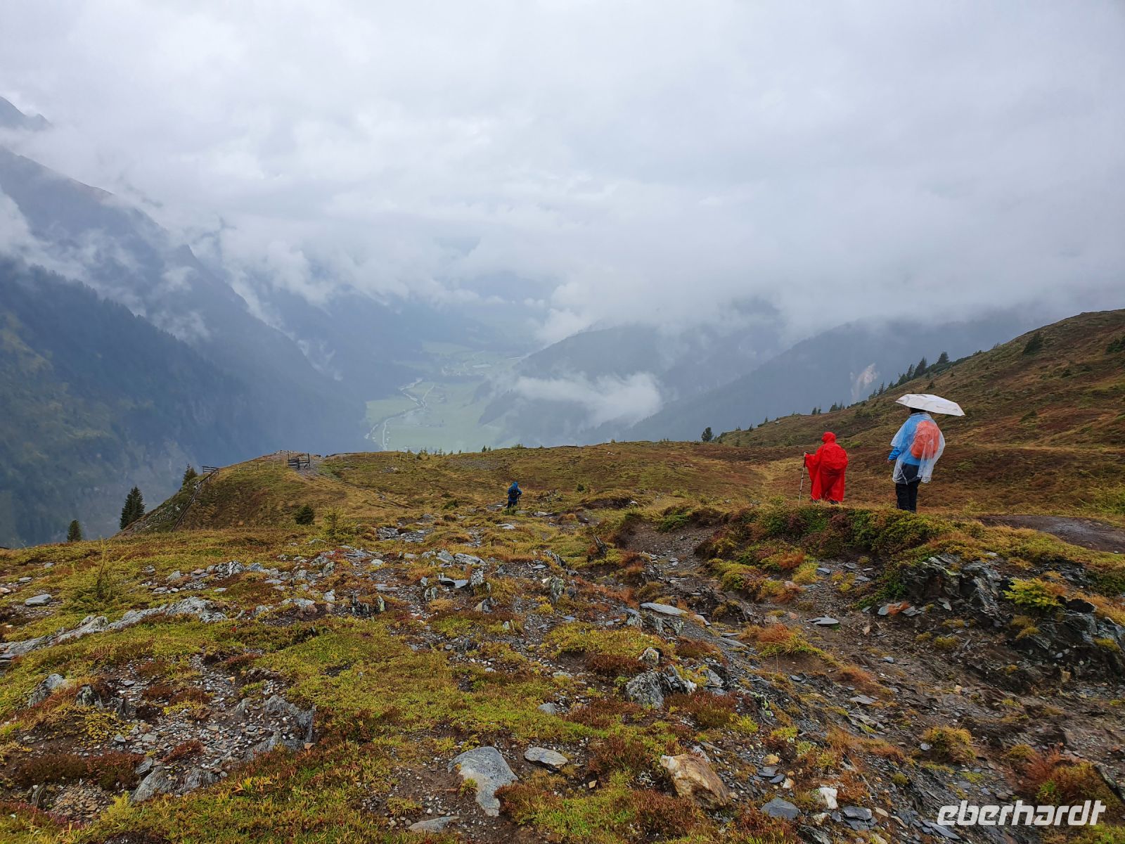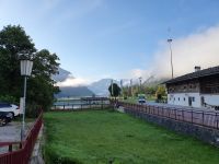 Noch einmal konnten wir das individuell für unsere Gruppe zubereitete Frühstück im Hotel Maria Theresia geniessen und dann holten uns 2 Taxis ab und brachten uns hinauf zum Schlegeisspeicher. 2 Wanderer fuhren mit unserem Gepäck hinüber nach Südtirol. Am Schlegeisspeicher hingen die Wolken ganz tief und es regnete. So zogen wir unsere Regenkleidung an, spannten die Schirme auf und los gings zunächst noch am Ufer des Schlegeisspeichers entlang und weiter im Flusstal immer bergan. Kurz vor dem Aufstieg zur Lavitzalm liess der Regen nach und wir nutzten die Zeit zum Fotografieren. Vor der Alm hiess es, sich durch eine Kuhherde zu bewegen und dann kam ein steiler Anstieg auf einem Plattenweg aus Natursteinen hinauf zu Alm. Wir kehrten nicht ein, sondern gingen zügig weiter durch ein Flusstal und dann wieder steil bergan bis zur Grenze Österreich - Italien. Am Grenzstein wurde wieder fleißig fotografiert und nun war es nicht mehr weit bis zum Pfitscher Joch Haus. Allerdings sahen wir das Gebäude erst, als wir kurz davor standen weil die Wolken so tief hingen. Im Pfitscher Joch Haus war es schön warm und gemütlich. So konnten wir die nasse Kleidung ablegen und trocknen und uns mit südtiroler Gerichten stärken. Seit 1888 ist diese Alm ununterbrochen in Familienbesitz und das spürt man auch an der Gastlichkeit der Familie. Nach einer Stunde brachen wir auf und begannen den langen, steilen Abstieg hinunter ins Pfitschtal. Wir entschlossen uns, doch den kurzen und steilen Weg zu nehmen und wir wurden belohnt, denn nach wenigen Metern rissen die Wolken ein wenig auf und gaben den Blick frei ins Tal. Auch ließ der Regen nach und so machte der Abstieg richtig Freude. Leider verstauchte sich im unteren Teil des Weges eine Wanderfreundin den Fuß und so kamen wir nur noch langsam voran und erreichten den geplanten 15.10 Uhr Bus nicht mehr. So wanderte der Großteil der Gruppe weiter bis zu unserem Hotel und ich wartete mit der Verletzten auf den nächsten Bus. Im Hotel Kranebitt in Kematen waren wir dann zum checkin alle wieder vereint. Das Abendessen war sehr schmackhaft und für unseren letzten Wandertag sagte die App wieder Sonnenschein voraus. So konnten wir ganz entspannt ins Bett gehen und uns auf den letzten Wandertag freuen.