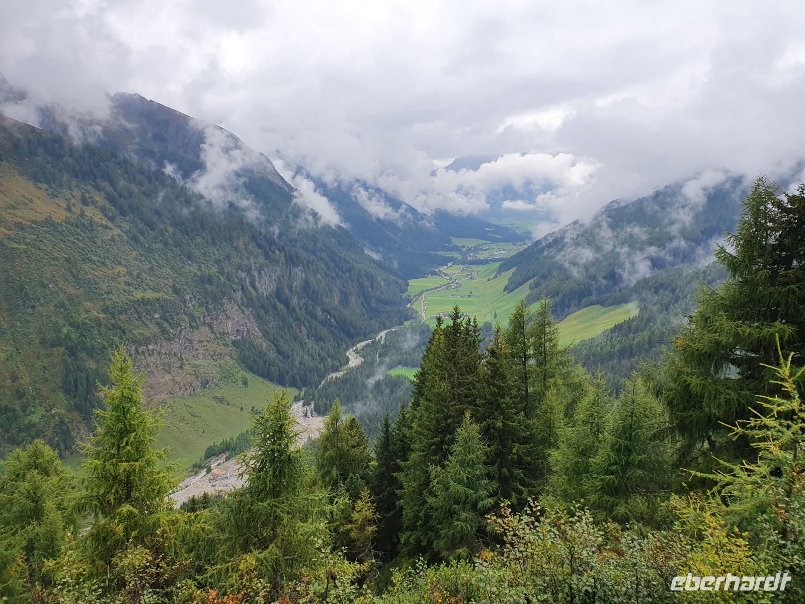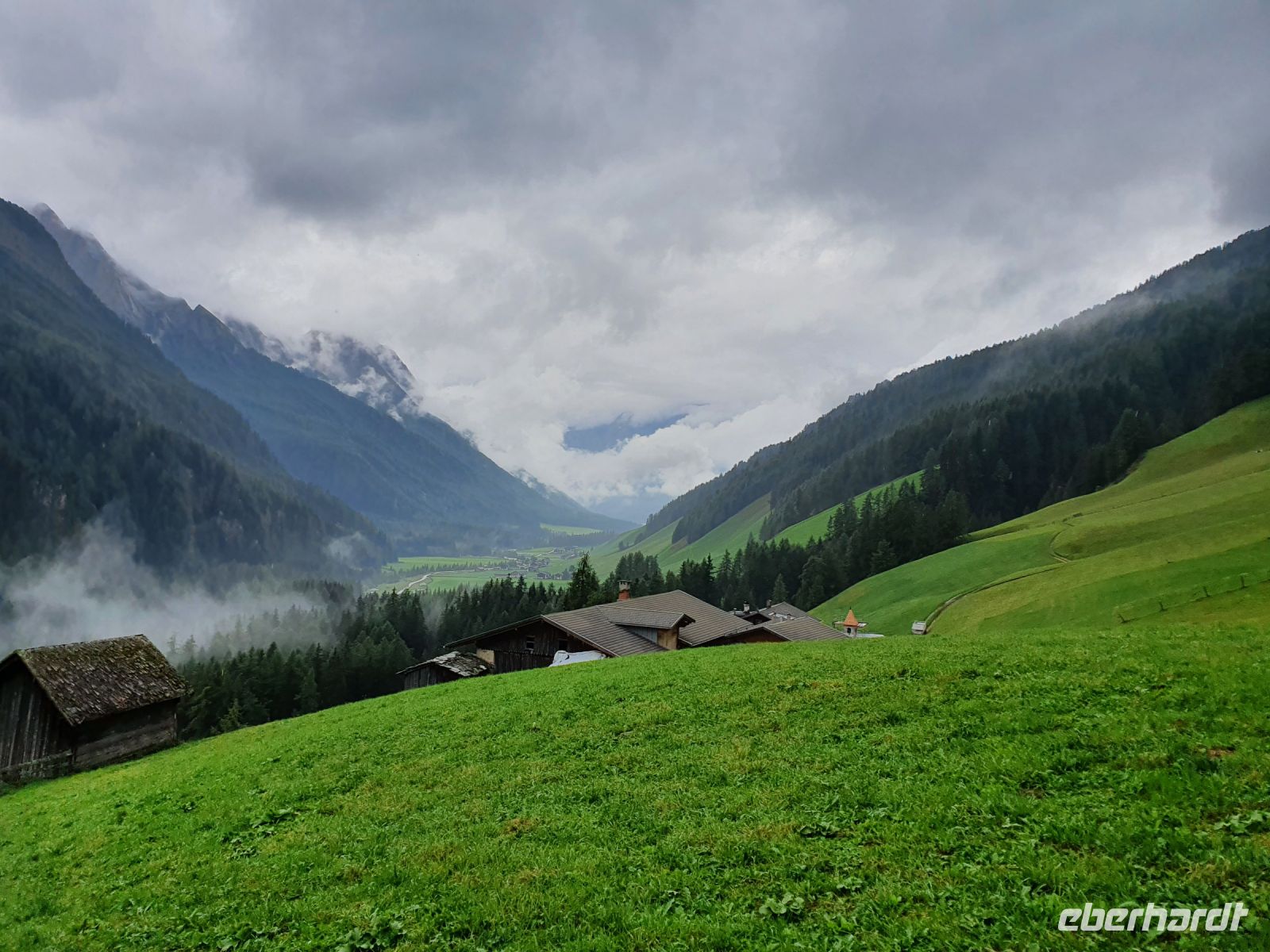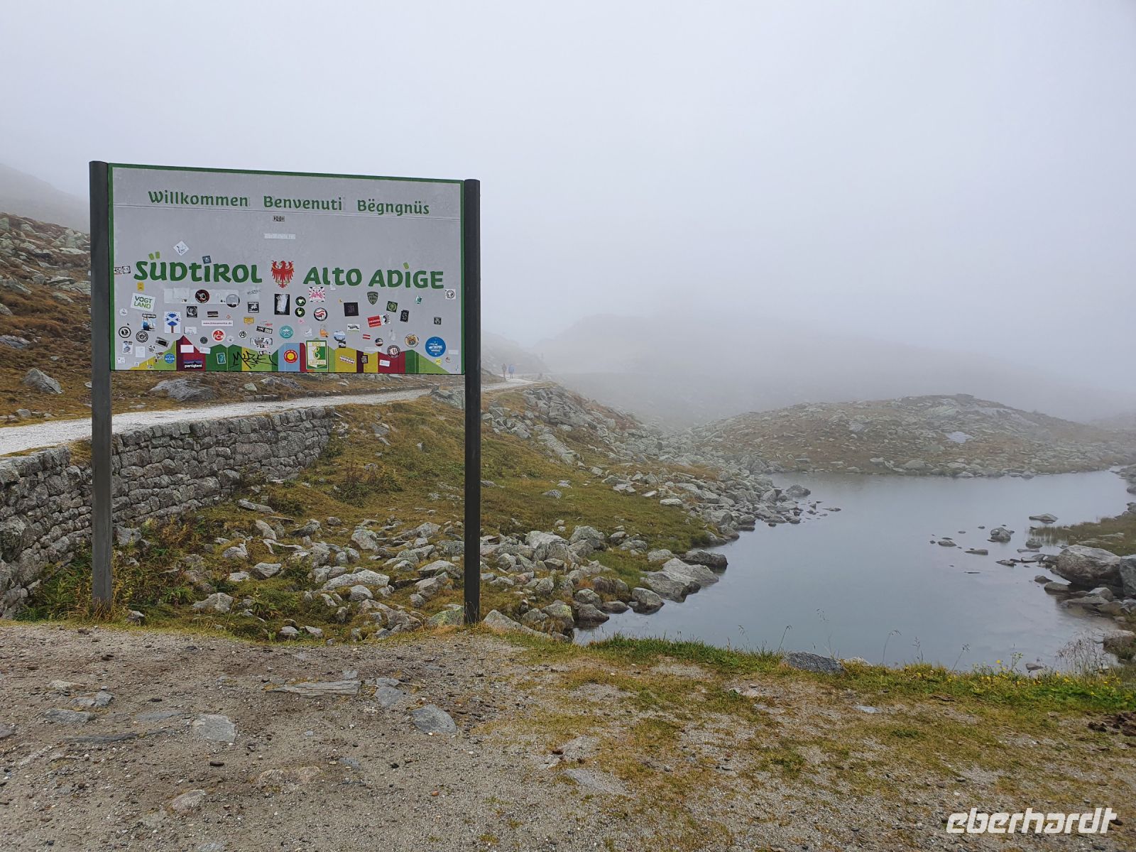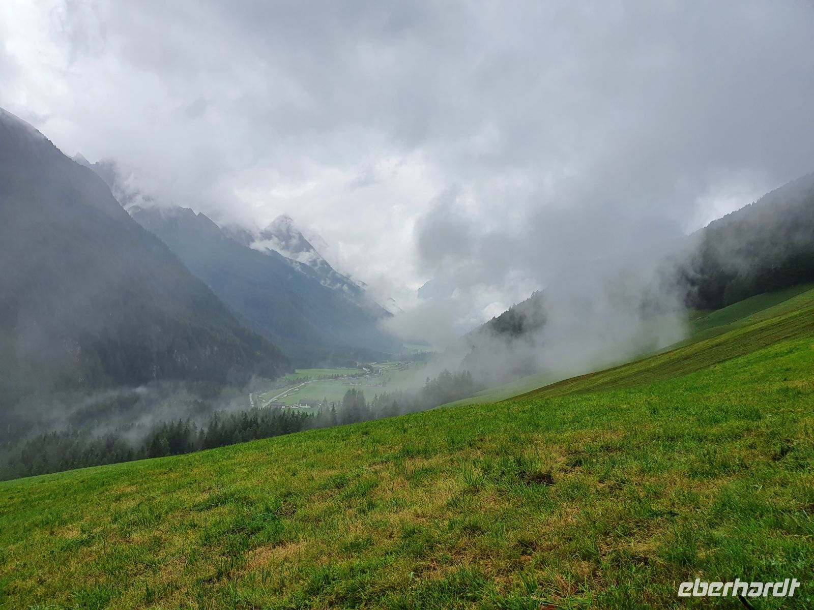 Noch einmal konnten wir das individuell für unsere Gruppe zubereitete Frühstück im Hotel Maria Theresia geniessen und dann holten uns 2 Taxis ab und brachten uns hinauf zum Schlegeisspeicher. 2 Wanderer fuhren mit unserem Gepäck hinüber nach Südtirol. Am Schlegeisspeicher hingen die Wolken ganz tief und es regnete. So zogen wir unsere Regenkleidung an, spannten die Schirme auf und los gings zunächst noch am Ufer des Schlegeisspeichers entlang und weiter im Flusstal immer bergan. Kurz vor dem Aufstieg zur Lavitzalm liess der Regen nach und wir nutzten die Zeit zum Fotografieren. Vor der Alm hiess es, sich durch eine Kuhherde zu bewegen und dann kam ein steiler Anstieg auf einem Plattenweg aus Natursteinen hinauf zu Alm. Wir kehrten nicht ein, sondern gingen zügig weiter durch ein Flusstal und dann wieder steil bergan bis zur Grenze Österreich - Italien. Am Grenzstein wurde wieder fleißig fotografiert und nun war es nicht mehr weit bis zum Pfitscher Joch Haus. Allerdings sahen wir das Gebäude erst, als wir kurz davor standen weil die Wolken so tief hingen. Im Pfitscher Joch Haus war es schön warm und gemütlich. So konnten wir die nasse Kleidung ablegen und trocknen und uns mit südtiroler Gerichten stärken. Seit 1888 ist diese Alm ununterbrochen in Familienbesitz und das spürt man auch an der Gastlichkeit der Familie. Nach einer Stunde brachen wir auf und begannen den langen, steilen Abstieg hinunter ins Pfitschtal. Wir entschlossen uns, doch den kurzen und steilen Weg zu nehmen und wir wurden belohnt, denn nach wenigen Metern rissen die Wolken ein wenig auf und gaben den Blick frei ins Tal. Auch ließ der Regen nach und so machte der Abstieg richtig Freude. Leider verstauchte sich im unteren Teil des Weges eine Wanderfreundin den Fuß und so kamen wir nur noch langsam voran und erreichten den geplanten 15.10 Uhr Bus nicht mehr. So wanderte der Großteil der Gruppe weiter bis zu unserem Hotel und ich wartete mit der Verletzten auf den nächsten Bus. Im Hotel Kranebitt in Kematen waren wir dann zum checkin alle wieder vereint. Das Abendessen war sehr schmackhaft und für unseren letzten Wandertag sagte die App wieder Sonnenschein voraus. So konnten wir ganz entspannt ins Bett gehen und uns auf den letzten Wandertag freuen.