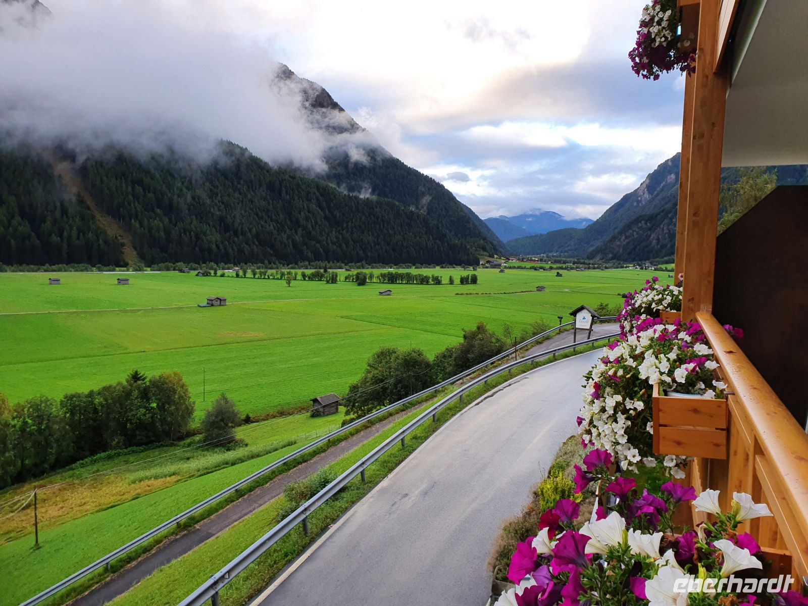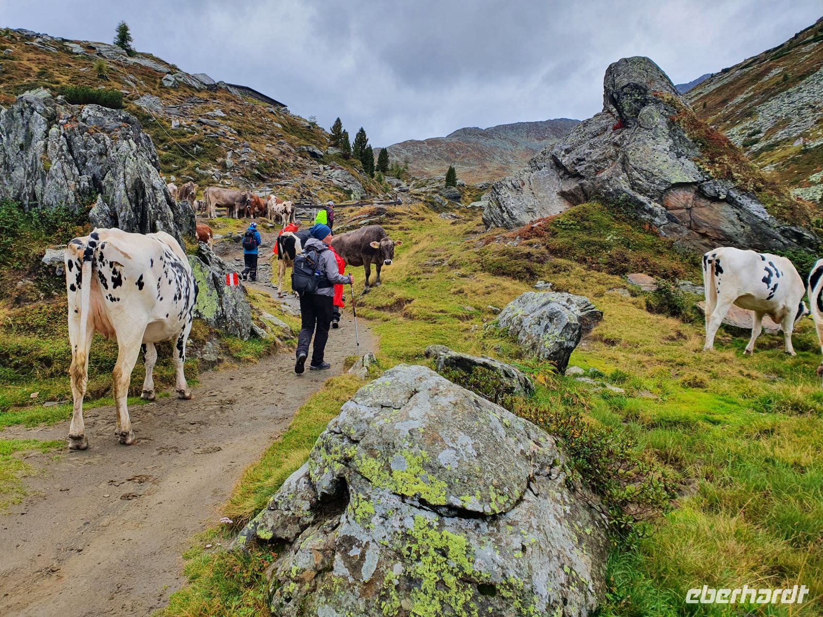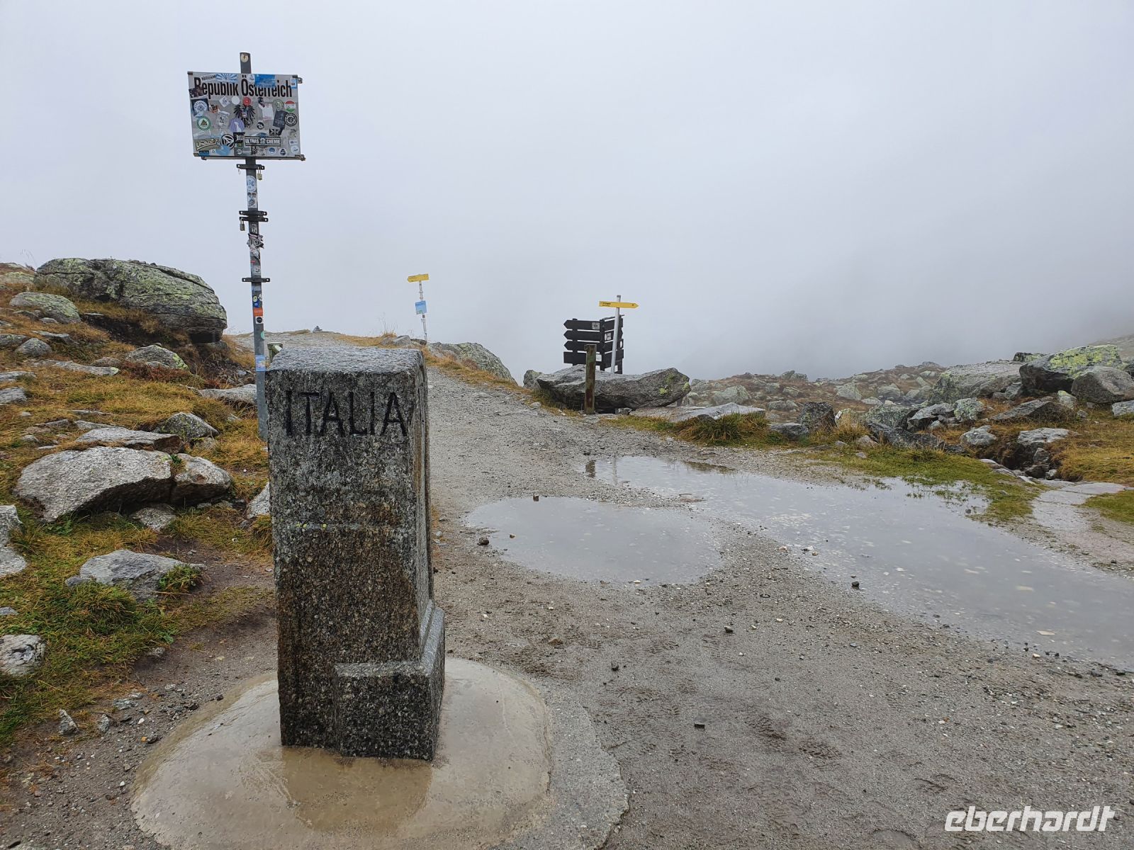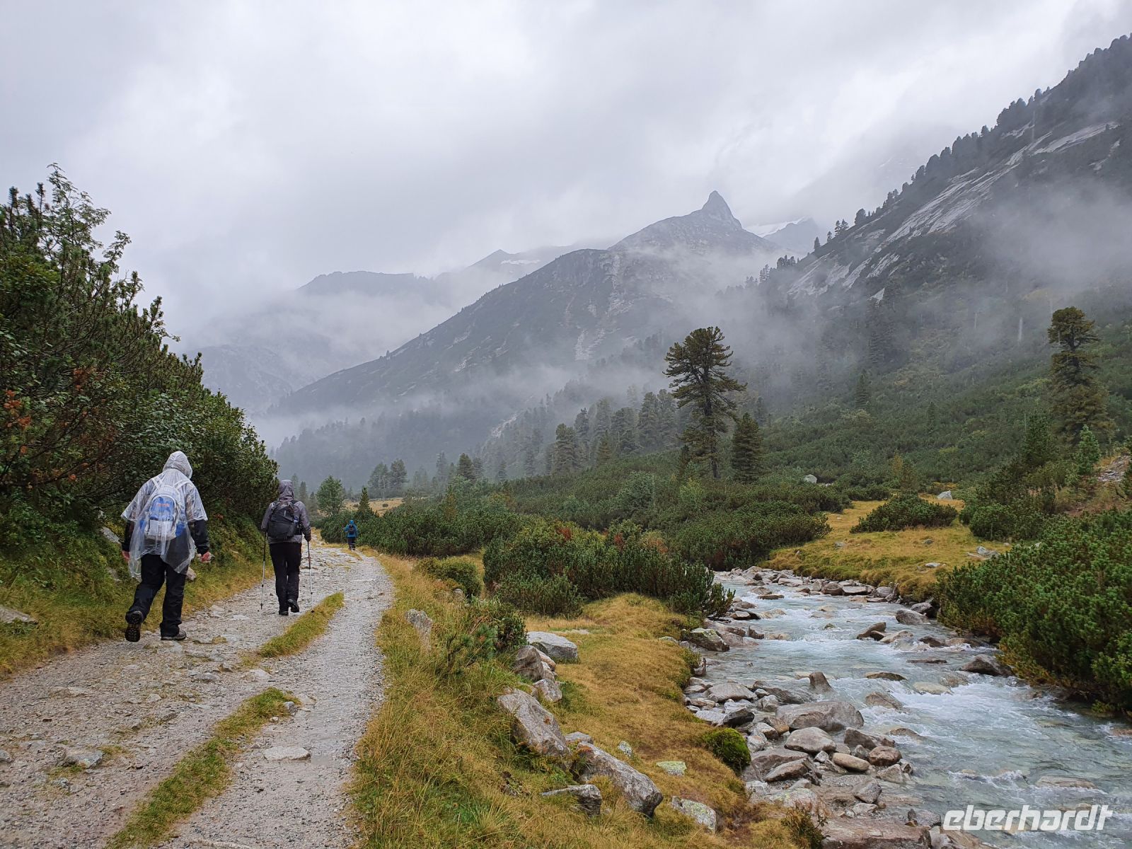 Noch einmal konnten wir das individuell für unsere Gruppe zubereitete Frühstück im Hotel Maria Theresia geniessen und dann holten uns 2 Taxis ab und brachten uns hinauf zum Schlegeisspeicher. 2 Wanderer fuhren mit unserem Gepäck hinüber nach Südtirol. Am Schlegeisspeicher hingen die Wolken ganz tief und es regnete. So zogen wir unsere Regenkleidung an, spannten die Schirme auf und los gings zunächst noch am Ufer des Schlegeisspeichers entlang und weiter im Flusstal immer bergan. Kurz vor dem Aufstieg zur Lavitzalm liess der Regen nach und wir nutzten die Zeit zum Fotografieren. Vor der Alm hiess es, sich durch eine Kuhherde zu bewegen und dann kam ein steiler Anstieg auf einem Plattenweg aus Natursteinen hinauf zu Alm. Wir kehrten nicht ein, sondern gingen zügig weiter durch ein Flusstal und dann wieder steil bergan bis zur Grenze Österreich - Italien. Am Grenzstein wurde wieder fleißig fotografiert und nun war es nicht mehr weit bis zum Pfitscher Joch Haus. Allerdings sahen wir das Gebäude erst, als wir kurz davor standen weil die Wolken so tief hingen. Im Pfitscher Joch Haus war es schön warm und gemütlich. So konnten wir die nasse Kleidung ablegen und trocknen und uns mit südtiroler Gerichten stärken. Seit 1888 ist diese Alm ununterbrochen in Familienbesitz und das spürt man auch an der Gastlichkeit der Familie. Nach einer Stunde brachen wir auf und begannen den langen, steilen Abstieg hinunter ins Pfitschtal. Wir entschlossen uns, doch den kurzen und steilen Weg zu nehmen und wir wurden belohnt, denn nach wenigen Metern rissen die Wolken ein wenig auf und gaben den Blick frei ins Tal. Auch ließ der Regen nach und so machte der Abstieg richtig Freude. Leider verstauchte sich im unteren Teil des Weges eine Wanderfreundin den Fuß und so kamen wir nur noch langsam voran und erreichten den geplanten 15.10 Uhr Bus nicht mehr. So wanderte der Großteil der Gruppe weiter bis zu unserem Hotel und ich wartete mit der Verletzten auf den nächsten Bus. Im Hotel Kranebitt in Kematen waren wir dann zum checkin alle wieder vereint. Das Abendessen war sehr schmackhaft und für unseren letzten Wandertag sagte die App wieder Sonnenschein voraus. So konnten wir ganz entspannt ins Bett gehen und uns auf den letzten Wandertag freuen.