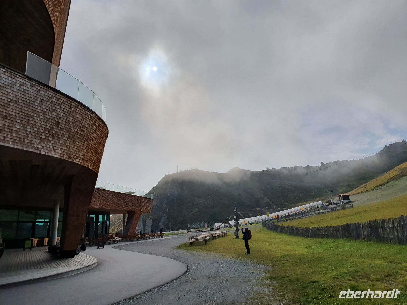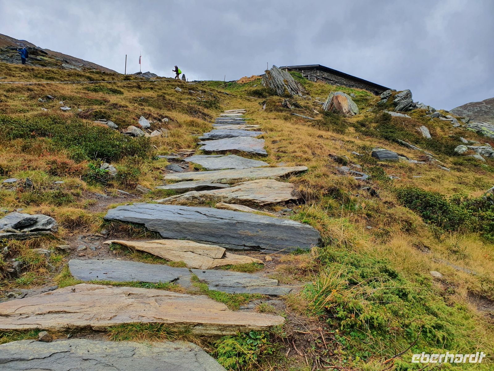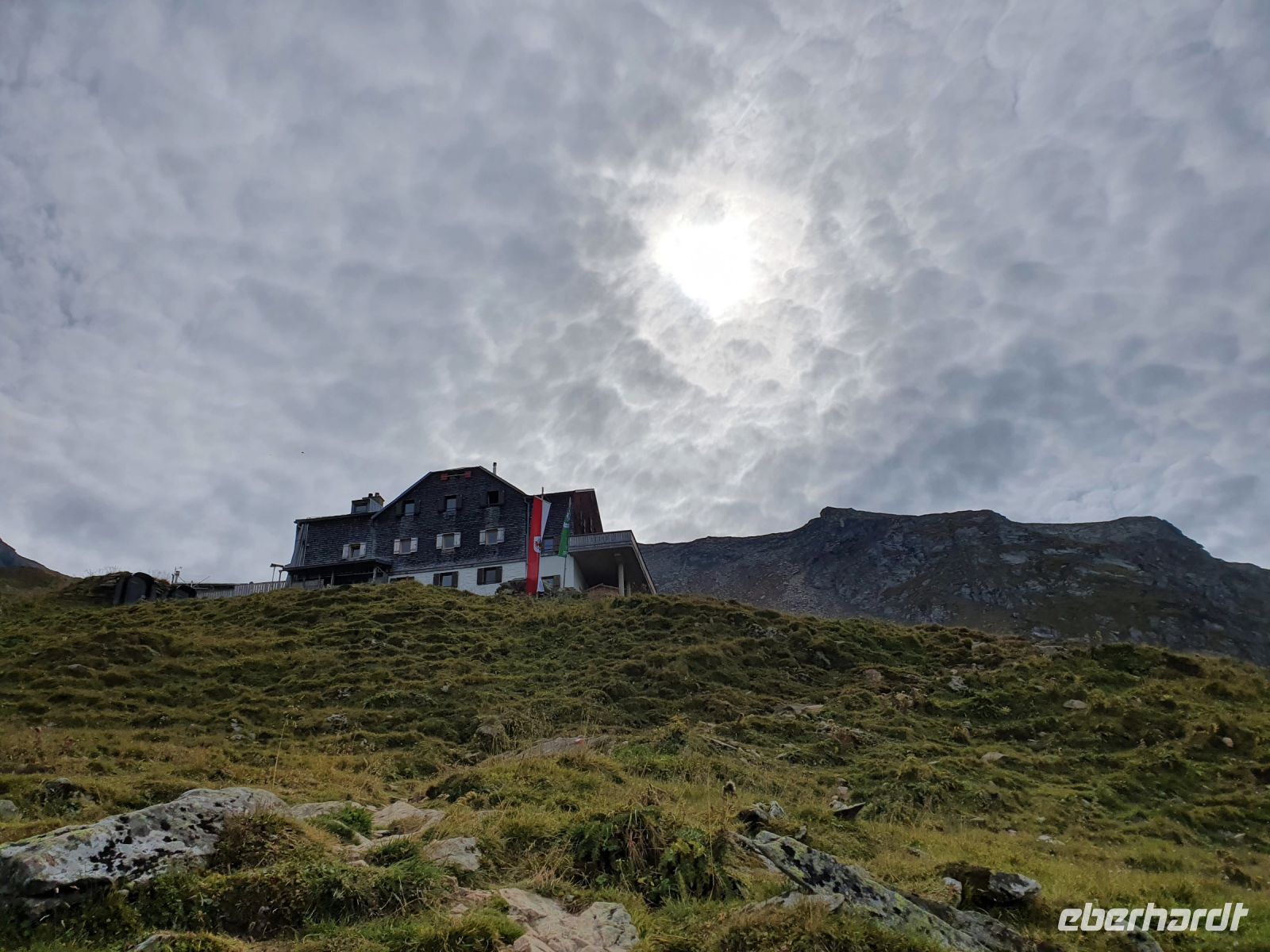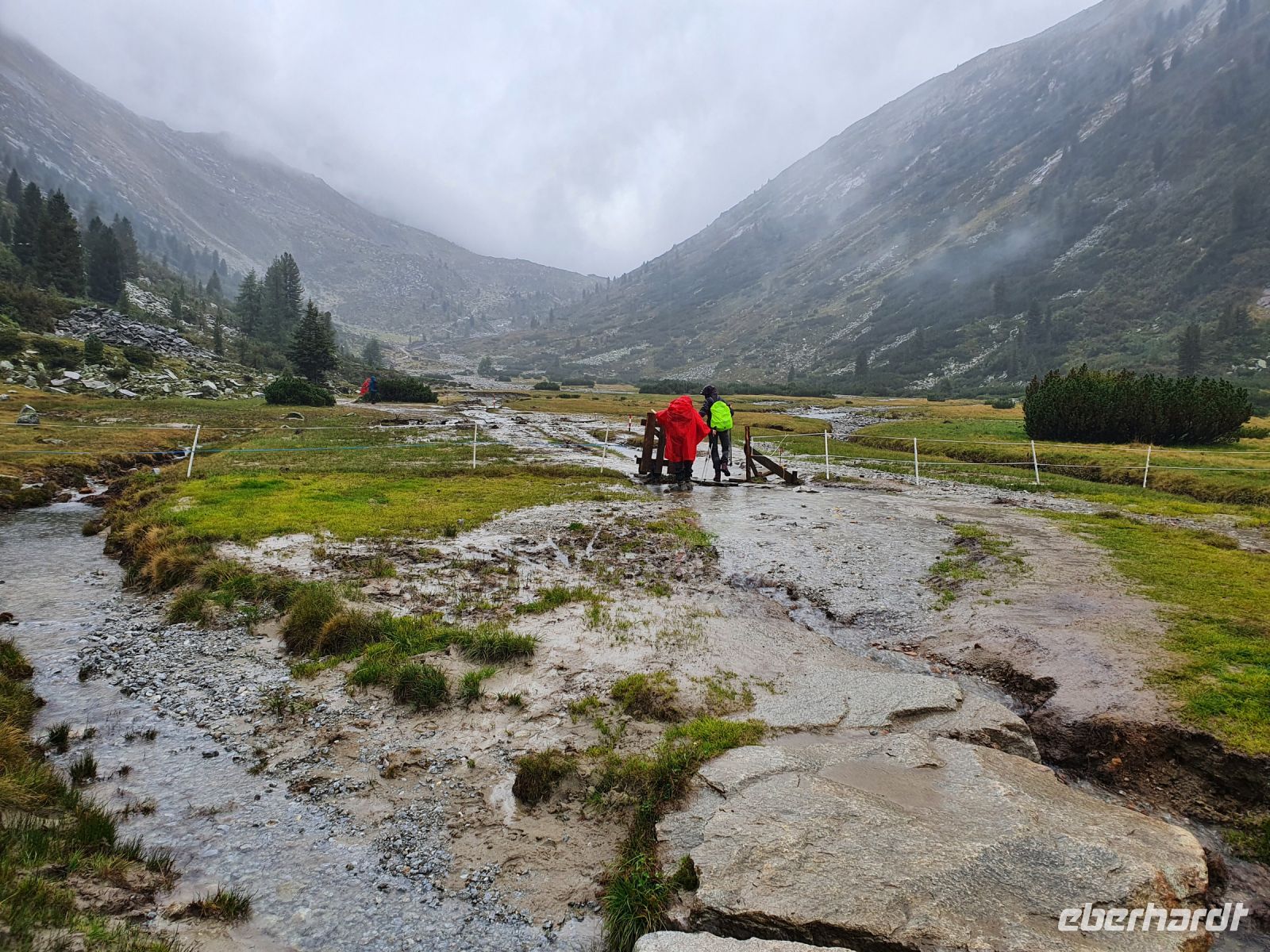 Noch einmal konnten wir das individuell für unsere Gruppe zubereitete Frühstück im Hotel Maria Theresia geniessen und dann holten uns 2 Taxis ab und brachten uns hinauf zum Schlegeisspeicher. 2 Wanderer fuhren mit unserem Gepäck hinüber nach Südtirol. Am Schlegeisspeicher hingen die Wolken ganz tief und es regnete. So zogen wir unsere Regenkleidung an, spannten die Schirme auf und los gings zunächst noch am Ufer des Schlegeisspeichers entlang und weiter im Flusstal immer bergan. Kurz vor dem Aufstieg zur Lavitzalm liess der Regen nach und wir nutzten die Zeit zum Fotografieren. Vor der Alm hiess es, sich durch eine Kuhherde zu bewegen und dann kam ein steiler Anstieg auf einem Plattenweg aus Natursteinen hinauf zu Alm. Wir kehrten nicht ein, sondern gingen zügig weiter durch ein Flusstal und dann wieder steil bergan bis zur Grenze Österreich - Italien. Am Grenzstein wurde wieder fleißig fotografiert und nun war es nicht mehr weit bis zum Pfitscher Joch Haus. Allerdings sahen wir das Gebäude erst, als wir kurz davor standen weil die Wolken so tief hingen. Im Pfitscher Joch Haus war es schön warm und gemütlich. So konnten wir die nasse Kleidung ablegen und trocknen und uns mit südtiroler Gerichten stärken. Seit 1888 ist diese Alm ununterbrochen in Familienbesitz und das spürt man auch an der Gastlichkeit der Familie. Nach einer Stunde brachen wir auf und begannen den langen, steilen Abstieg hinunter ins Pfitschtal. Wir entschlossen uns, doch den kurzen und steilen Weg zu nehmen und wir wurden belohnt, denn nach wenigen Metern rissen die Wolken ein wenig auf und gaben den Blick frei ins Tal. Auch ließ der Regen nach und so machte der Abstieg richtig Freude. Leider verstauchte sich im unteren Teil des Weges eine Wanderfreundin den Fuß und so kamen wir nur noch langsam voran und erreichten den geplanten 15.10 Uhr Bus nicht mehr. So wanderte der Großteil der Gruppe weiter bis zu unserem Hotel und ich wartete mit der Verletzten auf den nächsten Bus. Im Hotel Kranebitt in Kematen waren wir dann zum checkin alle wieder vereint. Das Abendessen war sehr schmackhaft und für unseren letzten Wandertag sagte die App wieder Sonnenschein voraus. So konnten wir ganz entspannt ins Bett gehen und uns auf den letzten Wandertag freuen.