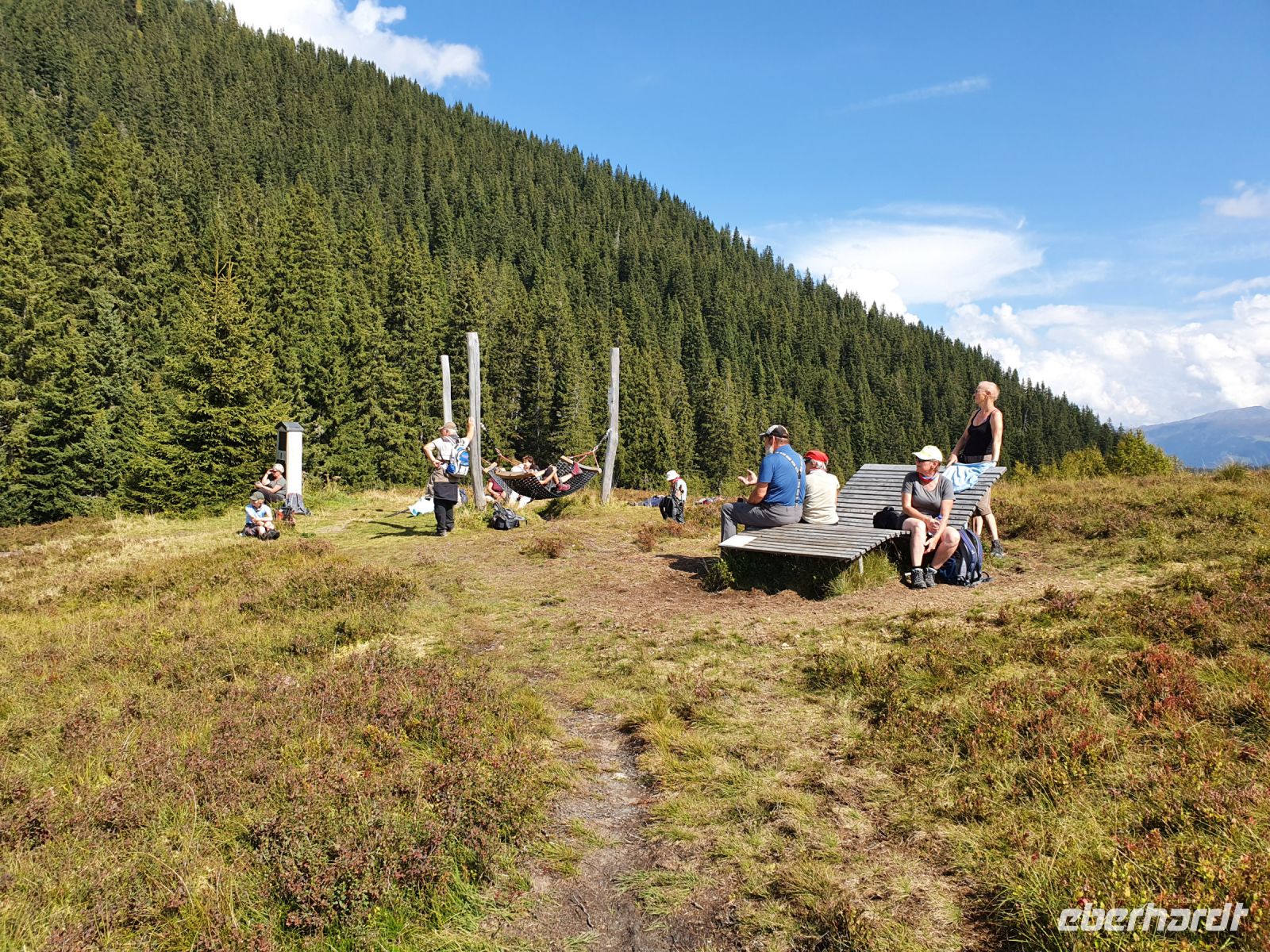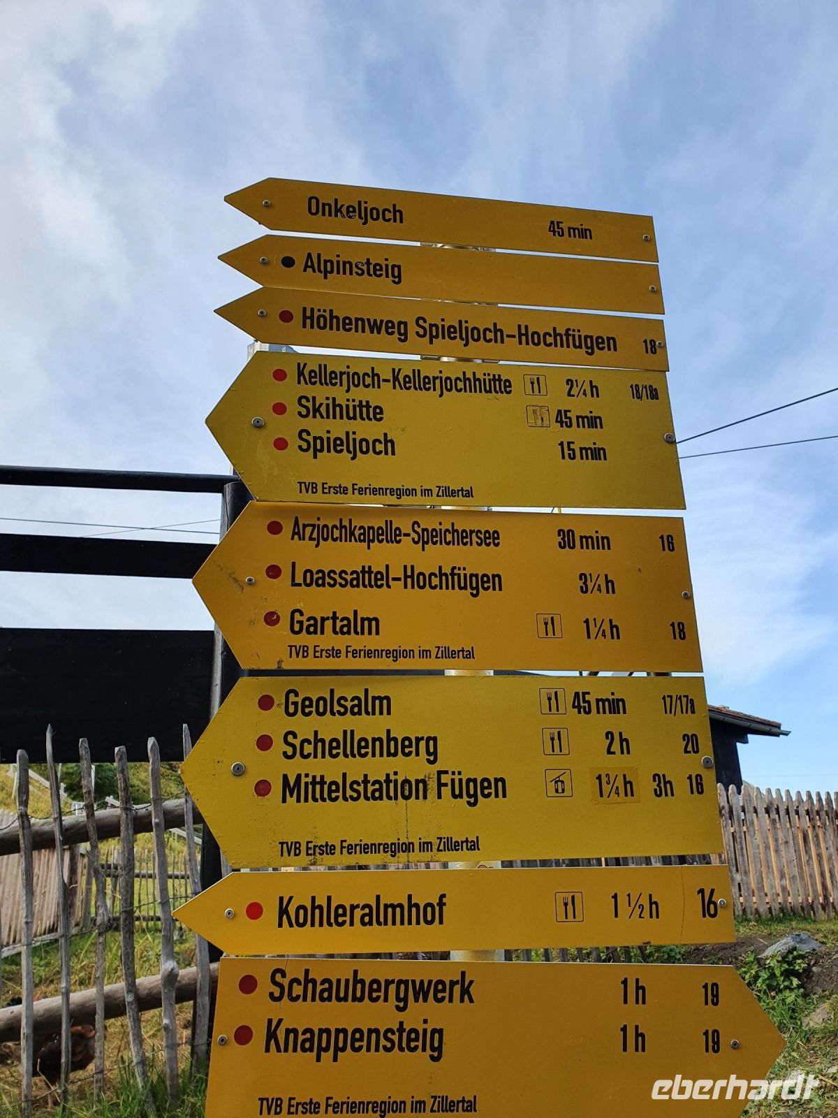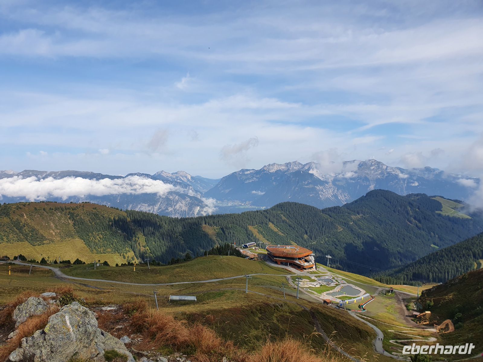 Gut gestärkt liefen wir nach dem Frühstück das kurze Stück zur Spieljochseilbahn und fuhren hinauf auf 1860 m Höhe. Dort begannen wir unsere Wanderung zunächst auf den Gipfel des Spieljochs. 2 Gäste gingen dann den Familienwanderweg bis zur Gartalm und alle anderen nahmen den Weg über den schroffen Grat bis hinauf auf das Onkeljoch in 2066 m Höhe. Da oben standen wir vor dem Kellerjoch mit der kleinen Bergkapelle dahinter und bei dem grandiosen Anblick kam der Wunsch auf, auch gleich noch über das doppelgipfliche Kellerjoch ( 2344 m ) zu wandern. Aber das hätte unseren Tagesplan gesprengt und es wäre keine Zeit mehr für den traumhaft schönen Wellnessbereich im Hotel Lamark geblieben. So liefen wir auf dem Höhenweg weiter in Richtung Gartalm. Schon bald kam die Gartalm unter unserem Weg in Sicht und dann standen viele Serpentinen nach unten an bis wir die Gartalm erreichten. Unterwegs sahen einige Gäste ein Kreuzotter und die Wirtin der Alm berichtete uns später, dass es dort recht viele gibt. An der Gartalm besuchten wir zuerst das "Honighaus" mit dem Denkmal für Bär Bruno und danach liessen wir uns die Leckereien schmecken. Der Wirt erzählte uns recht ausführlich, was sich mit Bruno auf seiner Alm so zugetragen hatte. Nach der ausgiebigen Rast verlief unser Weg immer am Berghang entlang mit vielen Blaubeeren und Preiselbeeren. Das verlockte immer wieder zum naschen. Später liefen wir auf einem wurzelreichen Weg durch den Wald, über sumpfige Wiesen und schliesslich kamen wir zum Loassattel. Von dort blickt man nach Innsbruck und auf die Nordkette und am Wegesrand gibt es eine Relaxzone mit Bank und Hängematten. Das war Anlass, nochmal eine Pause einzulegen. Der weitere Weg nach Hochfügen ist breit und wir kamen gut voran. Schon 15 Uhr erreichten wir den Ort und unser Hotel und so blieb noch viel Zeit zum Ausruhen und zum Nutzen der Sauna und des Schwimmbades. Unser Abendessen, bestehend aus 5 Gängen, passte gut zum Bergfest und war sehr schmackhaft. Im Hotel Lamark kocht der österreichische Fernsehkoch Alexander Fankhauser.