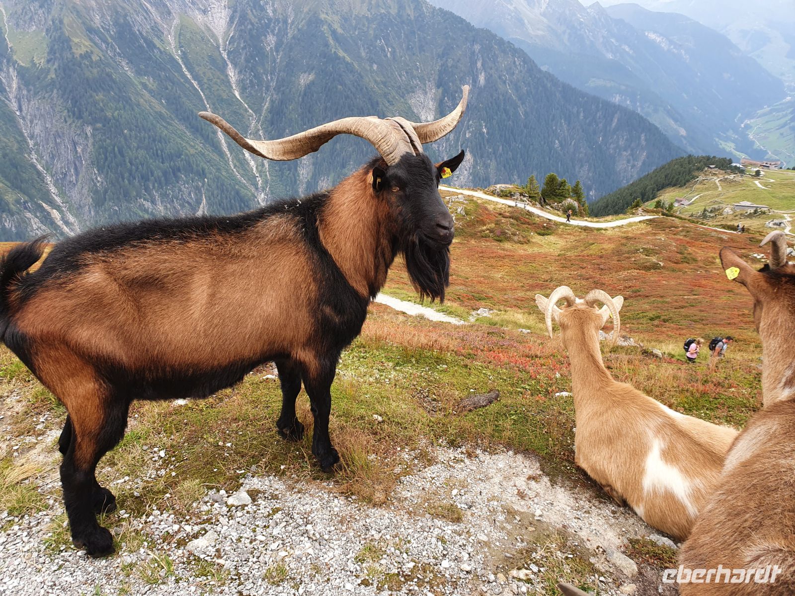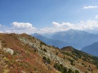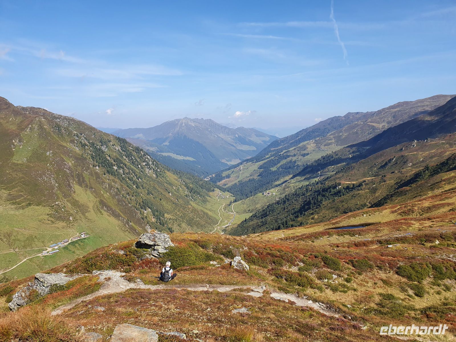 Nach einem fantastischen Frühstück begann unsere Wanderung direkt am Hotel Lamark. Auf einem breiten Fahrweg wanderten wir immer bergan bis zur Pfundsalm, wo gerade die gute Heumilch vom Milchtankwagen abgeholt wurde. Weiter oben dann trafen wir auf eine Ziegenherde, die noch am Wegesrand ruhte, sich dann aber unserer Wandergruppe anschloss, mit uns den Bach überquerte und sehr anhänglich war. Die Ziegen ließen sich gern streicheln und waren regelrecht verschmust. Unser Weg wurde nun schmaler und ging im Zickzack steil bergan. Weit oben war der Grat schon zu erkennen. Der Blick zurück ins Tal liess uns die Tour vom Vortag nochmals verfolgen und die Hotelsiedlung von Hochfügen betrachten. Dann endlich erreichten wir das Sidanjoch und sahen zum erstenmal den Alpenhauptkamm vor uns. Oben am Joch gab es noch viele Blaubeeren und Preiselbeeren und deren Laub färbte sich schon herbstlich rotbraun. Ein Stück unter dem Joch lag die Rastkogelhütte und dorthin wanderten wir und machten unsere Mittagspause. Gut ausgeruht und gestärkt ging es nun steil bergan zum Kreuzjoch auf 2336 m Höhe und somit zum höchsten Punkt unserer Alpenüberquerung. Über den Mitterwandskopf, den Rauhenkopf und den Abiskopf gelangten wir auf einem traumhaften Panoramaweg hinunter zum Melchboden, wo unsere heutige Wanderung endete. Wir kehrten ein auf der sonnigen Terrasse und genossen einen Kaffee, ein Bier usw. Dann holten uns 2 Taxis ab und brachten uns auf der kurvenreichen Mautstrasse hinunter ins Zillertal nach Hippach und weiter am Ziller entlang nach Mayrhofen in unser Hotel Maria Theresia. Zum Abendessen liefen wir durch Mayrhofen zum Hotel Rose.