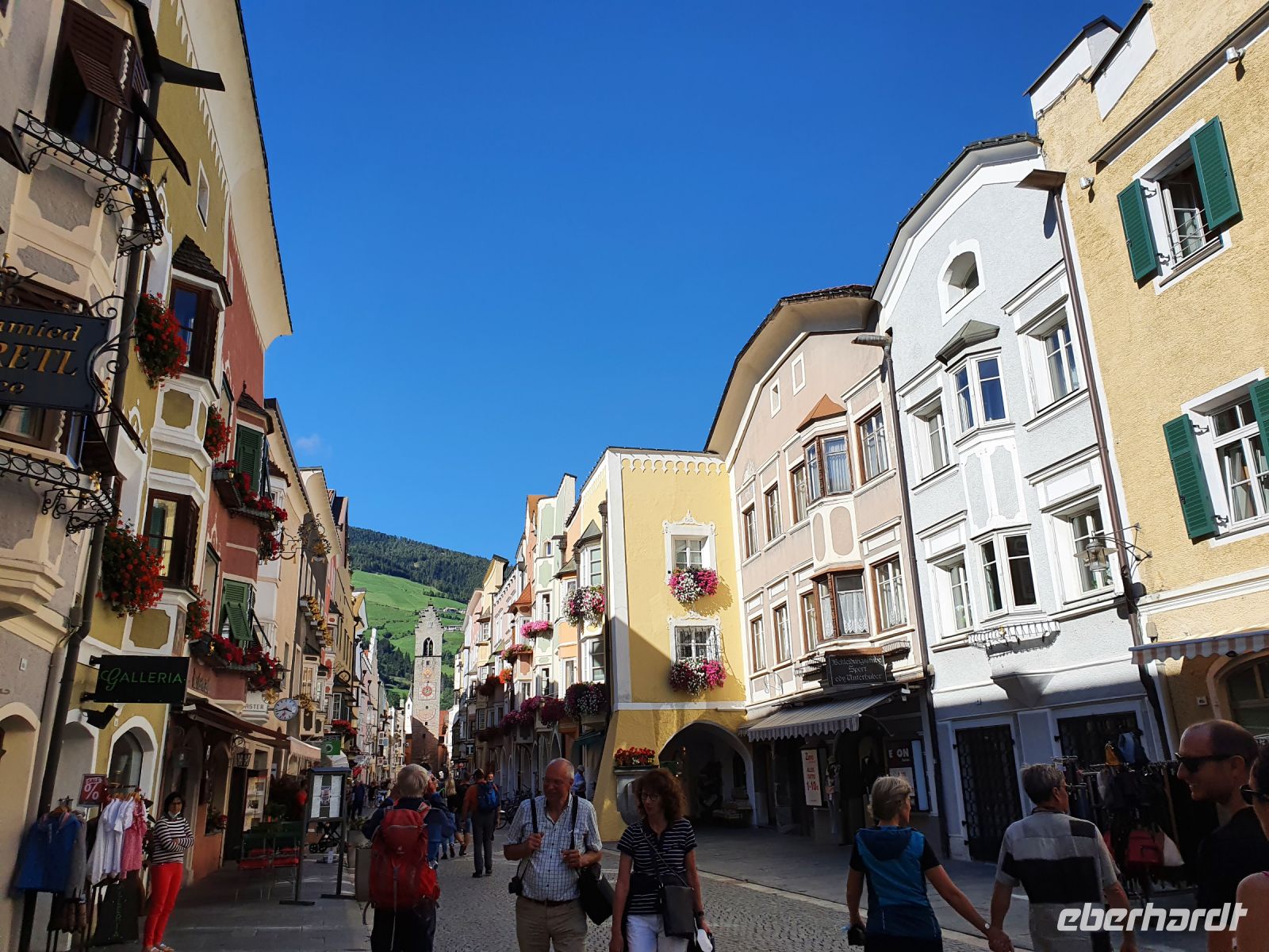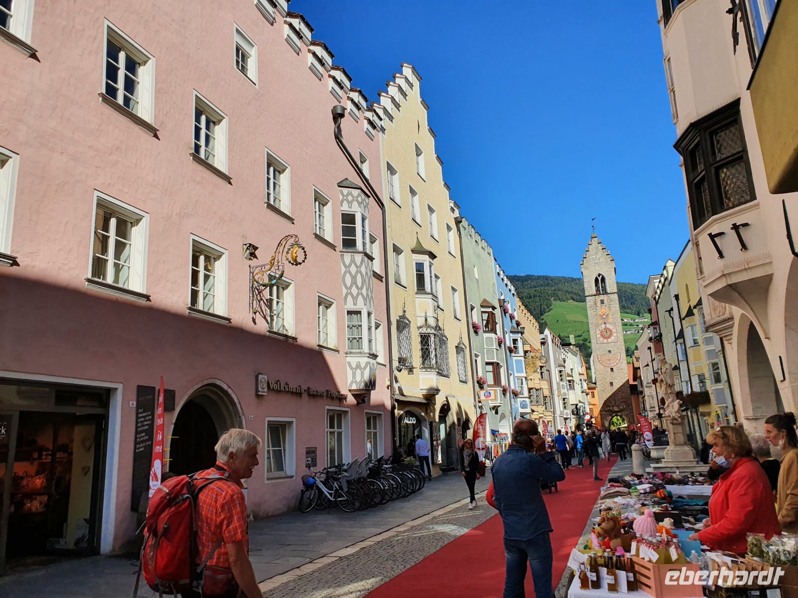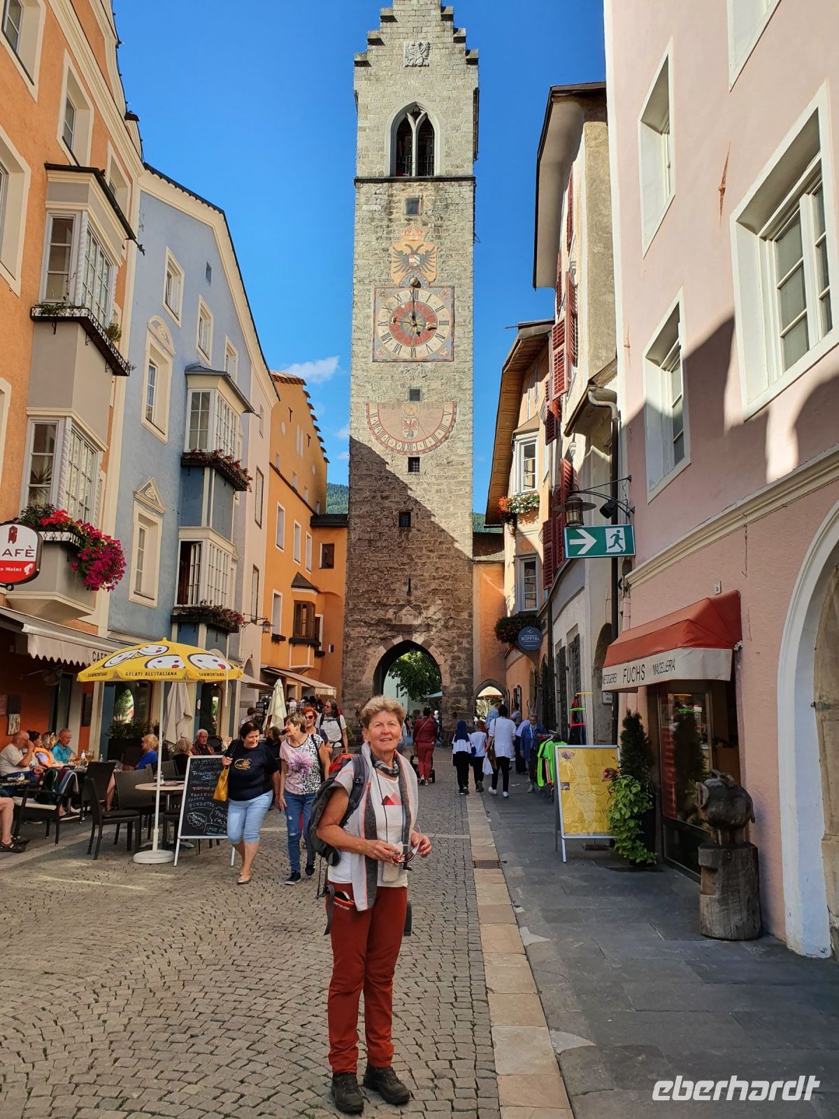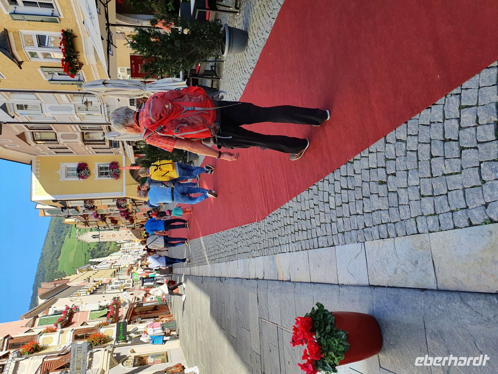 Ganz entspannt nahmen wir unser letztes gemeinsames Frühstück wieder in der kleinen Stube ein, brachten unsere Koffer nach unten und gingen dann mit einer Wanderfreundin zum Bahnhof, denn sie reiste wieder mit der Bahn . Ein schöner Spaziergang führte uns weiter zum Brixener Tor in Sterzing und ab dort war schon der rote Tepich für die Touristen ausgerollt. Es gab viele Verkaufsstände von verschiedenen Vereinen und es waren sehr viele Menschen unterwegs. Wir erledigten die letzten Einkäufe und schlenderten danach wieder hinauf zum Hotel Sonnenheim. Gegen Mittag holte uns ein Kleinbus ab und brachte uns nach Österreich zum Wipptaler Hof an der Brenner Autobahn. Kurz darauf traf der Eberhardt Bus ein und die Gäste stiegen um in Kleinbusse zum Gardasee und unsere Gruppe fuhr zusammen mit den Eberhardt Urlaubsgäste vom Gardasee und aus dem Stubaital nach Hause. Es herrschte ein starker Rückreiseverkehr und so kamen wir nicht ganz zügig voran. Auch waren die Parkplätze mit LKW überbelegt und unsere Fahrer hatten Mühe, einen Busparkplatz zu finden. So erreichten wir alle mit etwas Verspätung unsere Ausstiegsstellen.