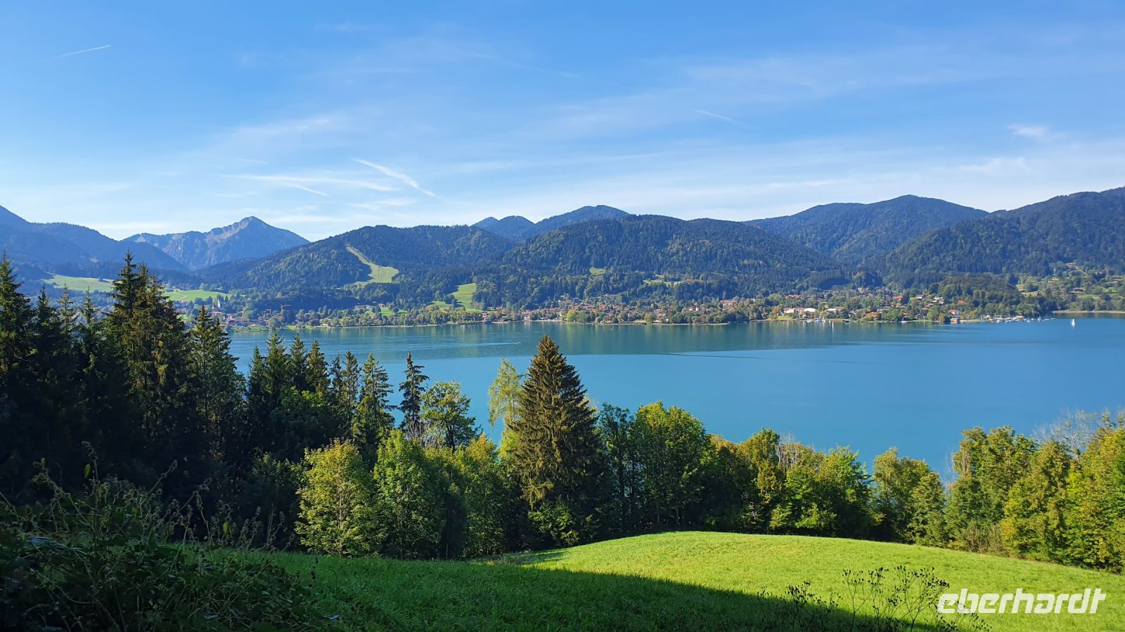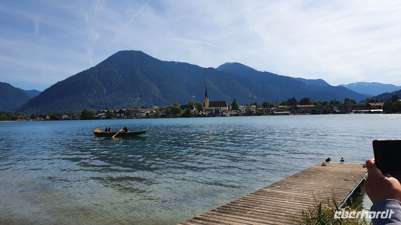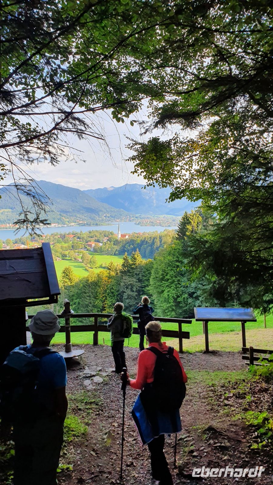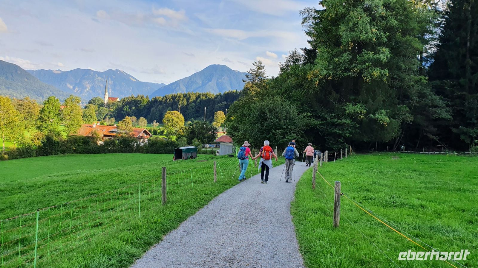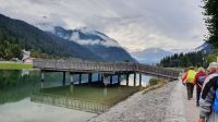 Die meisten Gäste unserer Wandergruppe nutzten für die An- und Abreise den Urlauber Pendel Bus von Eberhardt Travel. Wir wurden direkt zum Hotel Terrassenhof in Bad Wiessee gebracht und konnten so den Nachmittag schon für einen ersten Rundgang entlang des Tegernsees nutzen. Bei Sonnenschein und guter Sicht spazierten wir bis nach Alt Wiessee, wo es noch mitten im Kurort alte Bauernhöfe mit ihren Tieren auf der Weide gibt. Auch die Maria Himmelfahrts Kirche auf einem Hügel besuchten wir und auf dem Rückweg kehrten wir im Eis Cafe San Marco ein. Unterwegs trafen wir die beiden individuell angereisten Gäste und ein ganz mutiger Herr unserer Gruppe ging schwimmen im Tegernsee. Zum Abendessen trafen wir uns wieder im Quirin Stüberl unseres Hotels und genossen unser zuvor ausgewähltes 3-Gang-Menue. Danach gab es umfassende Informationen zu den einzelnen Etappen unserer Alpenüberquerung und bei einem Glas Wein machten wir uns untereinander bekannt. Nun konnte es losgehen !