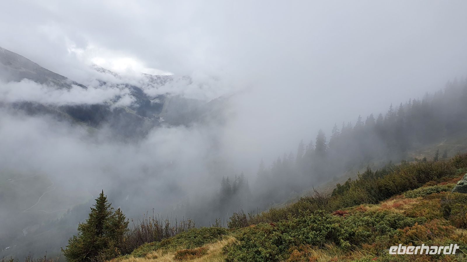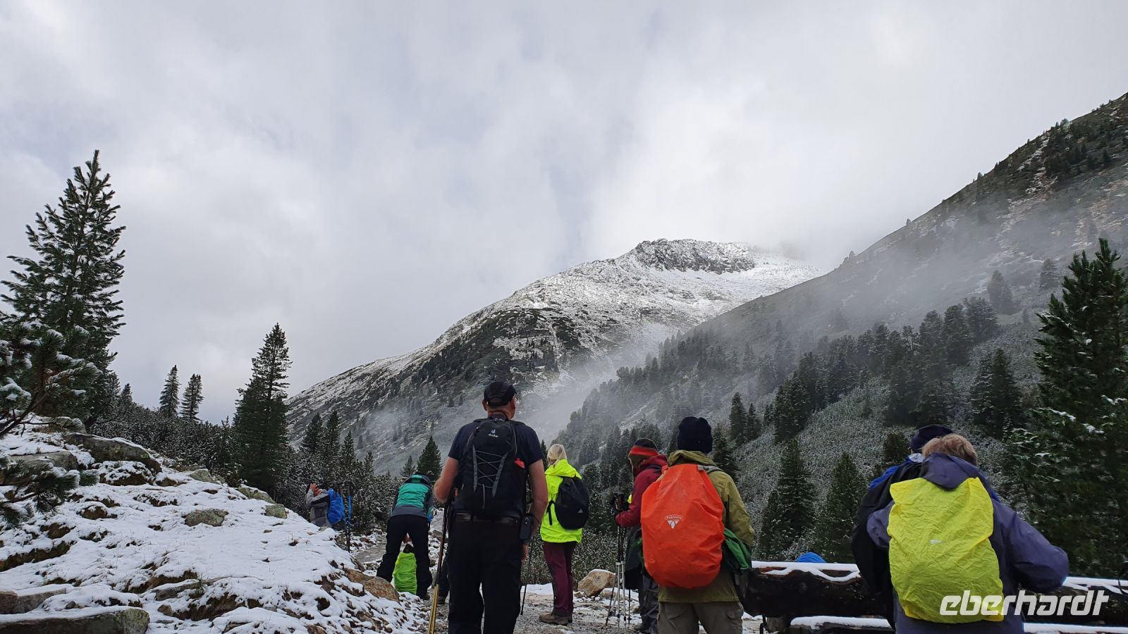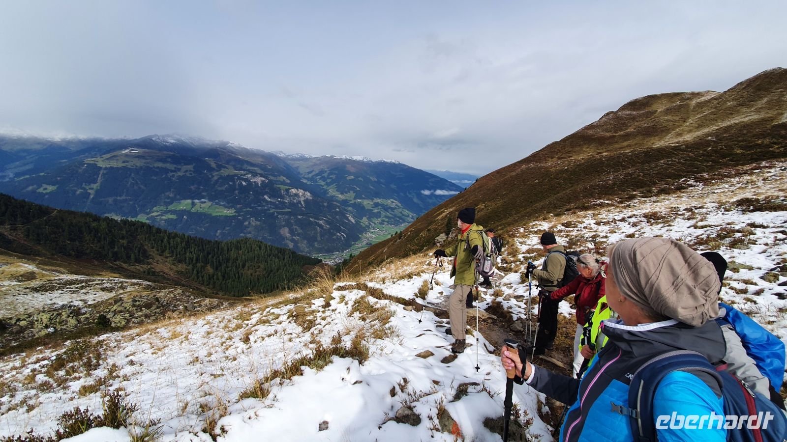 Auch heute gab es wieder ein sehr gutes Frühstück und so machten wir uns gut gestärkt auf den Weg durch Fügen hinauf zur Talstation der Spieljochbahn. Wir waren 9 Uhr die ersten Gäste, die hinauf schweben durften. Leider empfingen uns oben tiefhängende Wolken und es war recht frisch auf 1862 m Höhe. Wir begannen dennoch unsere Wanderung in Richtung Onkeljoch, auch wenn wirklich nichts zu sehen war. Auf dem breiten Weg kamen wir gut voran, liessen den Spieljochgipfel links liegen und erreichten schliesslich das Onkeljoch. Plötzlich rissen die Wolken kurz auf und das Kellerjoch unmittelbar vor uns war kurz zu sehen. Schneefall setzte ein, wir legten unsere Regenkleidung an und stiegen ab zum Ü Wanderweg. Der Weg war von Regen und Schnee recht matschig und es brauchte unsere volle Aufmerksamkeit, um nicht auszurutschen. Im ständigen auf und ab gab es immer mal wieder gute Aussichten und schliesslich wurde der Weg breiter und führte in Serpentinen hinunter zur Gartalm. In der Gartalm kehrten wir ein und viele genossen den Kaiserschmarrn der guten Köchin. Nachdem alle ihren Stempel geholt hatten, kam der Wirt und erzählte uns die Geschichte von Bruno, dem Bären, der ihm den guten Weltmeisterhonig weggefuttert hatte. Immer wieder gab es Wolkenlücken und eine herrliche Aussicht auf die umliegenden Gipfel und im nächsten Moment verdunkelten Wolken den Himmel. Auf dem weiteren Weg bis zum Loassattel brauchte es wieder unsere volle Aufmerksamkeit, weil es sehr nass und rutschig war. Am Loassattel wurden wir mit einer 1 A Aussicht hinunter ins Inntal belohnt und nach einer kurzer Pause nahmen wir das letzte Stück unserer Wanderung bis nach Hochfügen in Angriff. Dort angekommen, wurden wir schon erwartet von der Rezeptionistin, das Einchecken ging flott und nun freuten sich alle auf das Schwimmbad und die tolle Sauna im Hotel. Zum Abendessen bekochte uns der österreichische Fernsehkoch Alexander Fankhauser und das war ein Gaumen- und Augenschmaus. Nur die Wettervorhersage für den folgenden Tag machte mir große Sorgen und ich wichtelte - wandern oder den Ruhetag vorziehen !?!?... und ich entschied mich für den Ruhetag.