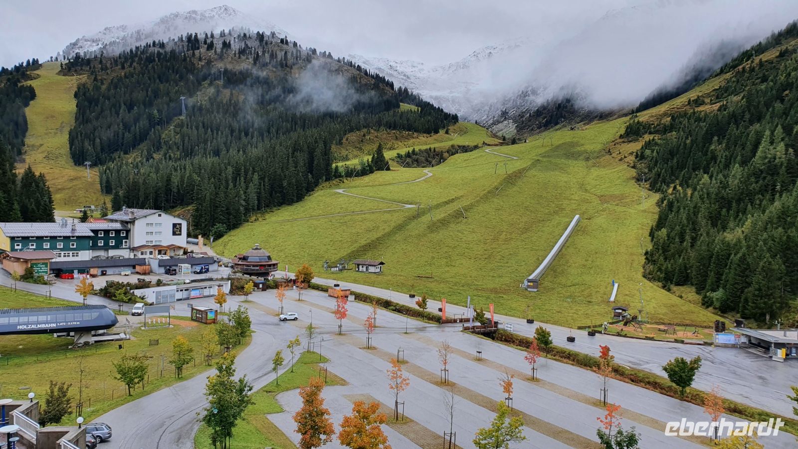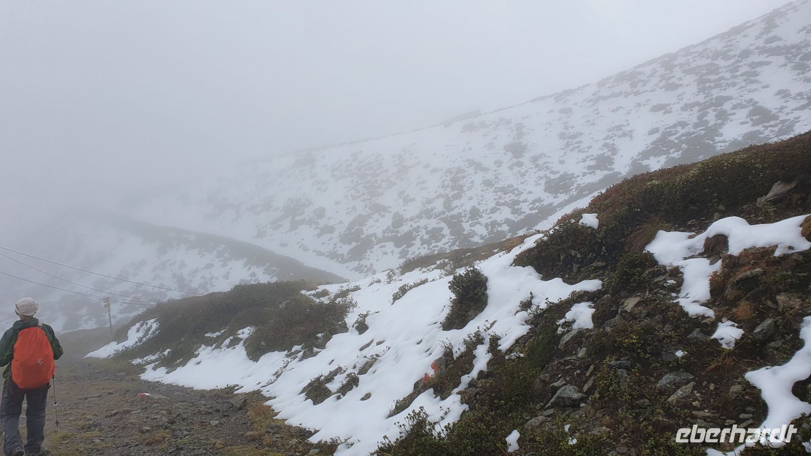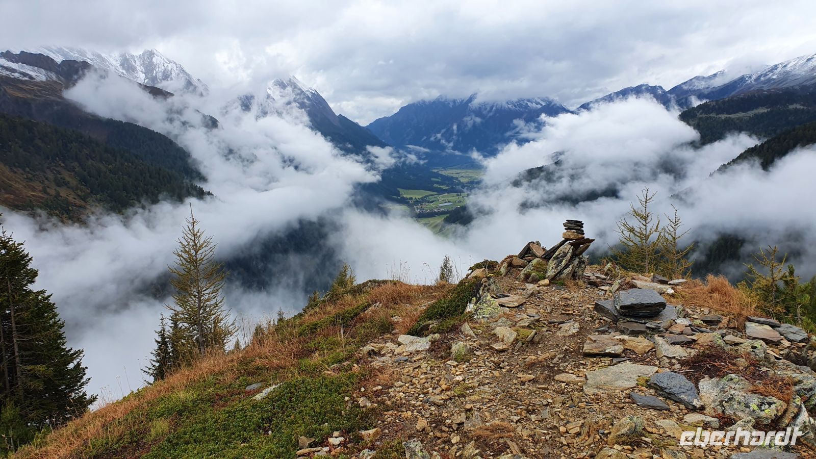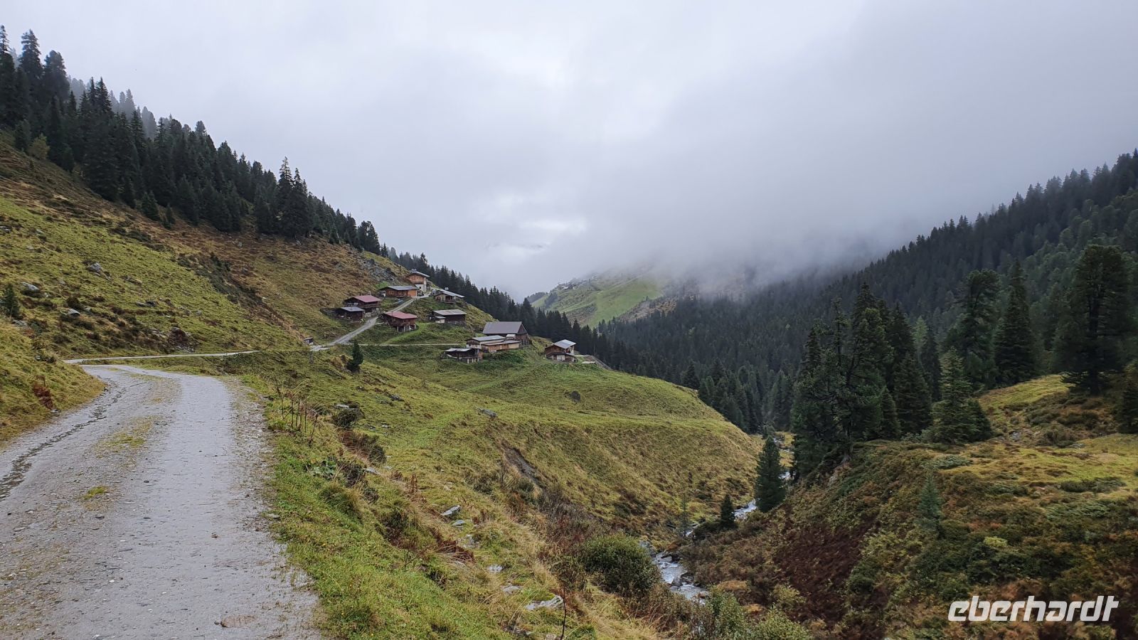 Auch heute gab es wieder ein sehr gutes Frühstück und so machten wir uns gut gestärkt auf den Weg durch Fügen hinauf zur Talstation der Spieljochbahn. Wir waren 9 Uhr die ersten Gäste, die hinauf schweben durften. Leider empfingen uns oben tiefhängende Wolken und es war recht frisch auf 1862 m Höhe. Wir begannen dennoch unsere Wanderung in Richtung Onkeljoch, auch wenn wirklich nichts zu sehen war. Auf dem breiten Weg kamen wir gut voran, liessen den Spieljochgipfel links liegen und erreichten schliesslich das Onkeljoch. Plötzlich rissen die Wolken kurz auf und das Kellerjoch unmittelbar vor uns war kurz zu sehen. Schneefall setzte ein, wir legten unsere Regenkleidung an und stiegen ab zum Ü Wanderweg. Der Weg war von Regen und Schnee recht matschig und es brauchte unsere volle Aufmerksamkeit, um nicht auszurutschen. Im ständigen auf und ab gab es immer mal wieder gute Aussichten und schliesslich wurde der Weg breiter und führte in Serpentinen hinunter zur Gartalm. In der Gartalm kehrten wir ein und viele genossen den Kaiserschmarrn der guten Köchin. Nachdem alle ihren Stempel geholt hatten, kam der Wirt und erzählte uns die Geschichte von Bruno, dem Bären, der ihm den guten Weltmeisterhonig weggefuttert hatte. Immer wieder gab es Wolkenlücken und eine herrliche Aussicht auf die umliegenden Gipfel und im nächsten Moment verdunkelten Wolken den Himmel. Auf dem weiteren Weg bis zum Loassattel brauchte es wieder unsere volle Aufmerksamkeit, weil es sehr nass und rutschig war. Am Loassattel wurden wir mit einer 1 A Aussicht hinunter ins Inntal belohnt und nach einer kurzer Pause nahmen wir das letzte Stück unserer Wanderung bis nach Hochfügen in Angriff. Dort angekommen, wurden wir schon erwartet von der Rezeptionistin, das Einchecken ging flott und nun freuten sich alle auf das Schwimmbad und die tolle Sauna im Hotel. Zum Abendessen bekochte uns der österreichische Fernsehkoch Alexander Fankhauser und das war ein Gaumen- und Augenschmaus. Nur die Wettervorhersage für den folgenden Tag machte mir große Sorgen und ich wichtelte - wandern oder den Ruhetag vorziehen !?!?... und ich entschied mich für den Ruhetag.