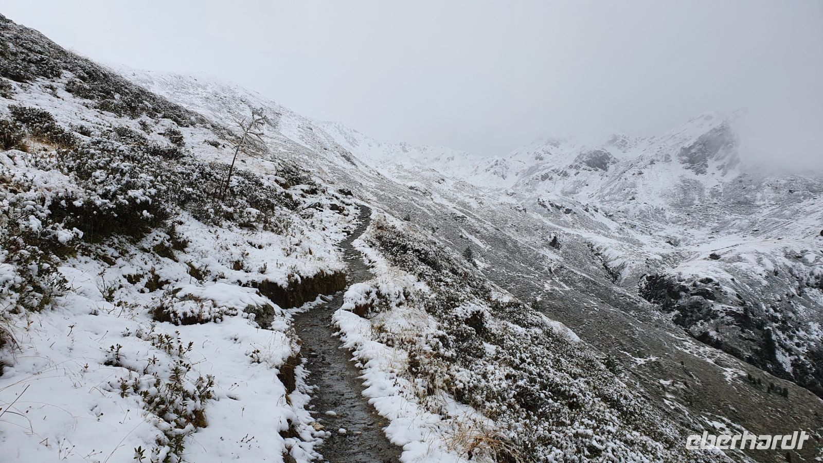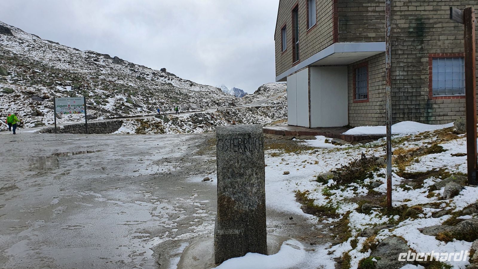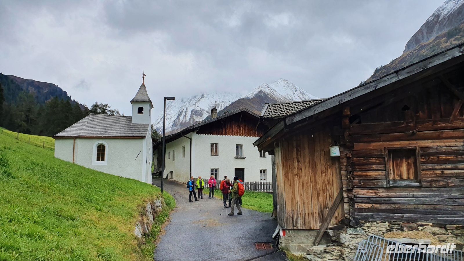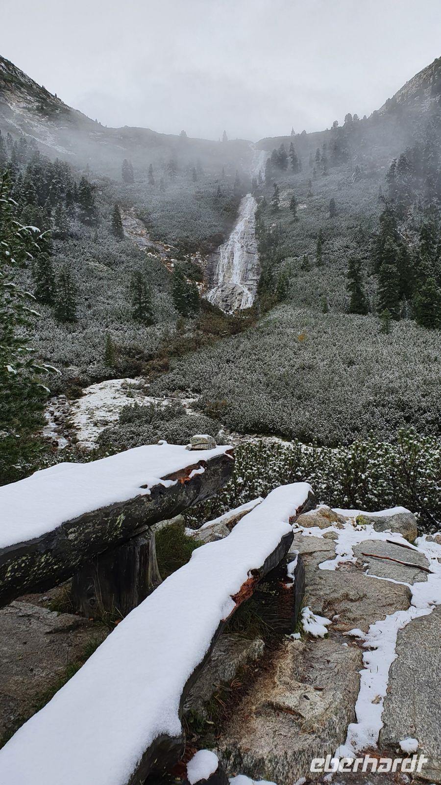 Heute verliessen wir Österreich und wanderten nach Italien. 2 Damen fühlten sich nicht gut und fuhren mit dem Gepäcktransport nach Italien. Alle anderen wurden von 2 Taxen auf der Mautstrasse hinauf zum Schlegeisspeicher gebracht. An der Staumauer waren wir in dichte Wolken gehüllt und konnten nur auf einem Plakat die Schönheit der Gegend betrachten. Wir wanderten zunächst am Ufer entlang und am letzten Zipfel des Schlegeisspeichers rissen die Wolken auf und gaben den Blick über die Wasserfläche frei. Unser Wanderweg führte nun durch den Zamsgrund immer leicht bergauf. Die am Wegesrand stehenden Tannenbäume waren mit Schnee bedeckt und liessen schon mal eine erste Weihnachtsstimmung aufkommen. Der Wanderweg war sehr gut hergerichtet worden und im oberen Teil, wo wir letztes Jahr noch eine sumpfige Wiese queren mußten, verlief er jetzt höher am Berghang. Vor der Lavitzalm gab es eine steilere Passage und leider setzte immer wieder ein leichter Schneeregen ein. Nach der Lavitzalm mussten wir ein großes, breites Tal queren und für den letzten, steilen Anstieg nahmen wir den breiten Fahrweg, weil auf dem Wanderweg zwischen den großen Steinen sehr viel Schnee lag. Dann war es geschafft, der Grenzstein Österreich-Italien war zu sehen und wurde mehrfach im Bild festgehalten. Von der Grenze war das Pfitscher Joch Haus nicht mehr weit entfernt, nur ein kurzes steiles Stück und 2278 m Höhe waren erreicht. Wir kehrten ein und genossen das gute italienische Essen in der Hütte. Gut gestärkt konnten wir nun den langen und steilen Abstieg hinunter ins Pfitscher Tal in Angriff nehmen. Im oberen Teil des Weges war der Blick frei hinunter ins Tal und wurde nur durch das ständig wechselnde Wolkenbild unterbrochen. Weiter unten verlief der Weg im Wald, über kleine Bäche und die vielen Wurzeln am Boden verlangten die ganze Aufmerksamkeit. Dann endlich erreichten wir die erste Gemeinde - Stein. Dort wurde im letzten Jahr eine mittelalterliche kleine Kirche restauriert und in diesem Jahr schon war sie fertig. Das überraschte mich sehr, nur der Altar fehlte noch, aber der wird sicher bis Weihnachten aufgestellt sein. Bei den Auerhöfen kamen wir zur Bushaltestelle und fuhren die letzten 5 km mit dem Linienbus bis nach Kematen zu unserem Hotel Kranebitt. Wir wählten unser Abendessen aus, bekamen die Zimmerschlüssel und viele Wanderer entspannten bis zum Abendessen im Schwimmbad und/oder in der Sauna des Hotels. Nach dem Abendessen probierten wir den Kranebitt, einen Wacholderschnaps aus Südtirol.
