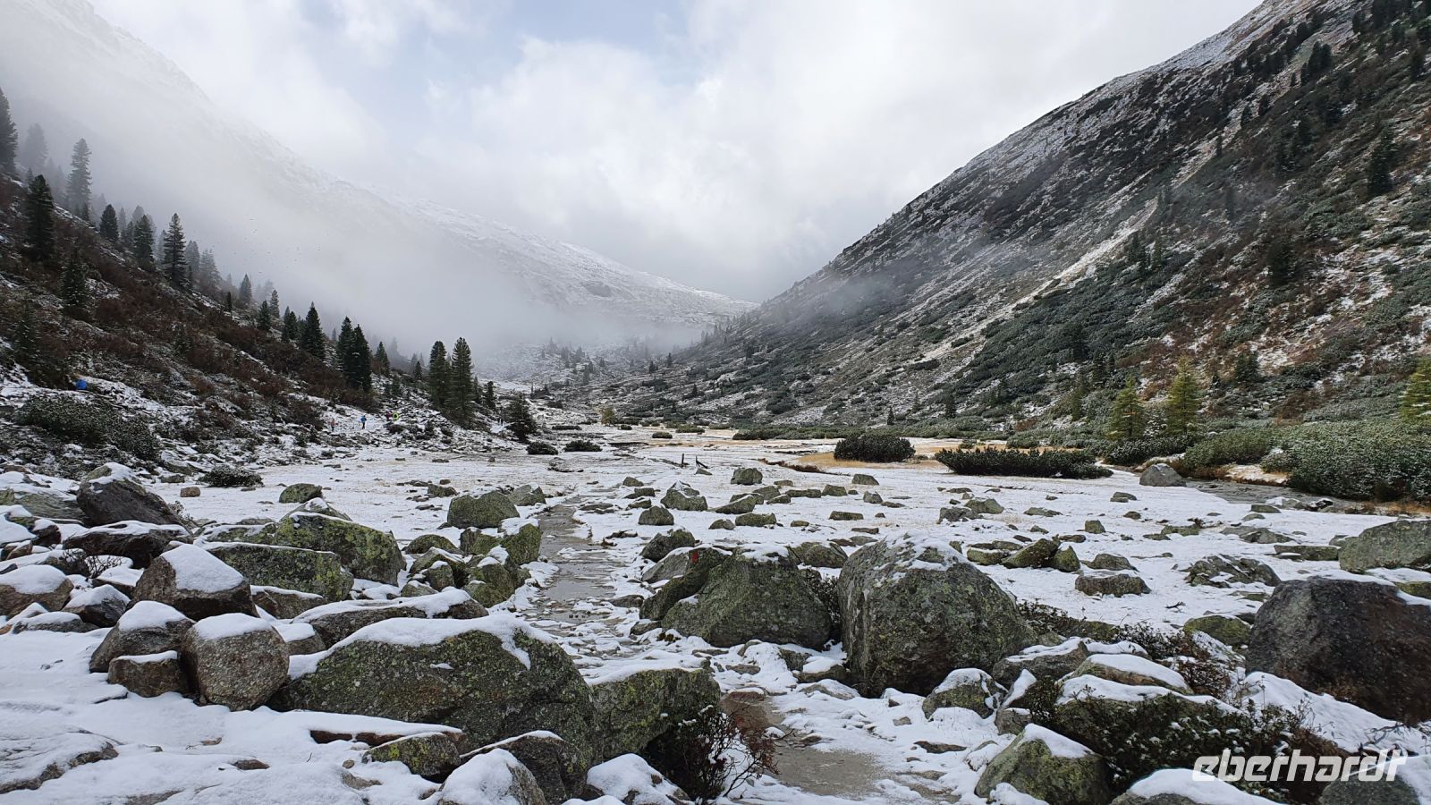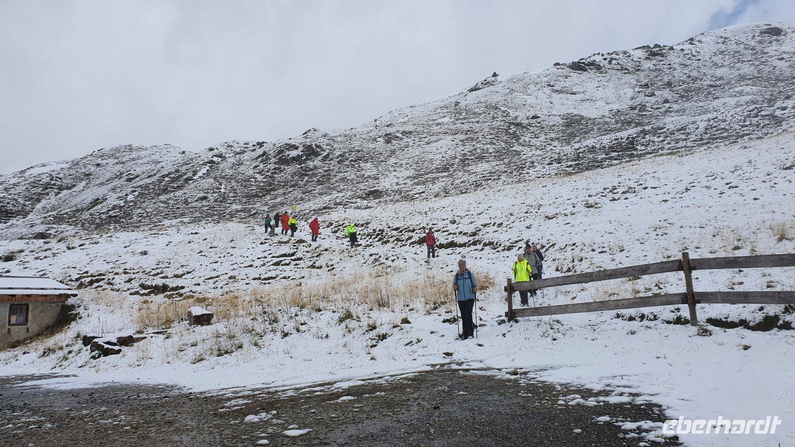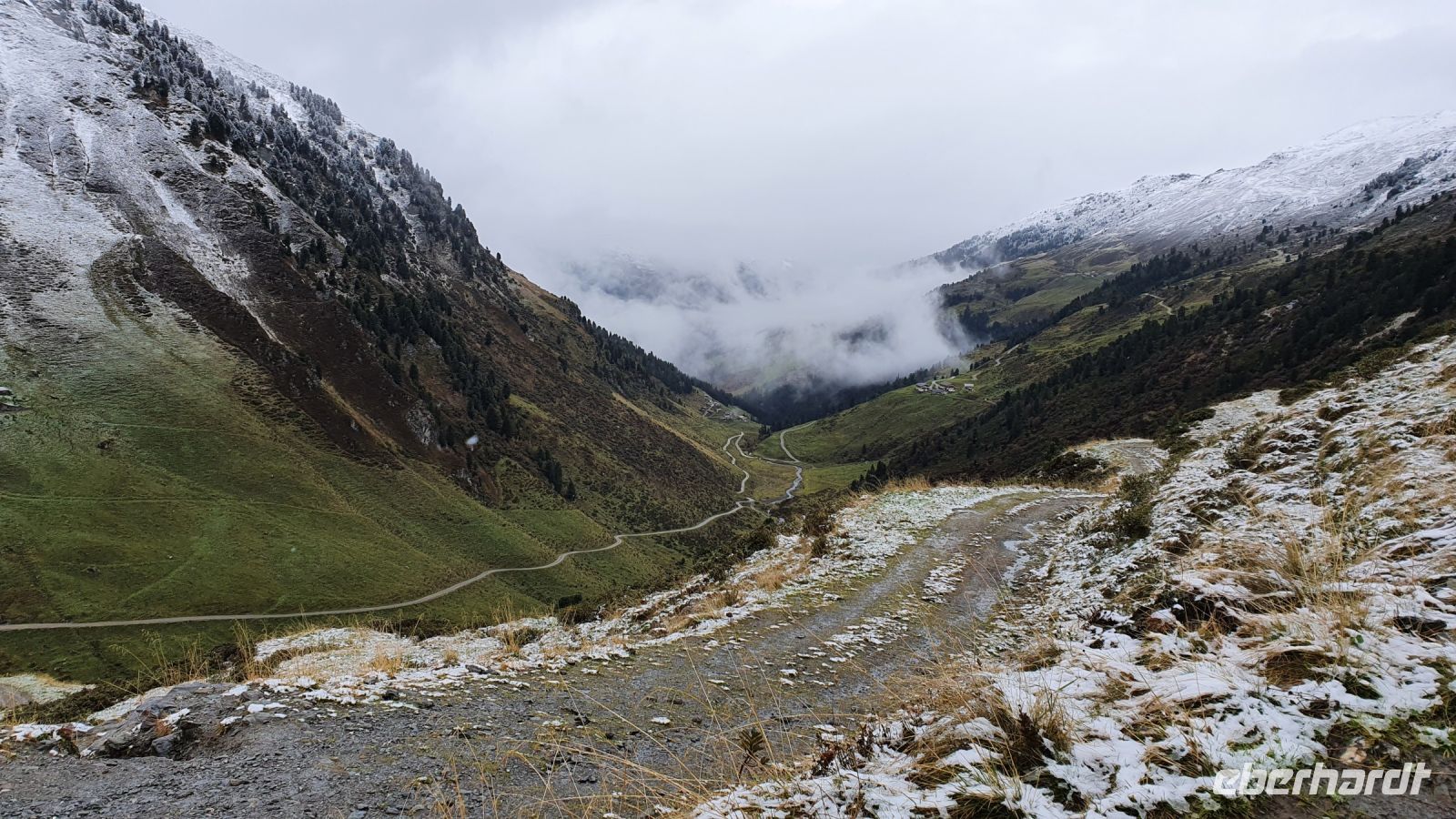 Heute verliessen wir Österreich und wanderten nach Italien. 2 Damen fühlten sich nicht gut und fuhren mit dem Gepäcktransport nach Italien. Alle anderen wurden von 2 Taxen auf der Mautstrasse hinauf zum Schlegeisspeicher gebracht. An der Staumauer waren wir in dichte Wolken gehüllt und konnten nur auf einem Plakat die Schönheit der Gegend betrachten. Wir wanderten zunächst am Ufer entlang und am letzten Zipfel des Schlegeisspeichers rissen die Wolken auf und gaben den Blick über die Wasserfläche frei. Unser Wanderweg führte nun durch den Zamsgrund immer leicht bergauf. Die am Wegesrand stehenden Tannenbäume waren mit Schnee bedeckt und liessen schon mal eine erste Weihnachtsstimmung aufkommen. Der Wanderweg war sehr gut hergerichtet worden und im oberen Teil, wo wir letztes Jahr noch eine sumpfige Wiese queren mußten, verlief er jetzt höher am Berghang. Vor der Lavitzalm gab es eine steilere Passage und leider setzte immer wieder ein leichter Schneeregen ein. Nach der Lavitzalm mussten wir ein großes, breites Tal queren und für den letzten, steilen Anstieg nahmen wir den breiten Fahrweg, weil auf dem Wanderweg zwischen den großen Steinen sehr viel Schnee lag. Dann war es geschafft, der Grenzstein Österreich-Italien war zu sehen und wurde mehrfach im Bild festgehalten. Von der Grenze war das Pfitscher Joch Haus nicht mehr weit entfernt, nur ein kurzes steiles Stück und 2278 m Höhe waren erreicht. Wir kehrten ein und genossen das gute italienische Essen in der Hütte. Gut gestärkt konnten wir nun den langen und steilen Abstieg hinunter ins Pfitscher Tal in Angriff nehmen. Im oberen Teil des Weges war der Blick frei hinunter ins Tal und wurde nur durch das ständig wechselnde Wolkenbild unterbrochen. Weiter unten verlief der Weg im Wald, über kleine Bäche und die vielen Wurzeln am Boden verlangten die ganze Aufmerksamkeit. Dann endlich erreichten wir die erste Gemeinde - Stein. Dort wurde im letzten Jahr eine mittelalterliche kleine Kirche restauriert und in diesem Jahr schon war sie fertig. Das überraschte mich sehr, nur der Altar fehlte noch, aber der wird sicher bis Weihnachten aufgestellt sein. Bei den Auerhöfen kamen wir zur Bushaltestelle und fuhren die letzten 5 km mit dem Linienbus bis nach Kematen zu unserem Hotel Kranebitt. Wir wählten unser Abendessen aus, bekamen die Zimmerschlüssel und viele Wanderer entspannten bis zum Abendessen im Schwimmbad und/oder in der Sauna des Hotels. Nach dem Abendessen probierten wir den Kranebitt, einen Wacholderschnaps aus Südtirol.