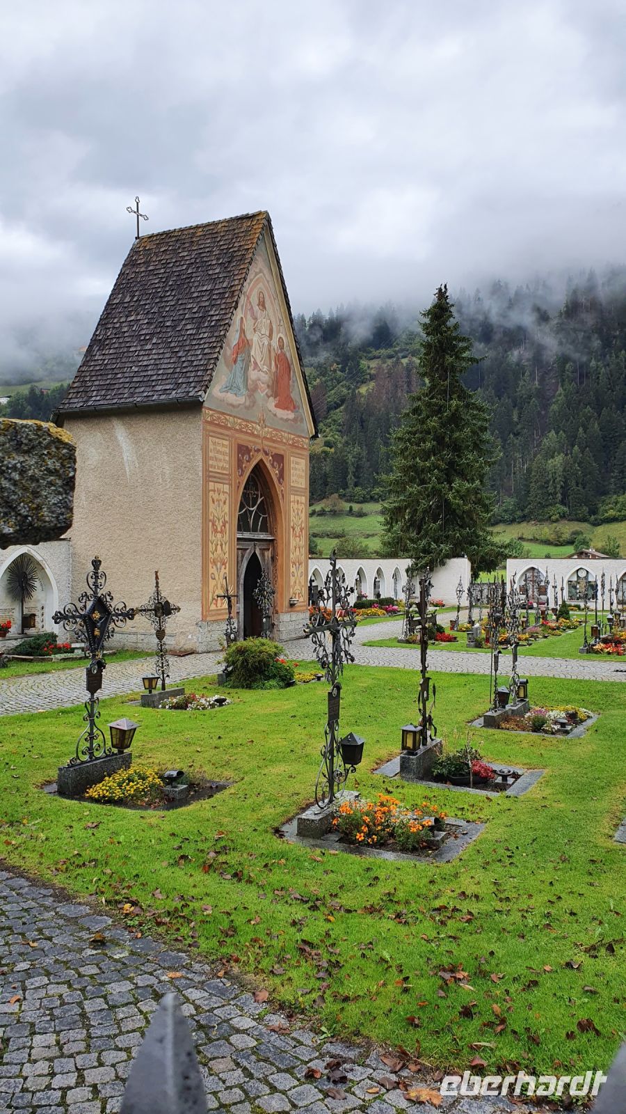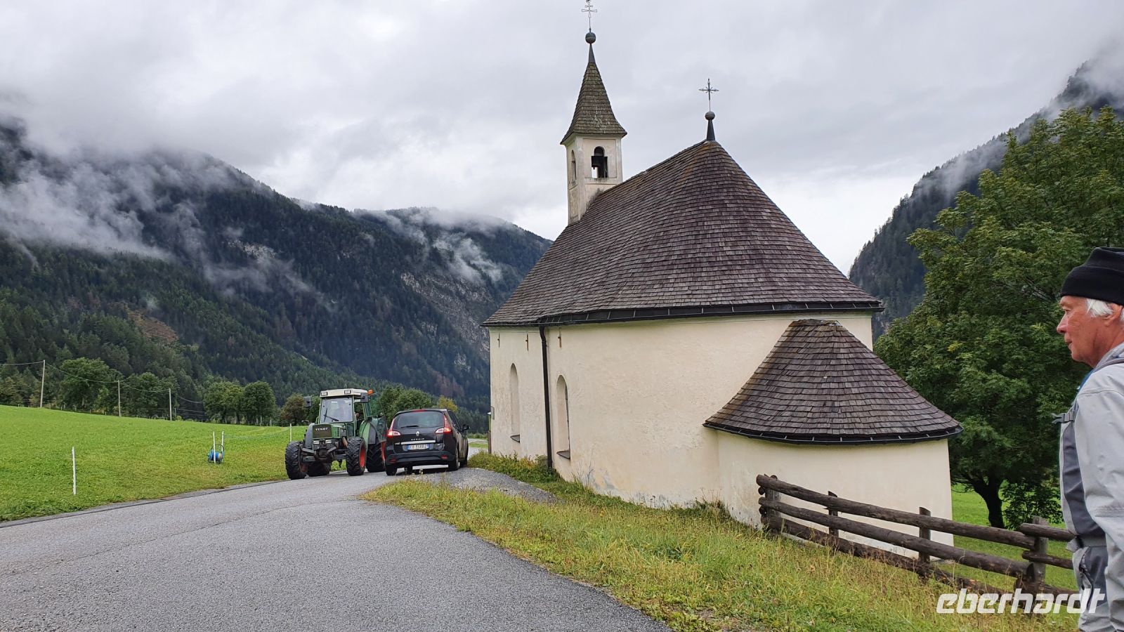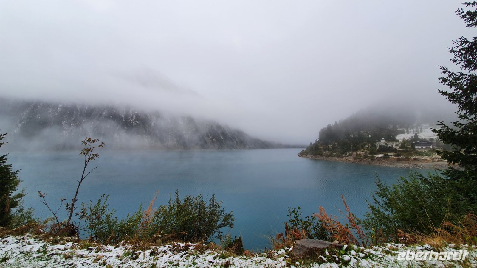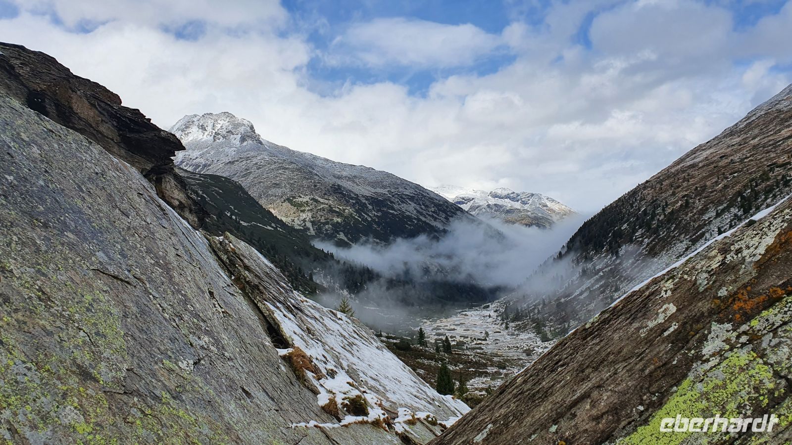 Heute verliessen wir Österreich und wanderten nach Italien. 2 Damen fühlten sich nicht gut und fuhren mit dem Gepäcktransport nach Italien. Alle anderen wurden von 2 Taxen auf der Mautstrasse hinauf zum Schlegeisspeicher gebracht. An der Staumauer waren wir in dichte Wolken gehüllt und konnten nur auf einem Plakat die Schönheit der Gegend betrachten. Wir wanderten zunächst am Ufer entlang und am letzten Zipfel des Schlegeisspeichers rissen die Wolken auf und gaben den Blick über die Wasserfläche frei. Unser Wanderweg führte nun durch den Zamsgrund immer leicht bergauf. Die am Wegesrand stehenden Tannenbäume waren mit Schnee bedeckt und liessen schon mal eine erste Weihnachtsstimmung aufkommen. Der Wanderweg war sehr gut hergerichtet worden und im oberen Teil, wo wir letztes Jahr noch eine sumpfige Wiese queren mußten, verlief er jetzt höher am Berghang. Vor der Lavitzalm gab es eine steilere Passage und leider setzte immer wieder ein leichter Schneeregen ein. Nach der Lavitzalm mussten wir ein großes, breites Tal queren und für den letzten, steilen Anstieg nahmen wir den breiten Fahrweg, weil auf dem Wanderweg zwischen den großen Steinen sehr viel Schnee lag. Dann war es geschafft, der Grenzstein Österreich-Italien war zu sehen und wurde mehrfach im Bild festgehalten. Von der Grenze war das Pfitscher Joch Haus nicht mehr weit entfernt, nur ein kurzes steiles Stück und 2278 m Höhe waren erreicht. Wir kehrten ein und genossen das gute italienische Essen in der Hütte. Gut gestärkt konnten wir nun den langen und steilen Abstieg hinunter ins Pfitscher Tal in Angriff nehmen. Im oberen Teil des Weges war der Blick frei hinunter ins Tal und wurde nur durch das ständig wechselnde Wolkenbild unterbrochen. Weiter unten verlief der Weg im Wald, über kleine Bäche und die vielen Wurzeln am Boden verlangten die ganze Aufmerksamkeit. Dann endlich erreichten wir die erste Gemeinde - Stein. Dort wurde im letzten Jahr eine mittelalterliche kleine Kirche restauriert und in diesem Jahr schon war sie fertig. Das überraschte mich sehr, nur der Altar fehlte noch, aber der wird sicher bis Weihnachten aufgestellt sein. Bei den Auerhöfen kamen wir zur Bushaltestelle und fuhren die letzten 5 km mit dem Linienbus bis nach Kematen zu unserem Hotel Kranebitt. Wir wählten unser Abendessen aus, bekamen die Zimmerschlüssel und viele Wanderer entspannten bis zum Abendessen im Schwimmbad und/oder in der Sauna des Hotels. Nach dem Abendessen probierten wir den Kranebitt, einen Wacholderschnaps aus Südtirol.