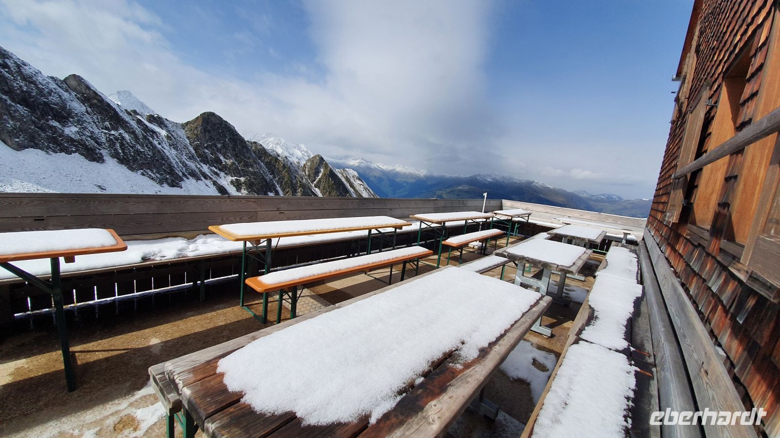 Am Morgen sah das Wetter mal wieder besser aus, als angekündigt und die Panoramabilder der Seilbahn Bergstationen luden zum Wandern ein. So machten wir uns nach dem Frühstück auf den Weg zur Ahornseilbahn und fuhren auf das Ahornplateau. Unterwegs gab es bei der Seilbahn einen außerplanmässigen Halt und es wurde ein Arbeiter an einer Stütze aufgenommen, der dort eine Reparatur durchgeführt hatte. Oben auf dem Ahornboden in knapp 2000 m Höhe teilte sich unsere Gruppe. Einige wanderten mit mir zur Edelhütte, andere bestiegen den Filzenkogel und/oder spazierten auf dem Rundweg des Ahornbodens. Der Weg zur Edelhütte war recht abwechslungsreich und bot viele schönen Aussichten runter ins Zillertal und hinauf zur Ahornspitze mit der Edelhütte oben am Hang. Auf der Edelhütte schien die Sonne, wir befreiten Tische und Bänke vom Schnee und nahmen so unseren Mittagsimbiss draussen in der Sonne zu uns. Für den Rückweg hatte ich den bequemeren Pfad gewählt und so konnten wir die Aussicht ins Tal ausgiebig geniessen. Wieder zurück am Ahornboden wanderte ich noch mit 2 Gästen hinauf zum Filzenkogel und dort wurden wir vom starken Wind am Gipfelkreuz fast weggeweht. Am späten Nachmittag waren wir wieder alle unten in Mayrhofen und erkundeten die zahlreichen Geschäfte und Cafes. Zum Abendessen hatte ich für unsere Gruppe Plätze in der Bauernstube des Hotels Rose reserviert und dort gab es eine große Auswahl an Speisen zu guten Preisen.