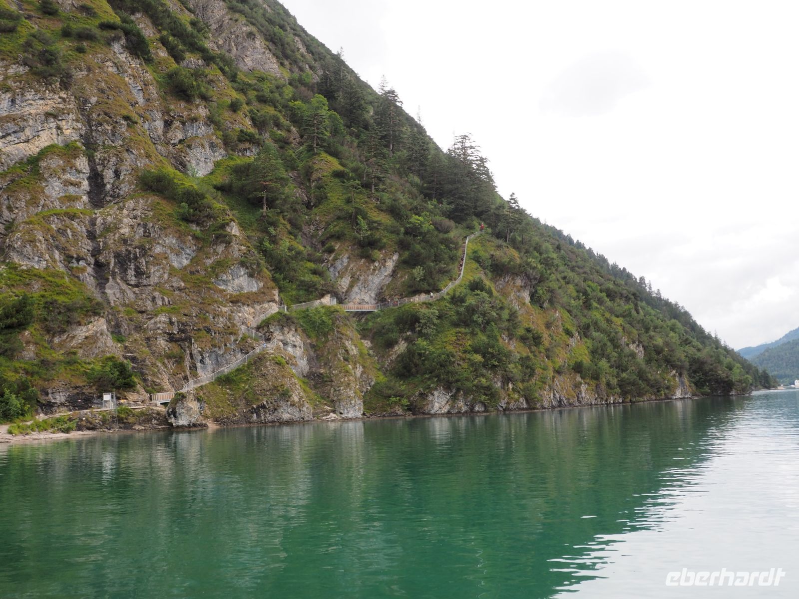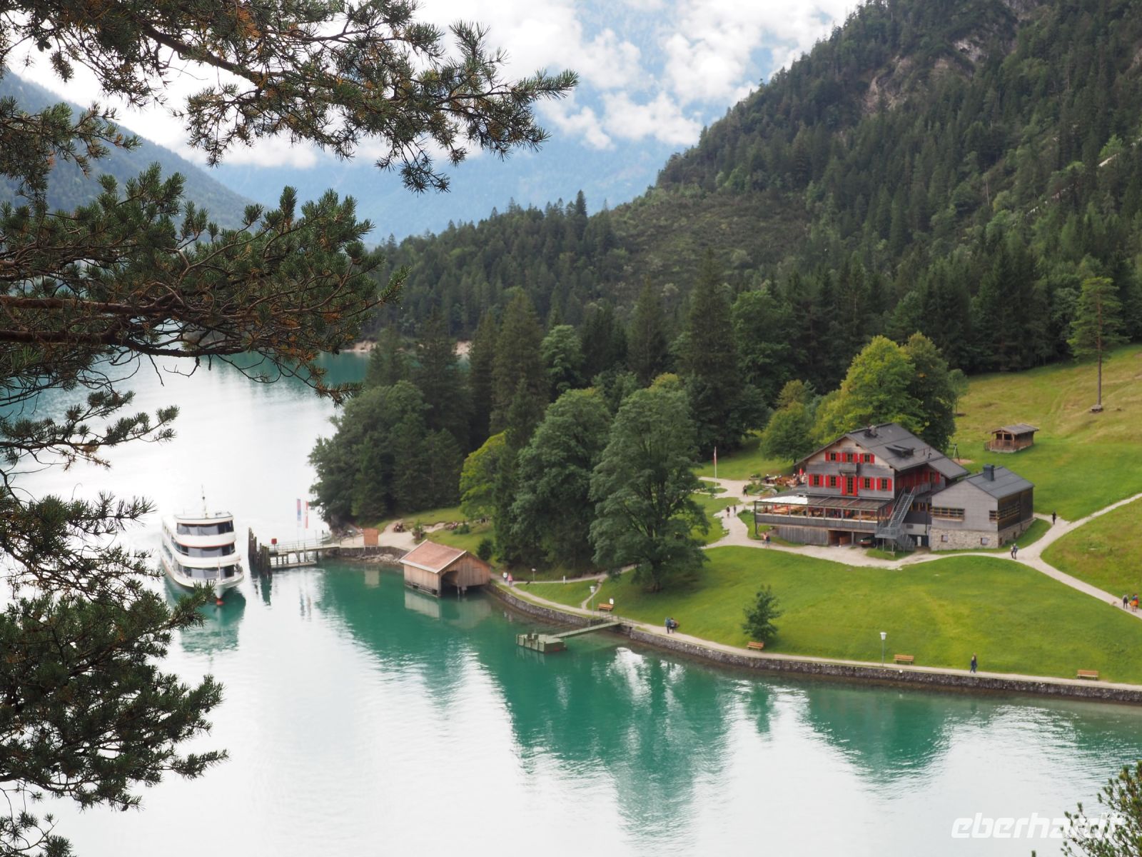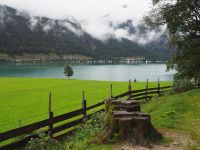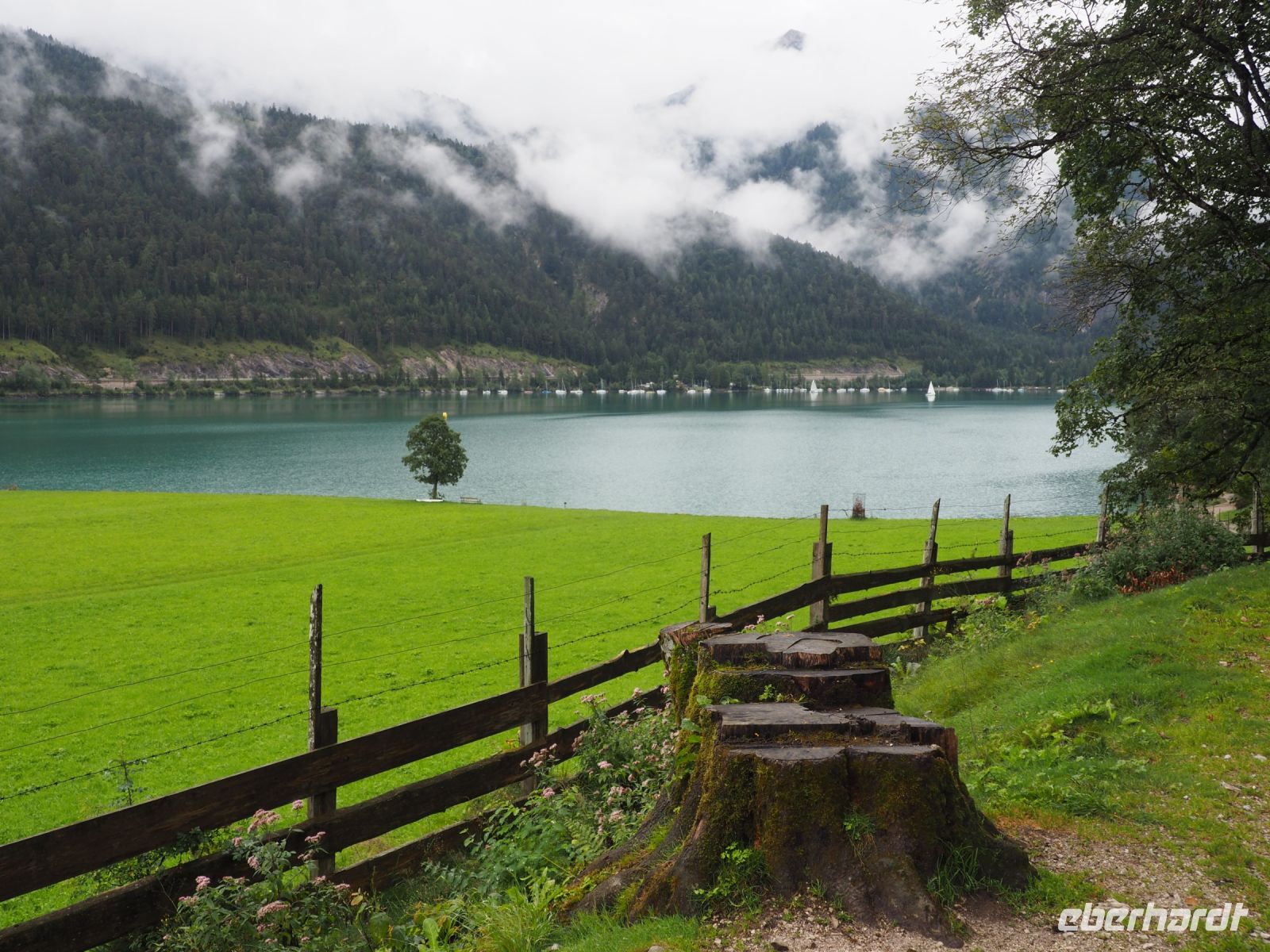 Nach einem wunderbaren Frühstücksbuffet machten wir uns zu Fuß direkt vom Hotel aus auf den Weg. Bald schon erreichten wir das Westufer des Achensees, auch Fjord Tirols genannt, an dem wir in stetem Auf und Ab entlang wanderten. Schöne Ausblicke auf den See, der umgeben ist von den Bergen des Karwendel- und Rofangebirges, begleiteten uns.