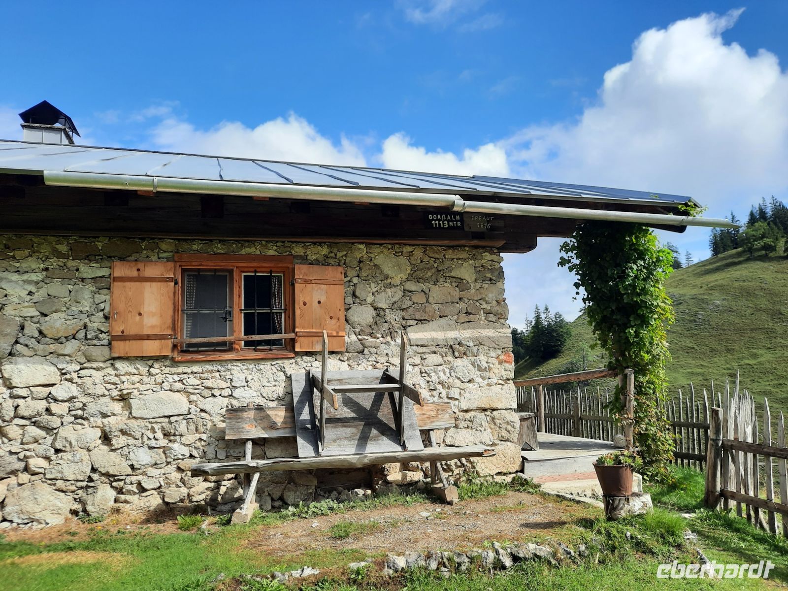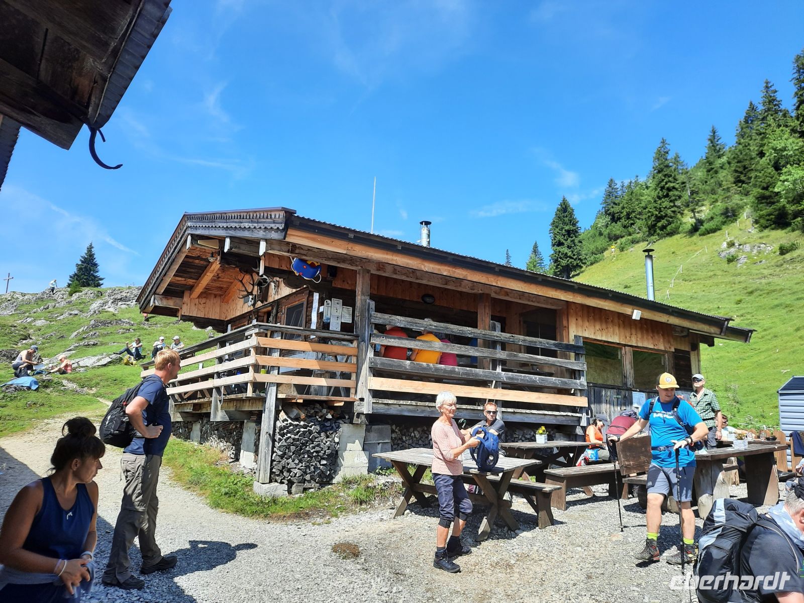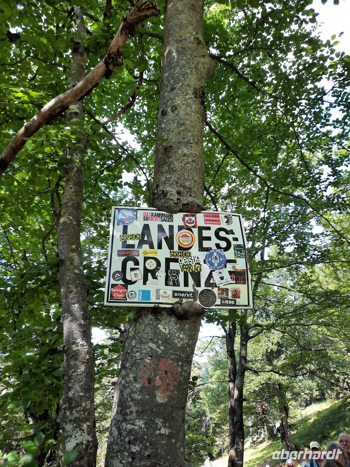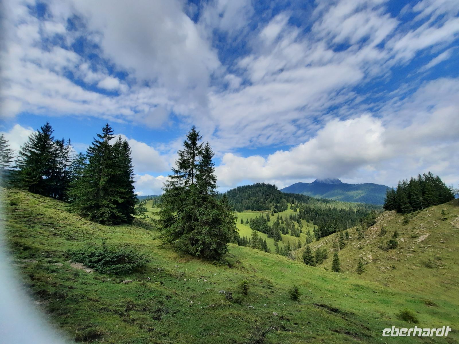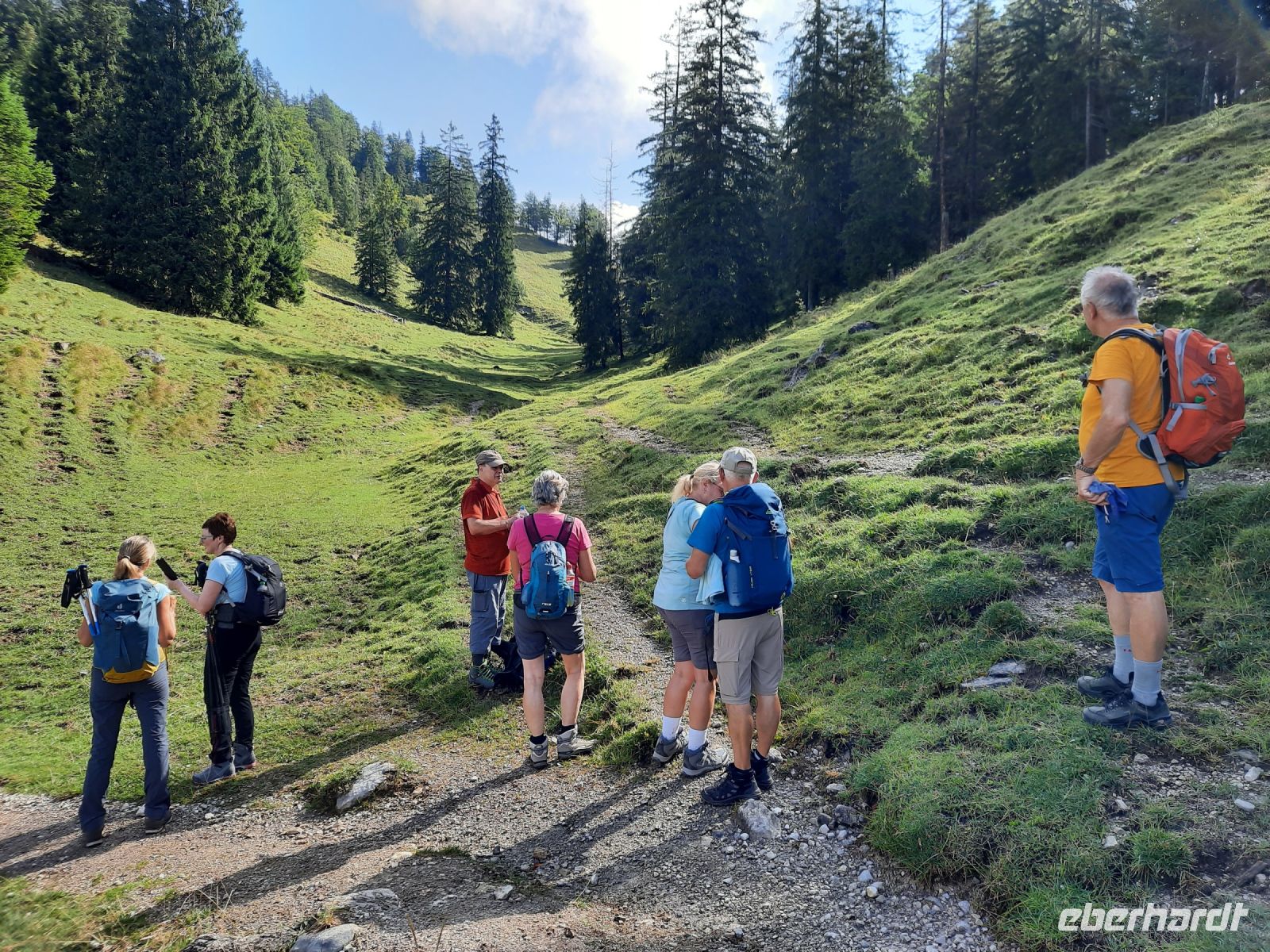 Grenze Deutschland - Österreich Vom Parkplatz in der Nähe von Wildbad Kreuth startete unsere zweite Tour. Durch einen Buchenmischwald ging es stetig bergauf bis zur Goaßalm auf 1.1113 m (erbaut 1816). Weitere 500 Höhenmeter folgten, bis wir den Sattel vom Schildenstein erreichten. Die spärlich markierte deutsch-österreichische Grenze erreichten wir gegen Mittag. Im anschließenden offenen Almgelände wanderten wir zur Blaubergalm auf 1.540 m. Ein urig bewirtschafteter Bauernhof, nur mit regionalen Produkten, lud zu einer Verschnaufspause ein. Frisch gestärkt ging es weiter durch einen Nadelwald hinunter zum Klammbach. Dieser führte uns nach 2,5 Stunden nach Achenwald – einem Ortsteil von Achenkirch. Dort holte uns ein Taxi ab und fuhr uns in den Achentaler Hof nach Achenkirch. Eine anstrengende Tour war geschafft und wir erholten uns vorzüglich im Deluxe Hotel.