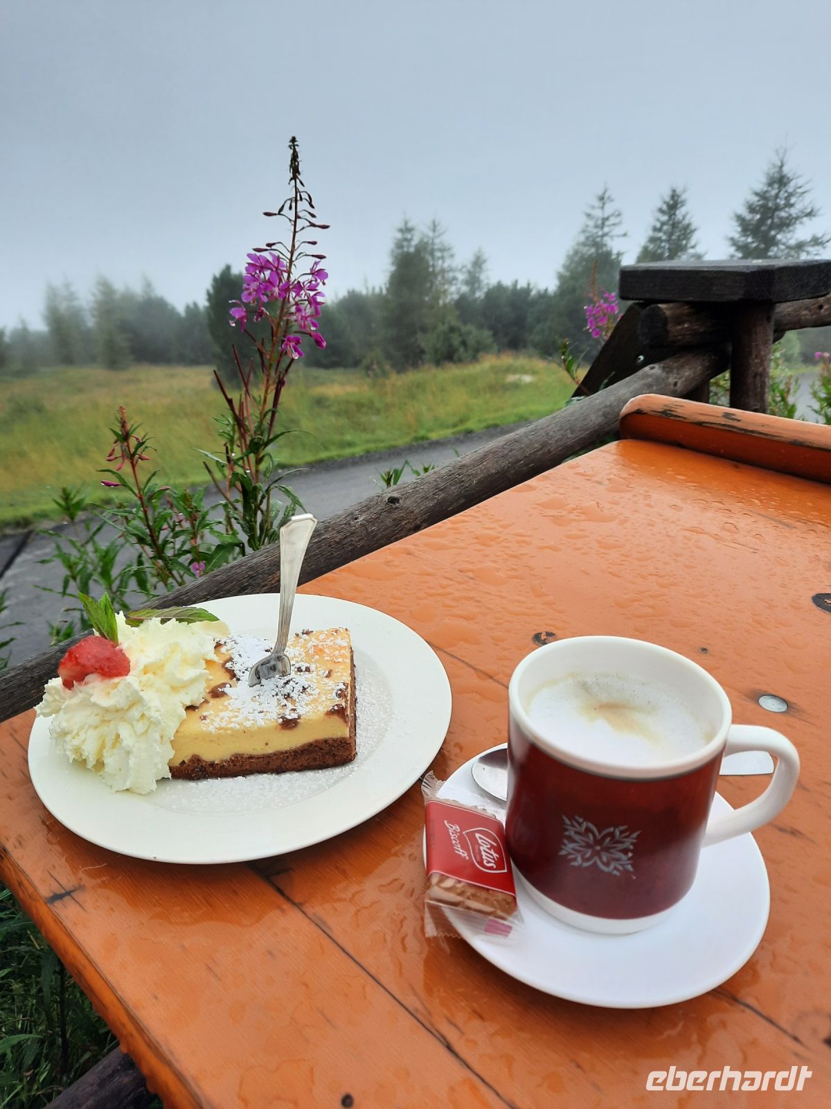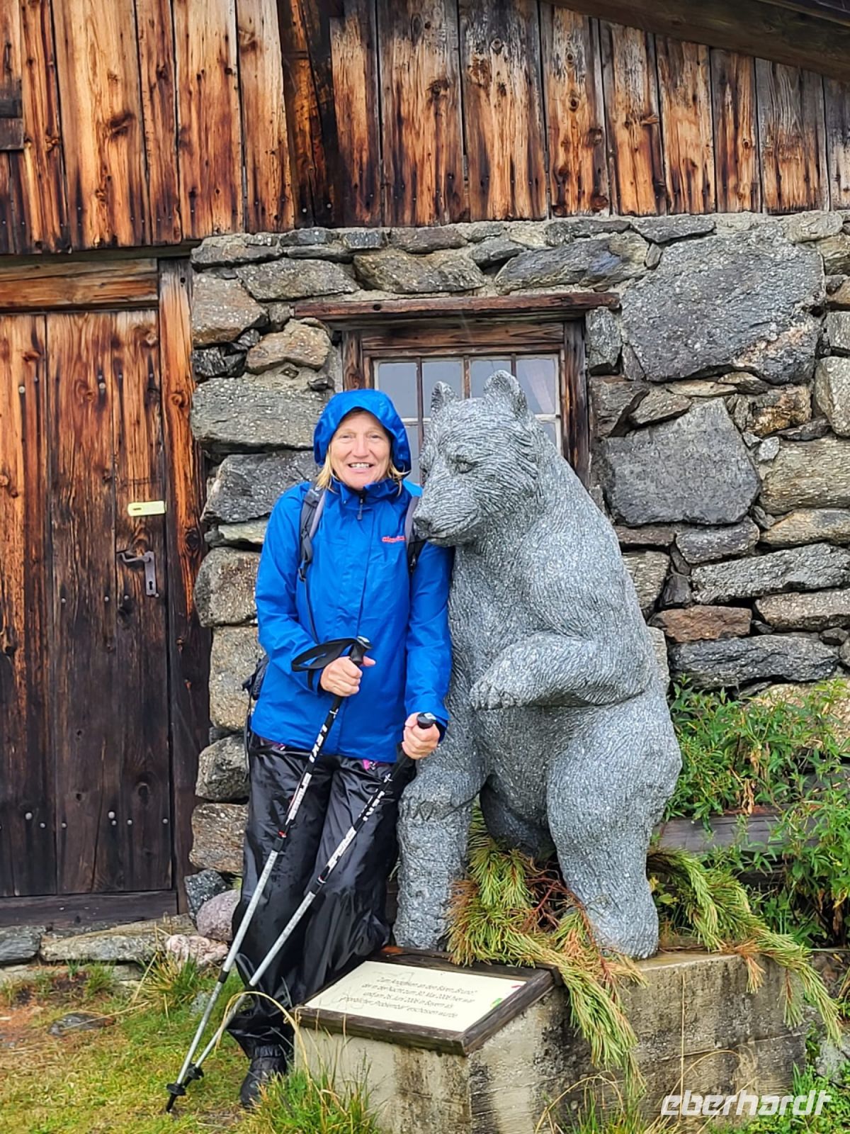 Ein kurzer Spaziergang führte uns vom Hotel Kosis zur Spieljochbahn. Mit der Gondel schwebten wir auf den Erlebnisberg Spieljoch auf 1.920 m. Dieser liegt oberhalb der Baumgrenze und bietet eine Vielzahl von Aktivitäten für Groß und Klein. Der Rundumblick blieb uns leider verwehrt, da der Regen nicht aufhörte. Nach ca. 2 Stunden erreichten wir die Gartalm, ein wahres Naturjuwel auf 1.849 m. Sogar der geliebte Kaiserschmarren wurde den Gästen serviert. Bruno, das beliebte Fotomotiv, erinnerte an den Bären (2006) der dort seine Runden gedreht haben soll. Hier auf der Gartalm spürten wir die herzliche Atmosphäre der Wirtsleute. Anschließend ging es weiter durch reizvolle Almlandschaften der Tuxer Alpen. Ca. 2,5 Stunden schlängelte sich unser Höhenweg meistens bergab bis zum bekannten Wintersportort Hochfügen. Im Hotel Lamark schmeckte unser wohlverdientes Bier / Radler besonders gut.