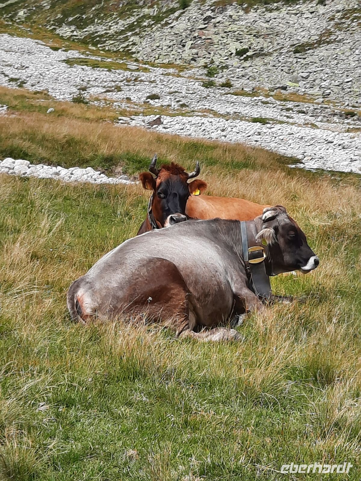 Grenze Österreich - Italien Der zweite Grenzübertritt stand uns heute bevor, um die Südseite der Alpen zu erreichen. Um Zeit zu sparen, fuhren wir mit dem Taxi zum Schlegeis Stausee. Dieser Stausee ist einer von fünf im Zillertal mit einer 131 Meter hohen Staumauer. Schon 1965 wurde das Wasserkraftwerk in Betrieb genommen. Die Bergkulisse rund um den Stausee ist allein schon eine Augenweide! Wir passierten das Zamsereck und erblickten in südöstlicher Richtung den grandiosen Schrammacher Wasserfall. Dieser speist den Schlegeis Stausee. Eine Herde von Haflingern ließ sich nicht stören und graste genüsslich am Wegesrand. Gegen Mittag erreichten wir die Lavitz Alm, die zur Pause einlud. Ein kleines Museum zeigte detailliert die Gesteinsschichten am Berg und die Persönlichkeiten einiger Bergsteiger. Es folgte der Aufstieg zum Pfitscherjoch, die zweitniedrigste Kammüberschreitung nach dem Brenner. Nach ca. 40 Minuten Anstieg erreichten wir den Grenzstein, der uns in Südtirol willkommen hieß. Die große Schutzhütte „Pfitscher Joch Haus“ auf 2.276 Höhenmeter versorgte uns mit vorzüglichen italienischen Köstlichkeiten. Nicht nur die Wanderer fühlten sich wohl, sondern auch eine Vielzahl von Mountainbiker nutzte die Rast im „Pfitscher Joch Haus“. Nach unserer wohlverdienten Pause erfolgte der Abstieg zum kleinen Ort Stein und weiter nach St. Jakob im Pfitscher Tal. Von dort aus nahmen wir den öffentlichen Bus bis zum Hotel „Kranebitt“ in Kematen.