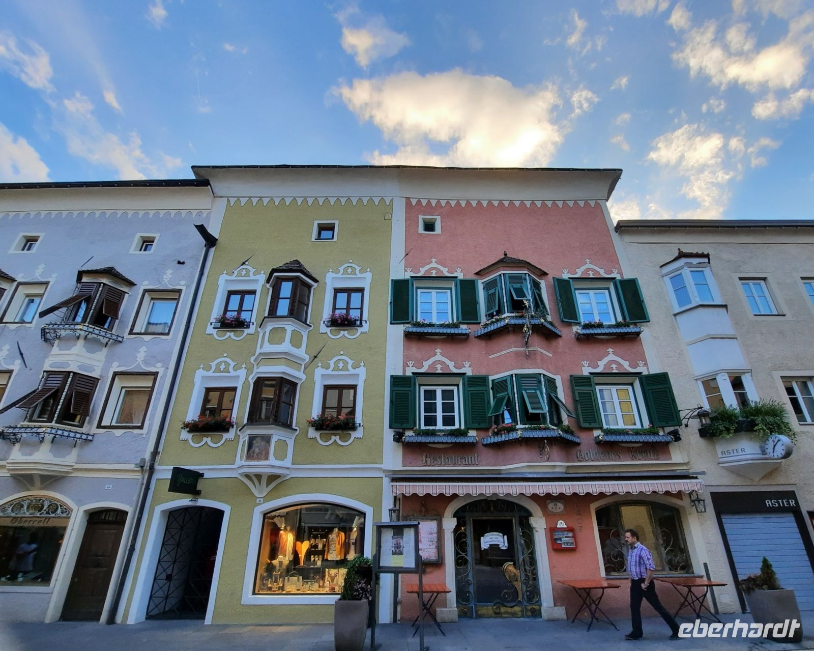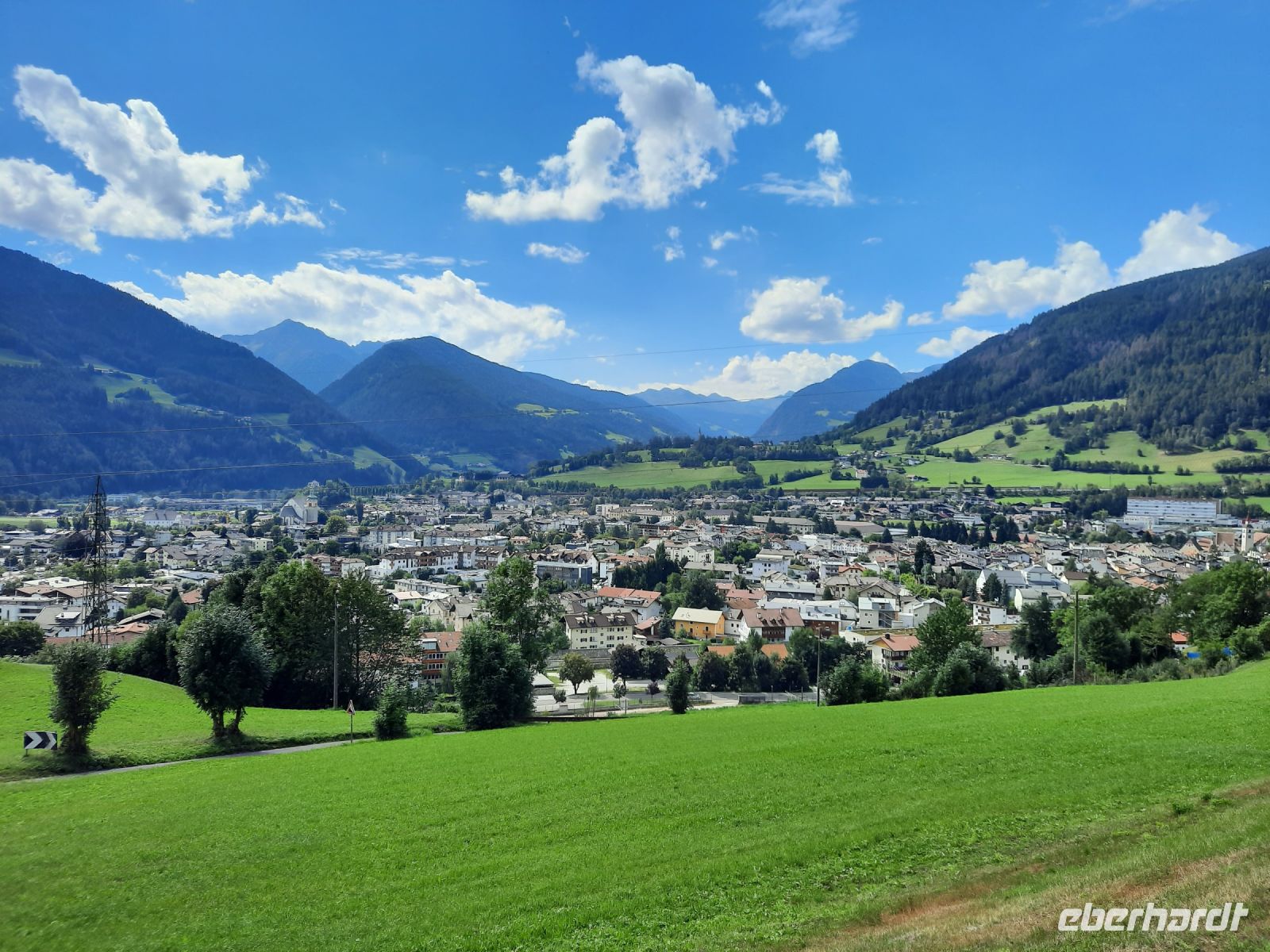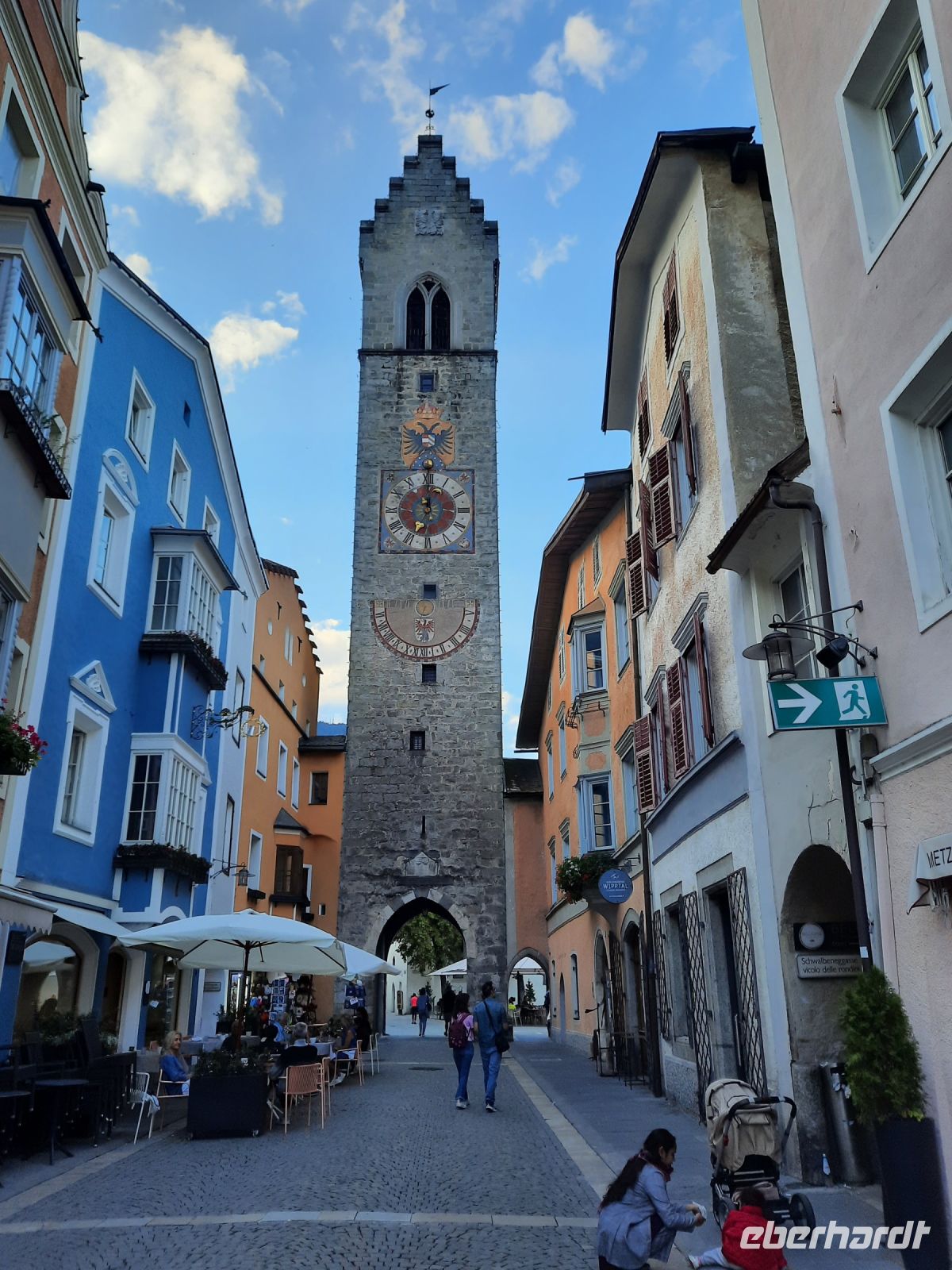 Auf zu unserer letzten Etappe, die direkt hinter dem Hotel „Kranebitt“ begann. Zuerst passierten wir einen Steinbruch. Weitere kleine Ortschaften folgten wie: Ried und Afens mit einer kleinen Kapelle. Das Pfitscher Tal schmiegt sich harmonisch unterhalb der Olperer Gruppe ein, die wiederum zu den Tuxer Alpen zählt. Meistens führte der Weg am Pfitscher Bach entlang, bis wir Prati (Wiesen) erreichten. Von dort aus war es nur noch ½ Stunde bis Flains (Flaines). Geschafft, wir meisterten den Abstieg von 650 Höhenmetern und blickten von einer Aussichtsplattform auf die Alpinstadt Sterzing. Der letzte Stempel im Alpenpass wurde gesetzt und einen Aperol gab es am 12 er Turm in Sterzing. Nun stand dem Bummel in der beliebten Fußgänger Zone von Sterzing nichts mehr im Wege und Dolce Vita wurde in vollen Zügen genossen! Am Ende der Fußgängerzone befand sich unser rustikal – schickes Boutique Hotel Steindl’s mit Bergblick. Unser gemeinsames Abendessen im Kolping schmeckte hervorragend und genüsslich ließen wir den Abend ausklingen.