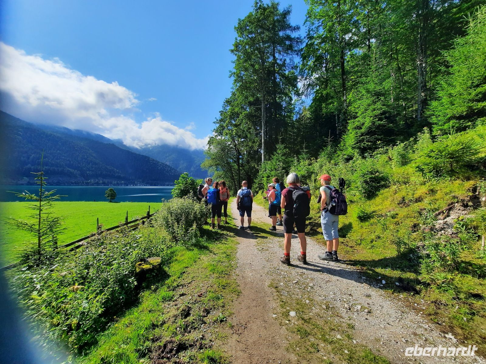 Nach dem Frühstück ging es am Fuß des Karwendel Gebirges, auf dem flachen Wege am Westufer des Achensees entlang. Bei Sonnenschein mit Blick auf das Rofangebirge war es ein Genuss, den Mariensteig entlangzuwandern. Er wird zu Recht als Fjord Tirols bezeichnet. Nach leichtem auf- und ab erreichten wir nach ca.2 Std. die Gaisalm, die zu einer Rast einlud. Nach einer Pause setzen wir die Wanderung fort bis Pertisau. Weiter ging es per Linienboot nach Seespitz. Im Anschluss nahmen wir den Bus von Maurach bis Jenbach im Inntal. Die schöne, alte Zilltertal Bahn fuhr uns gemütlich bis Fügen. Im Hotel Bruno kamen wir in den Genuss eines fantastischen Menüs mit regionalen Köstlichkeiten von Tirol.