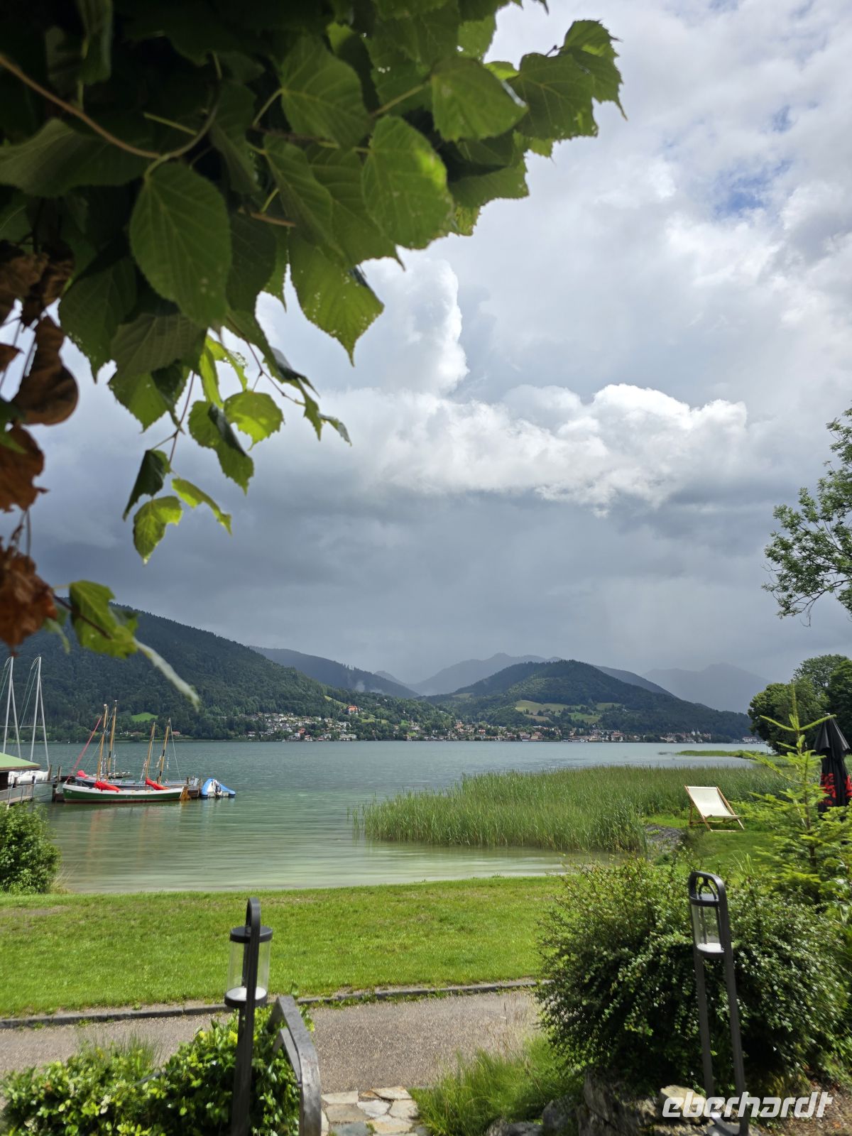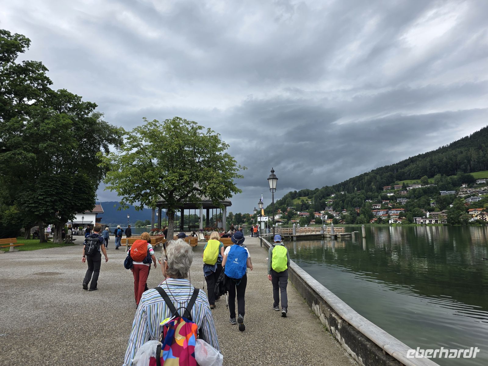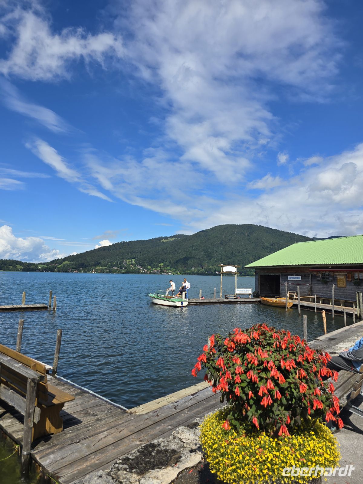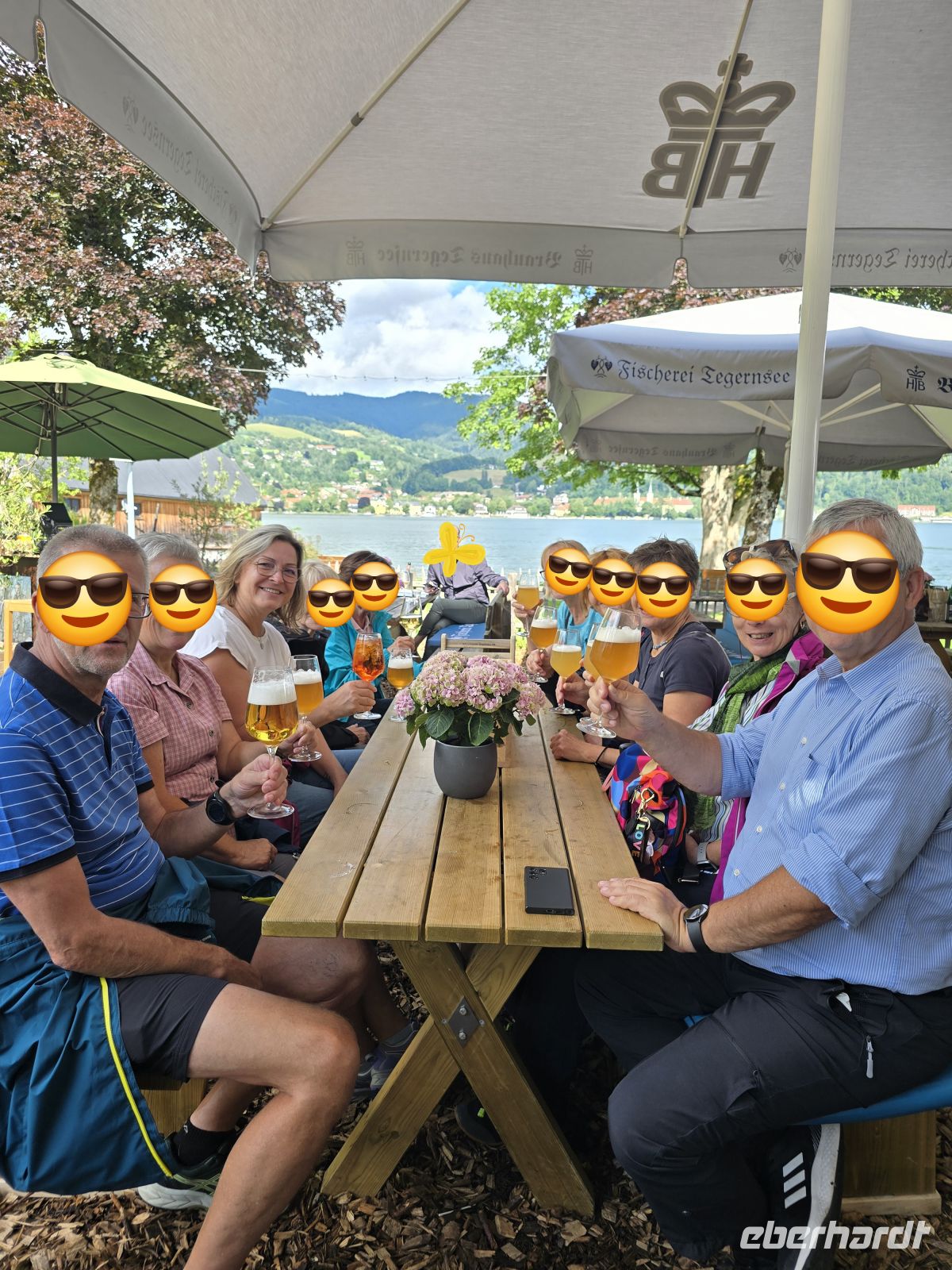 Wir liefen durch das Örtchen Gmund, überquerten die Mangfall und von da an ging es stetig bergan. Immer mit dem See im Blick, liefen wir im leichten Auf und Ab durch den Wald. Am Anfang noch mit starken Regenschauern, welche dann immer schwächer wurden und schließlich ganz aufhörten. So gelangten wir nach Tegernsee, wo wir uns im urigen Braustübel die lokalen Spezialitäten schmecken ließen. Die eine oder andere Überraschung war dabei, wenn man sich unter dem Namen ein anderes Essen vorgestellt hatte. Unter dem großen Schirm im Trockenen und bei leckeren Speisen und Getränken genossen wir mal wieder die Wetterkapriolen. Mal schien die Sonne, dann kam wieder ein Regenschauer und manchmal beides gleichzeitig. Eigentlich war der Plan, von hier schon zurück zum Hotel zu fahren, aber da uns gerade mal wieder die Sonne begleitete, entschieden wir uns, unsere Wanderung etwas zu verlängern. Also begaben wir uns frisch gestärkt wieder auf den Höhenweg. Diesmal aber mit einem schon recht sportlichen Anstieg. Unterwegs wurden wir dafür mit wundervoller Natur und Sonne belohnt. Bei schönstem Sonnenschein kamen wir auch in Rottach-Egern an und freuten uns auf unsere kurze Schifffahrt zurück nach Bad Wiessee. Kaum waren wir an Bord, fing auch schon der nächste Regenguss an, der aber pünktlich bei Ankunft in Bad Wiessee aufhörte. So gelangten wir trockenen Fußes wieder in unser Hotel. Hier enterten wir natürlich gleich wieder unser schönes SPA.