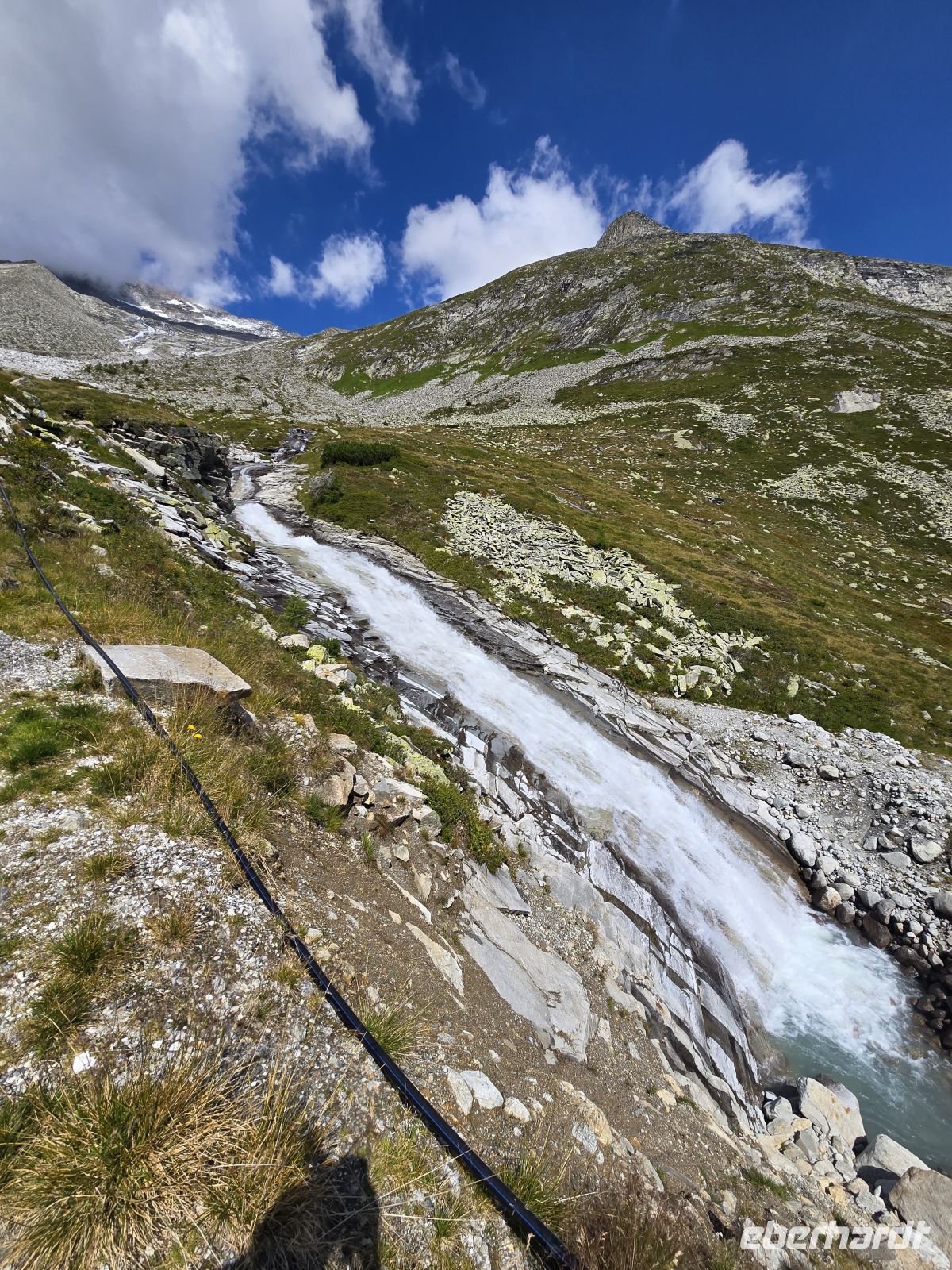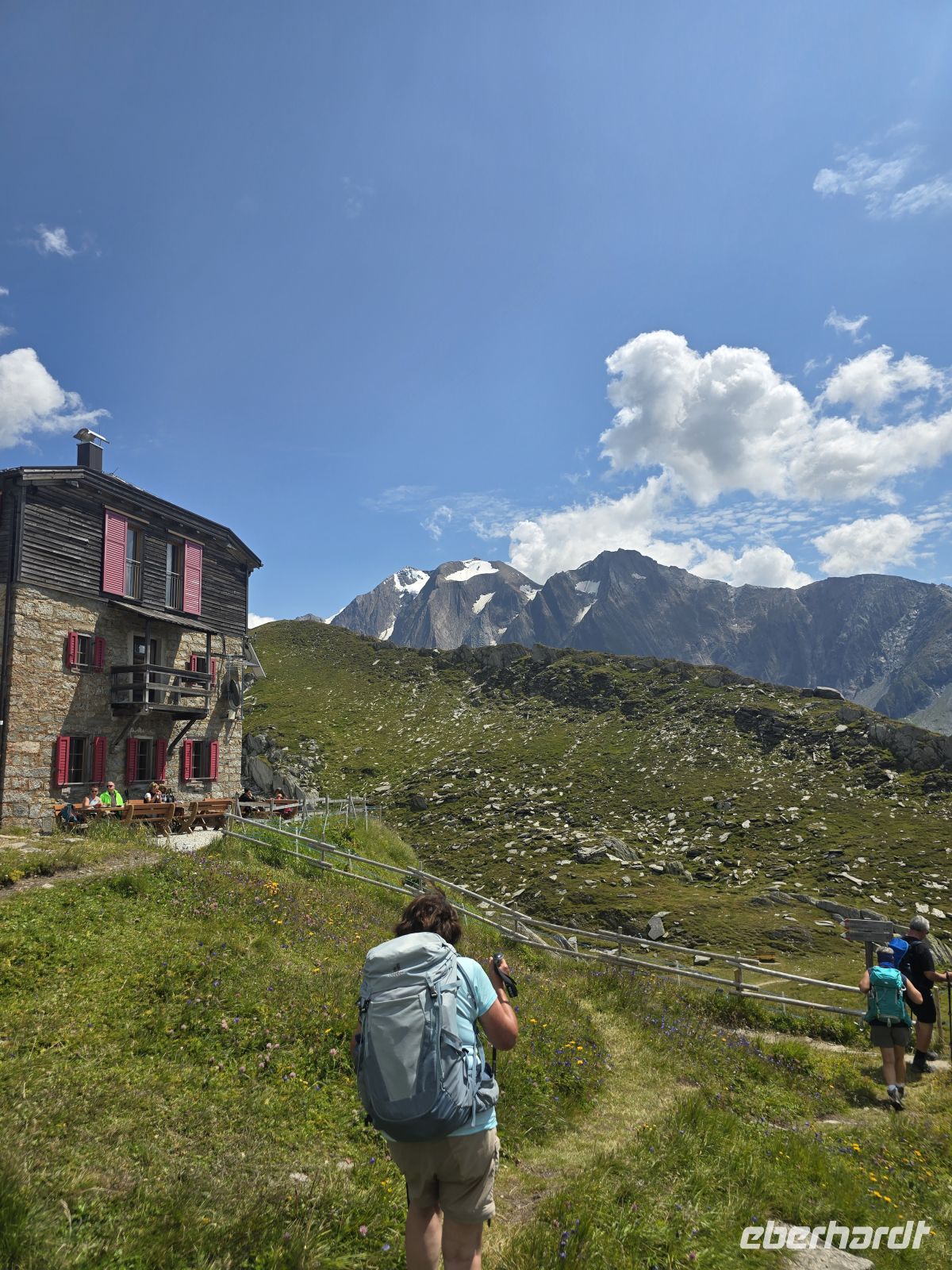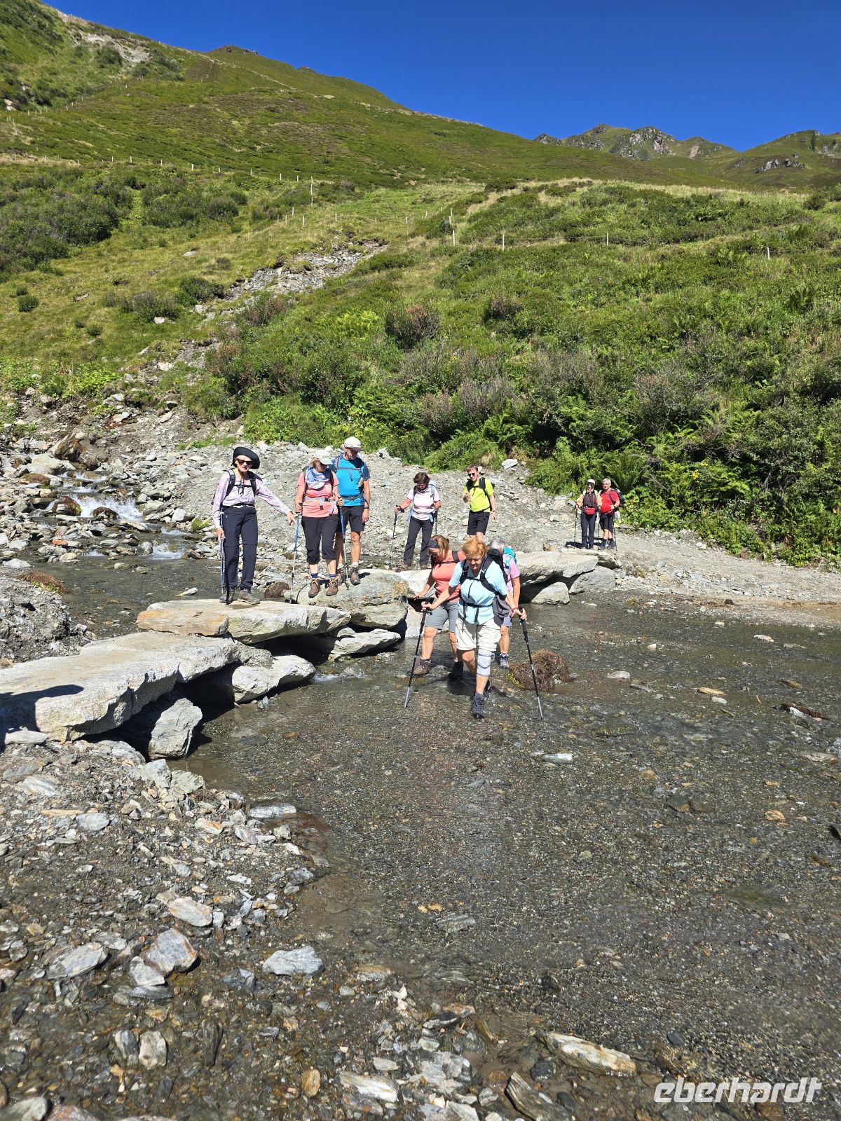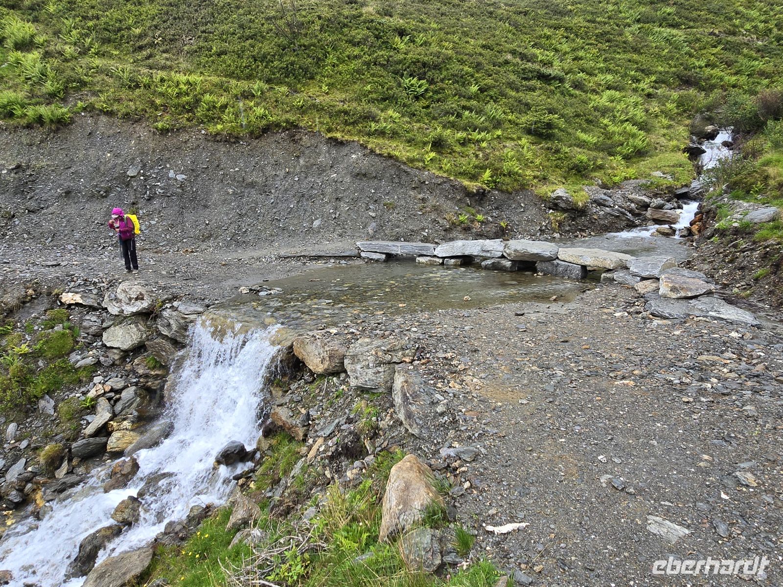 Auch heute wieder waren Wasserfälle und kleine Gebirgsbäche unsere ständigen Begleiter. Durch die wunderschöne, vom Gletscherbach geschaffene Ebene liefen wir stetig bergauf und erreichten schließlich das Pfitscherjochhaus und die italienische Grenze auf 2275 Metern Höhe.