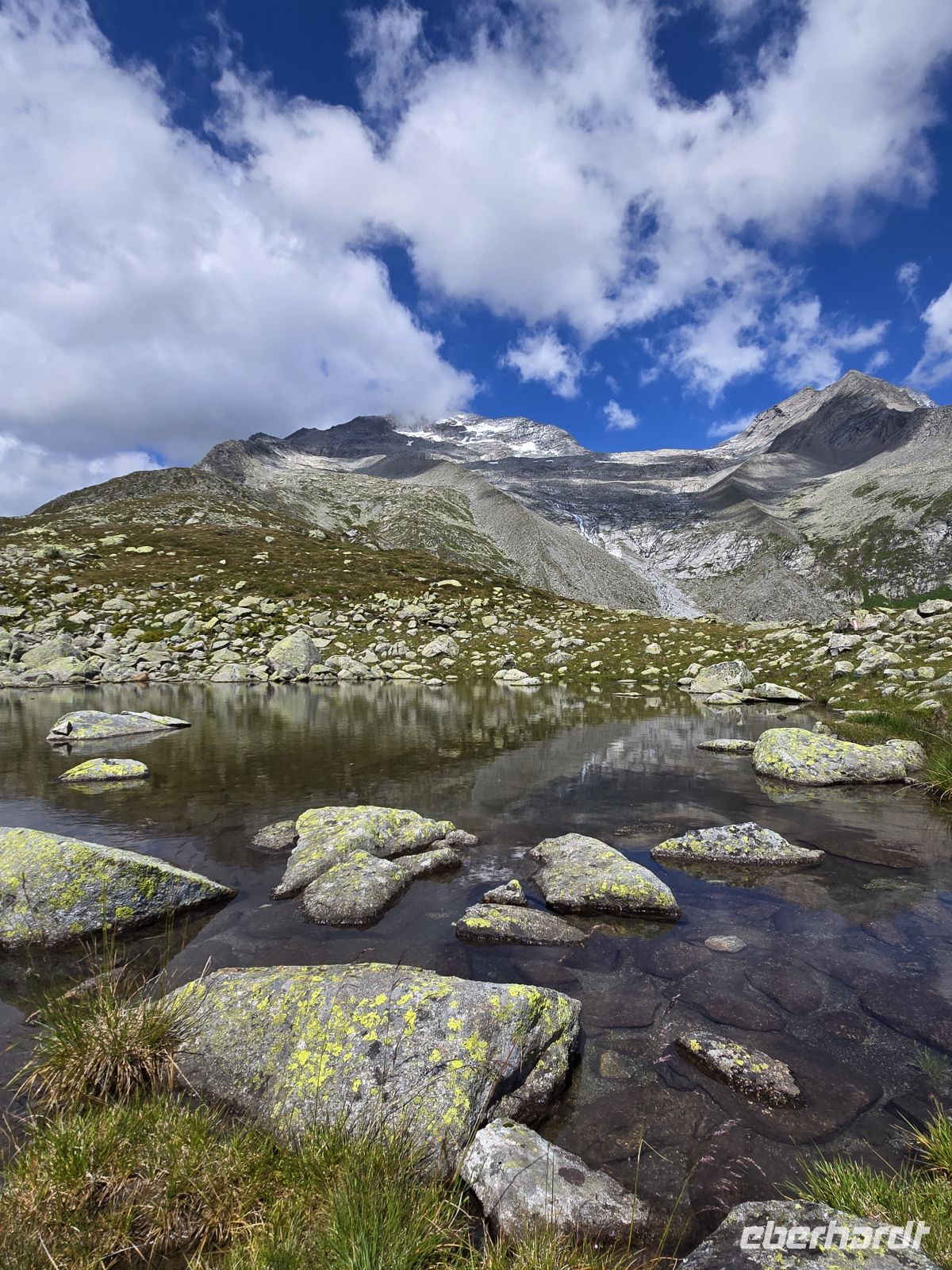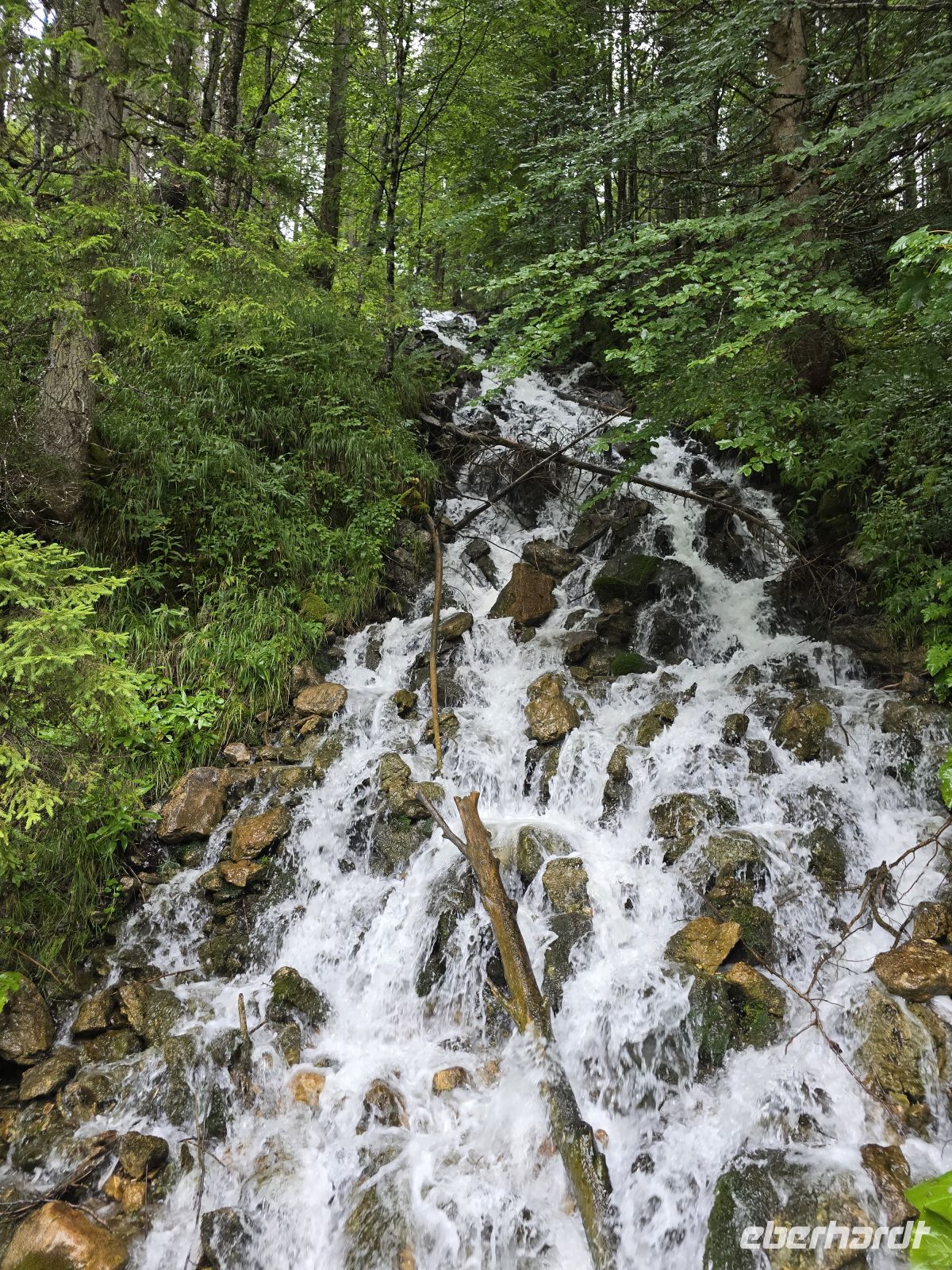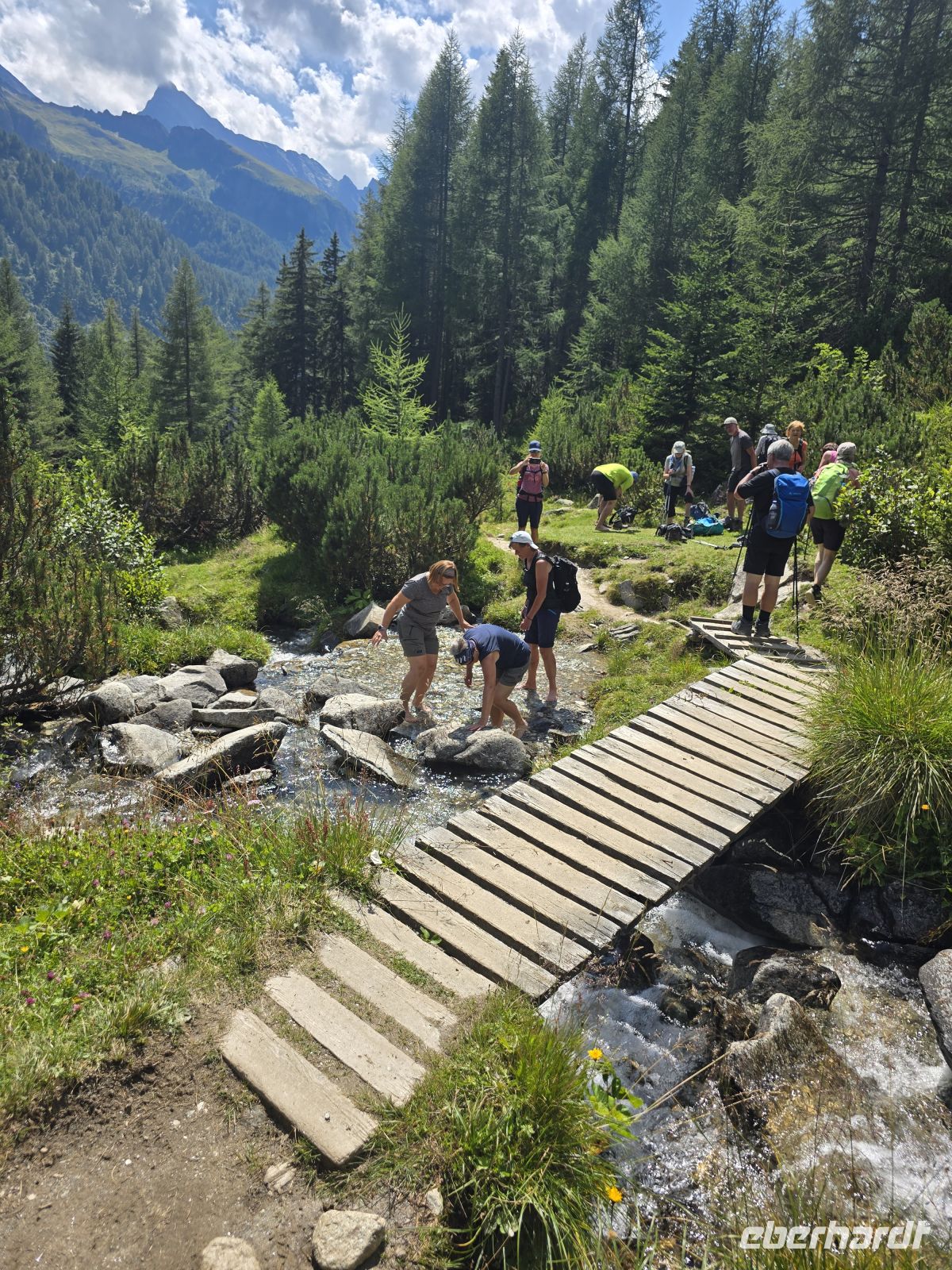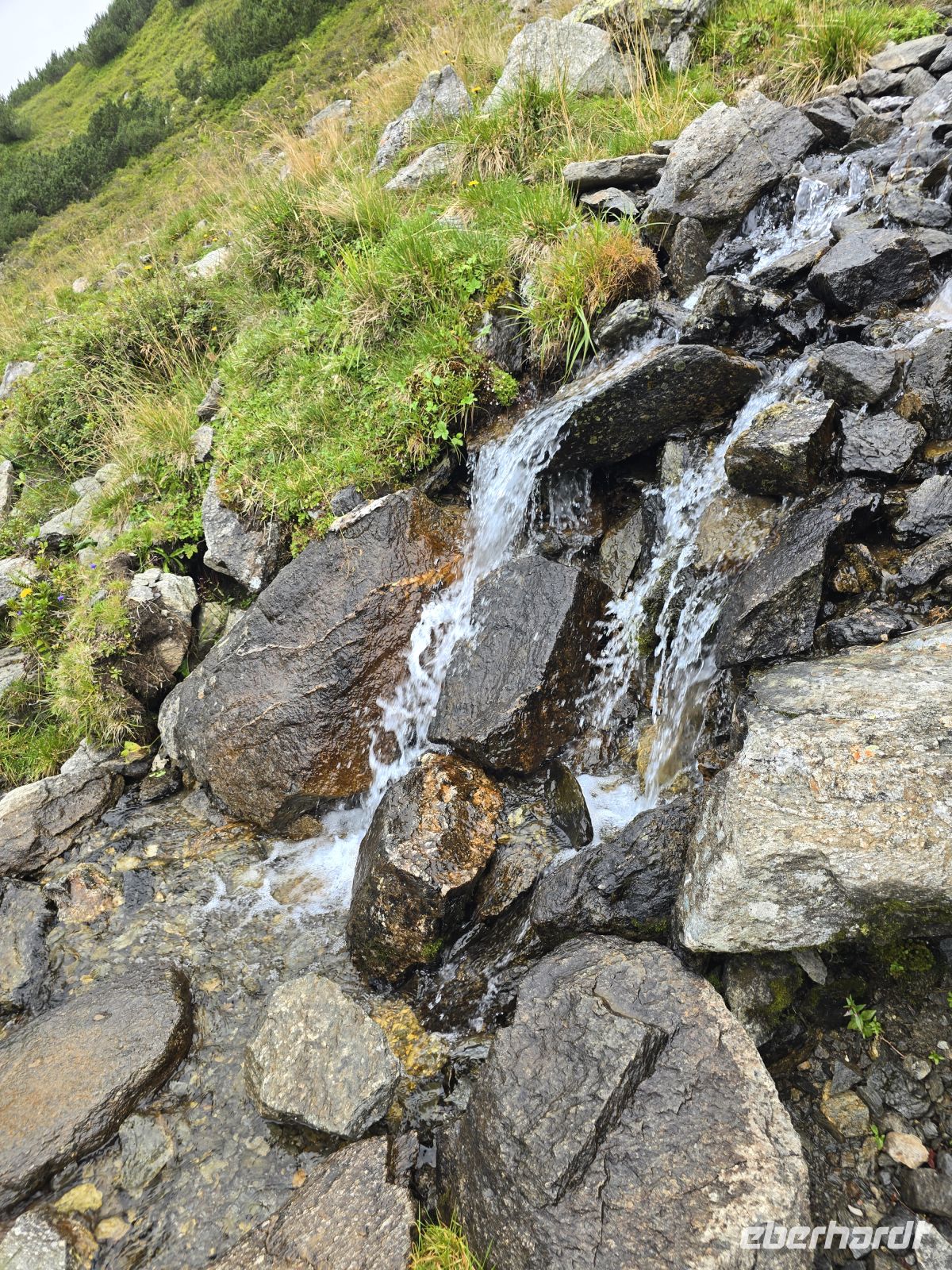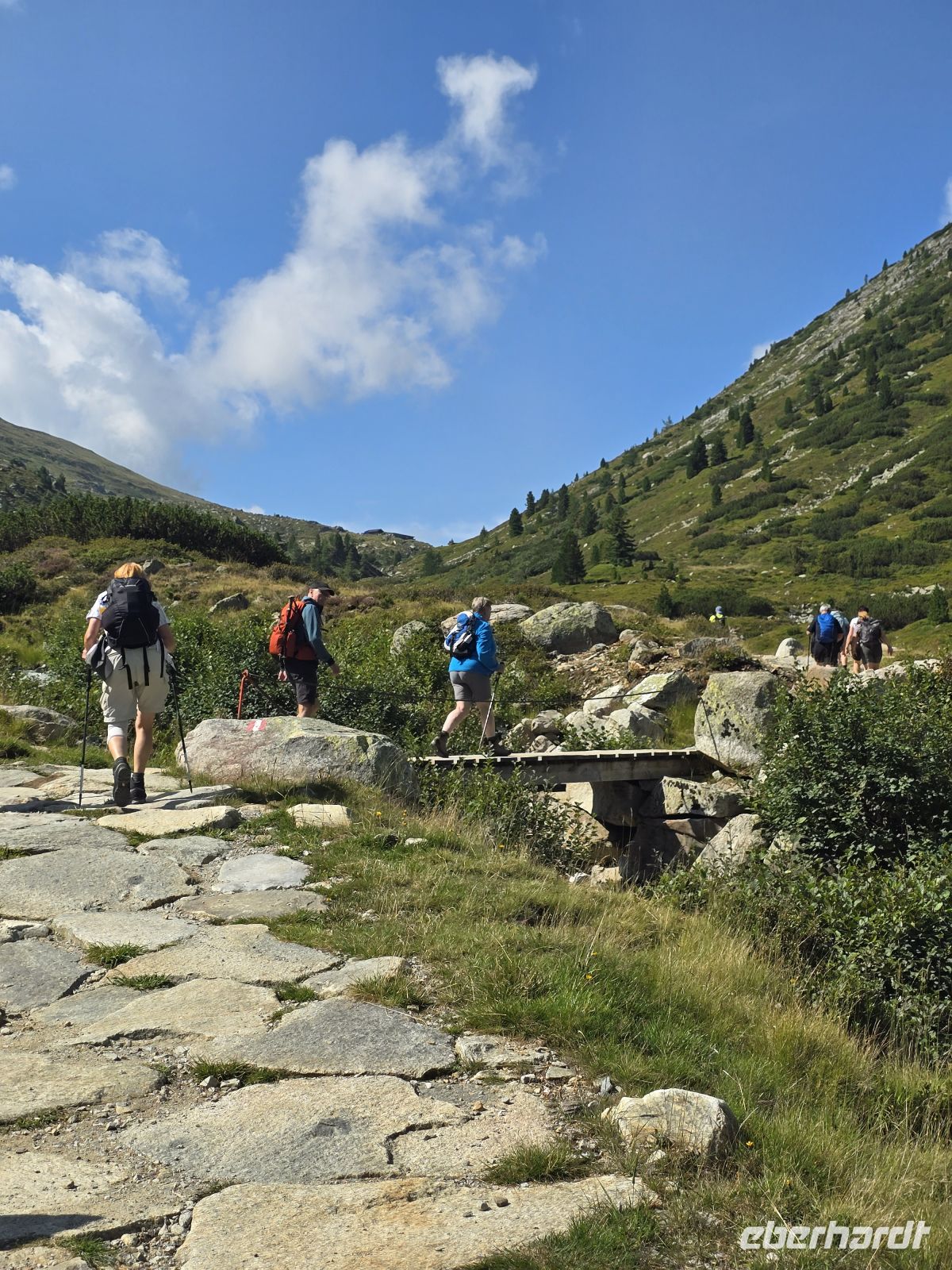 Auch heute wieder waren Wasserfälle und kleine Gebirgsbäche unsere ständigen Begleiter. Durch die wunderschöne, vom Gletscherbach geschaffene Ebene liefen wir stetig bergauf und erreichten schließlich das Pfitscherjochhaus und die italienische Grenze auf 2275 Metern Höhe.