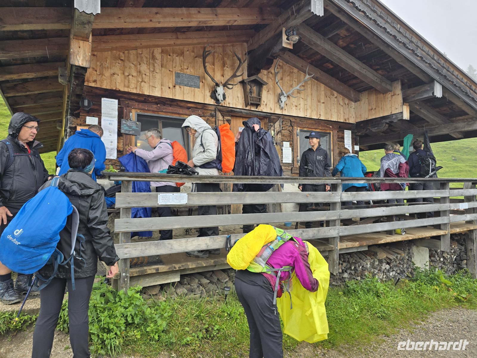 Aber frisch gestärkt, unter anderem auch mit dem leckeren Schokoladenkuchen der Welt, begaben wir uns wieder auf Schusters Rappen in die Welt der Berge. Vorbei ging es an der Pfundsalm auf 1640 Metern Höhe. Auf dem Weg hoch zum Sidanjoch auf 2127 Metern kamen wir an einer hübschen Jagdhütte vorbei und gelangten schließlich am späten Vormittag zur Rastkogelhütte. Hier ließen wir uns wieder mit leckerem österreichischen Essen verwöhnen.