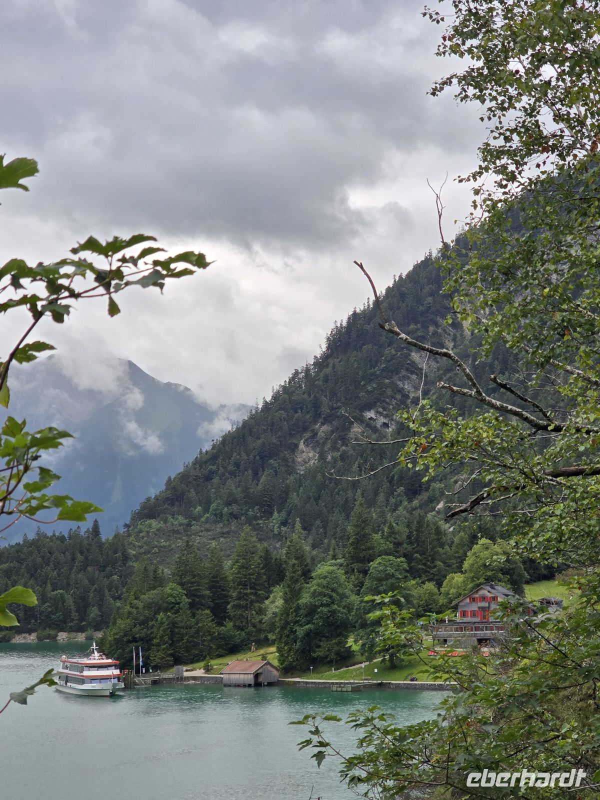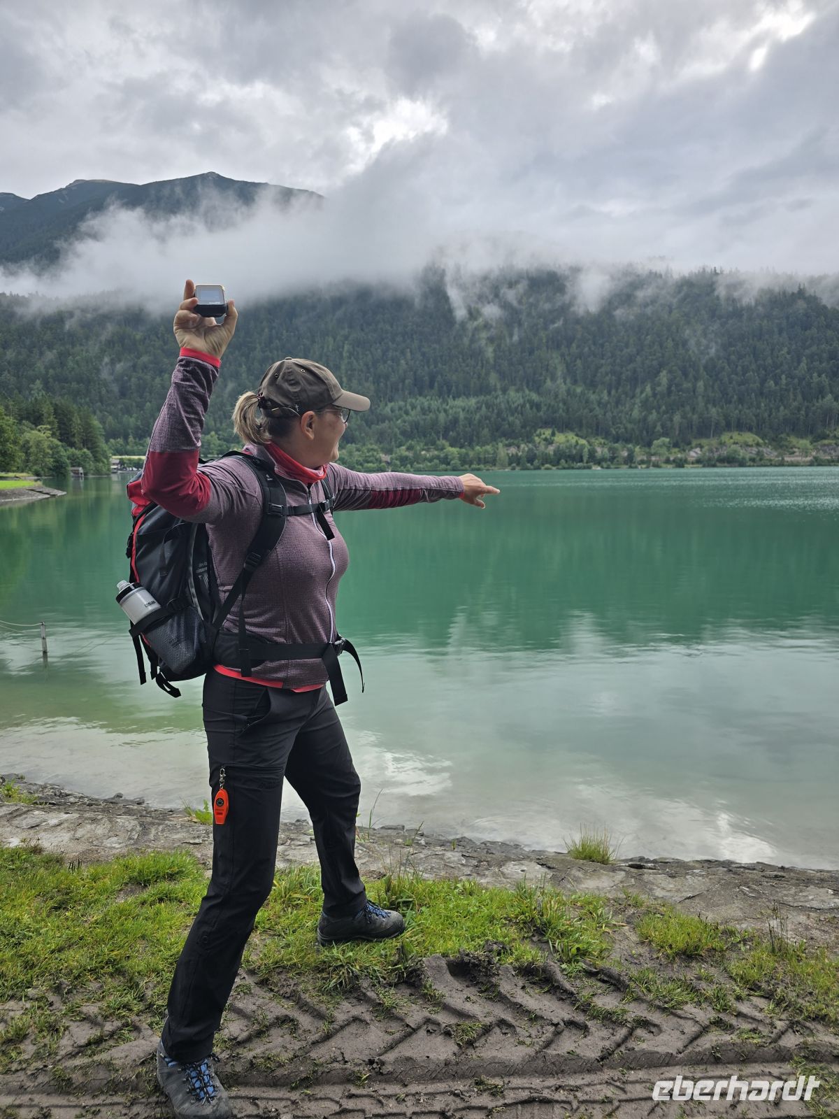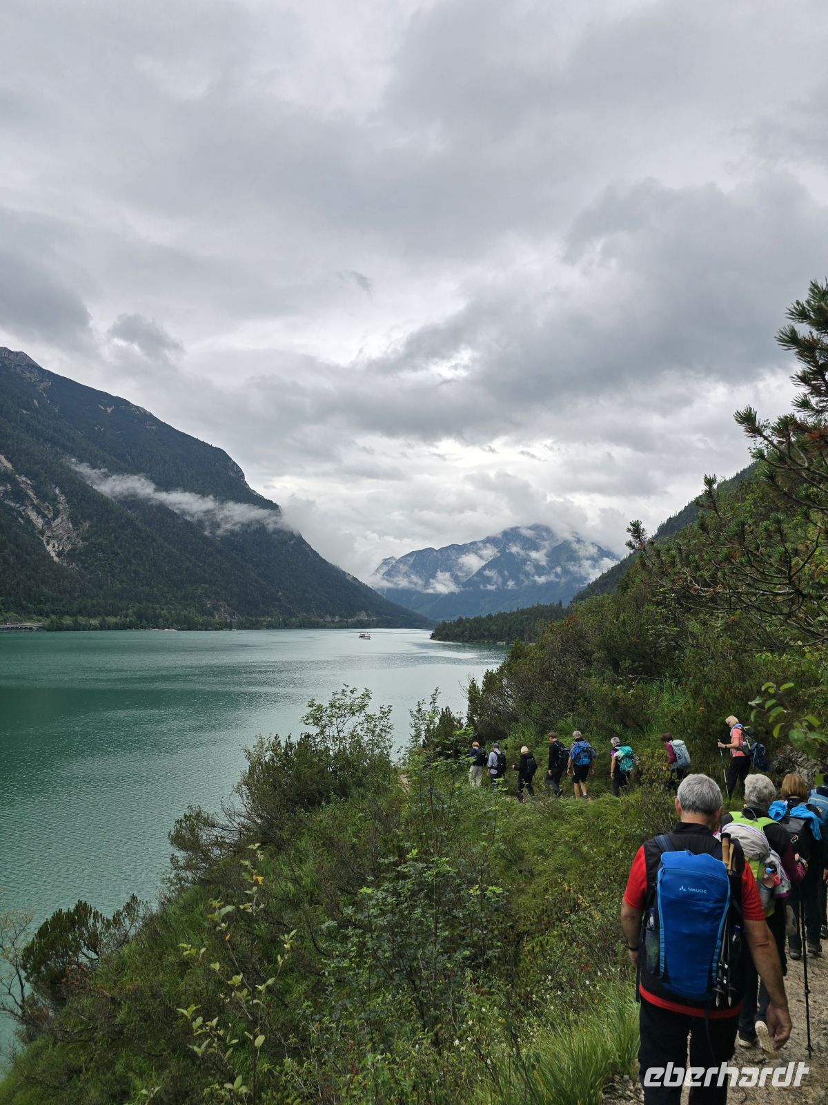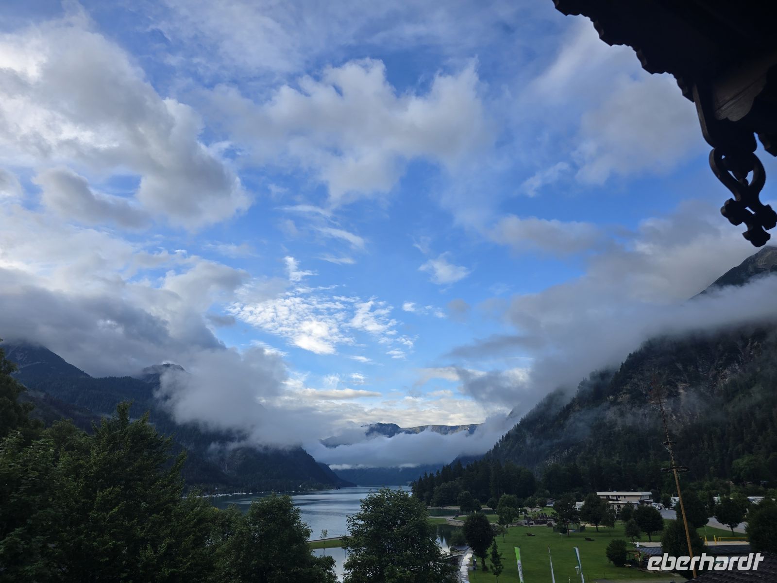 Aufgewacht, die Sonne lacht. Naja, noch nicht ganz. Es war stark bewölkt am Morgen, aber trotzdem sahen wir schon den einen oder anderen blauen Flecken Himmel. Kalt war es trotzdem. Wir genossen unser Frühstück und wanderten los auf dem Weg mit der wohl schönsten Aussicht in Richtung Geisalm, immer entlang des Westufers des Achensees – dem Fjord Tirols. Schon nach einigen Metern Weg wurde es uns langsam zu warm und wir begannen, uns „auszuzwiebeln“. Genügend Sachen hatten wir ja an.