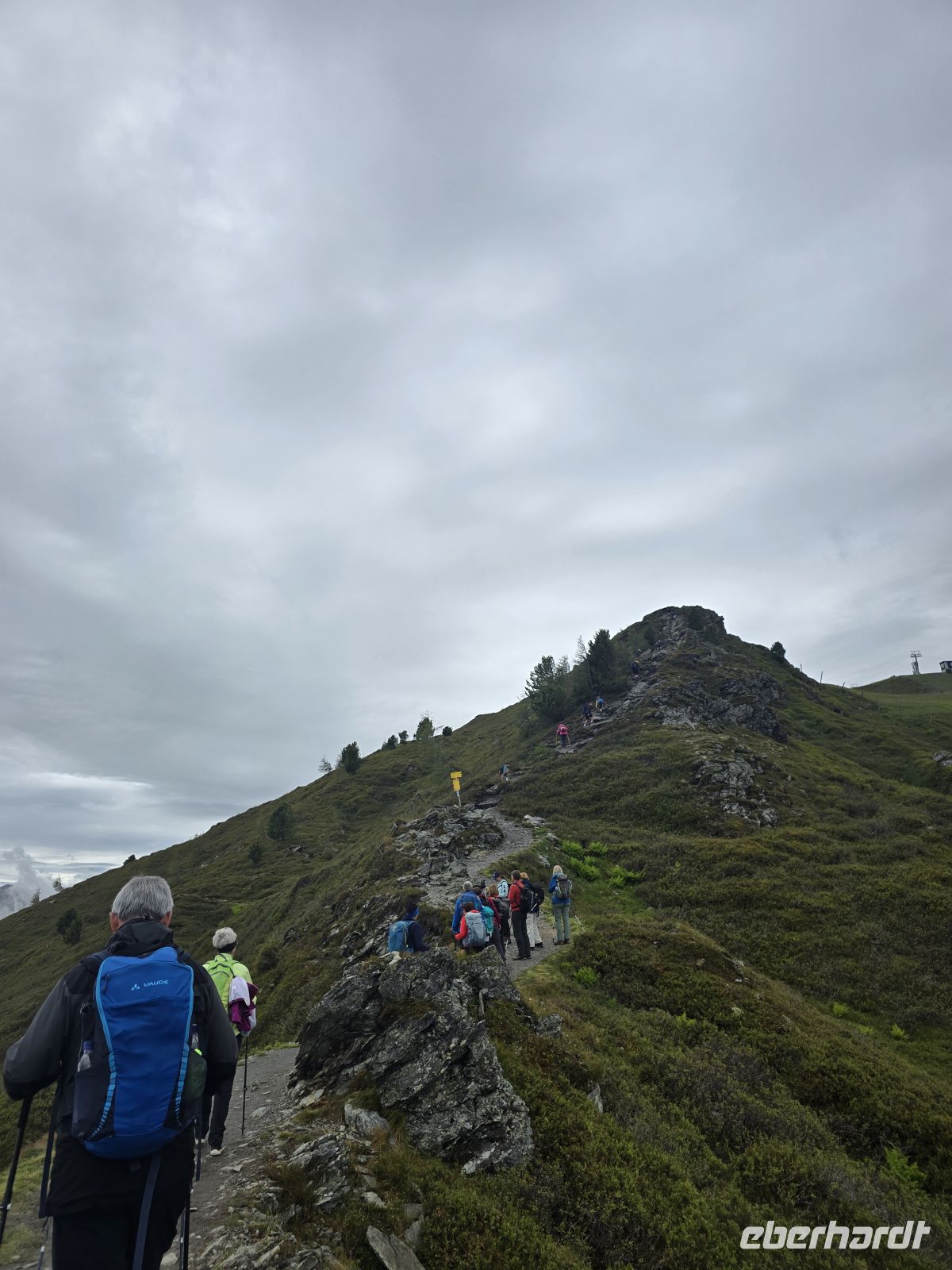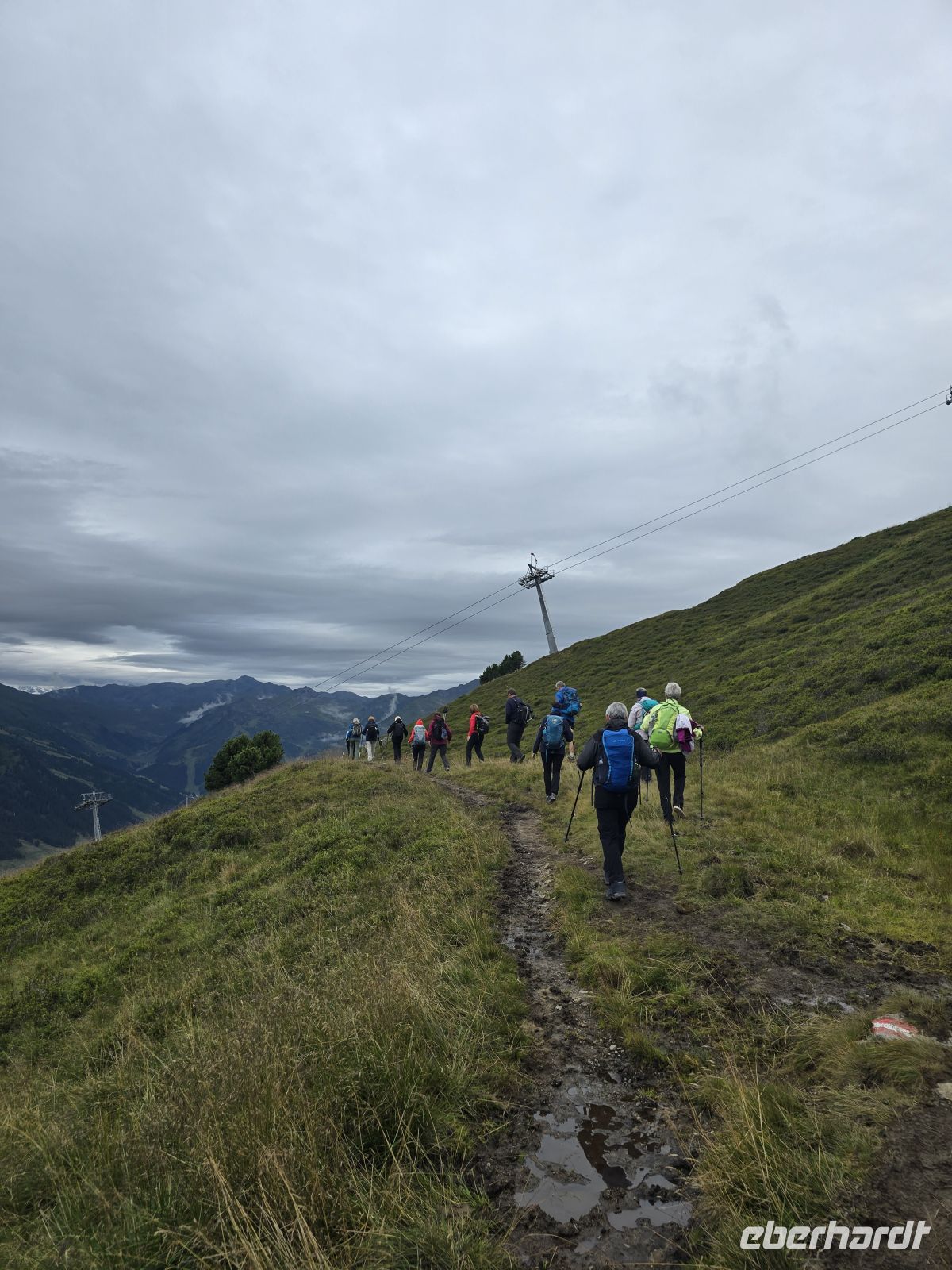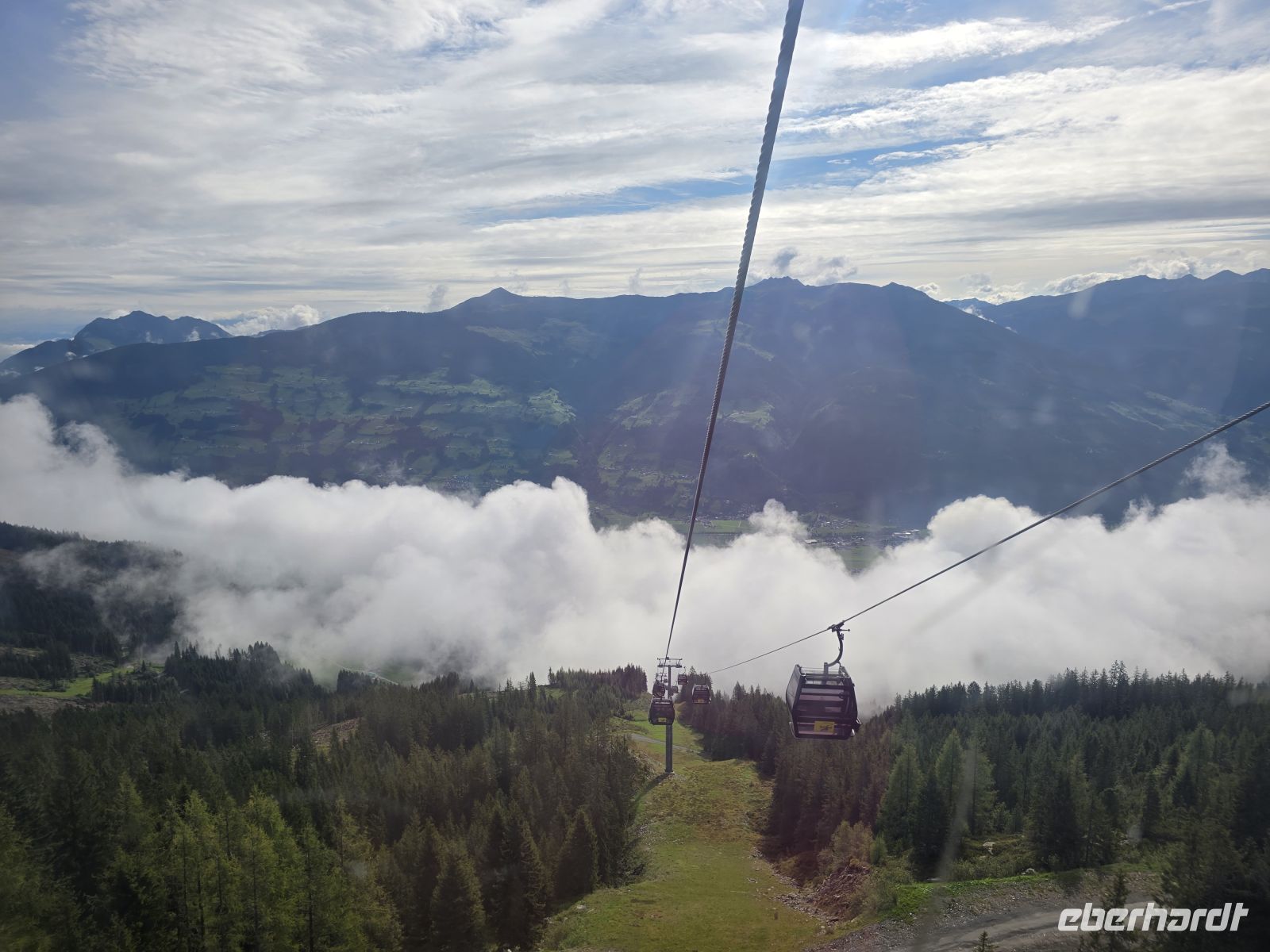 Unsere heutige Tour startete gleich gegenüber vom Hotel an der Talstation der Spieljochbahn. Mit dieser schwebten wir den Berg hinauf bis zur oberen Station auf 1920 Metern Höhe. Bei kühlen Temperaturen, aber wenigstens trockenen Fußes, begannen wir unsere heutige Wanderung. Wir hatten einen fantastischen Ausblick auf die umliegende Bergwelt des Zillertals, das Karwendel- und Rofangebirge und bis zum Wilden Kaiser im Salzburger Land.