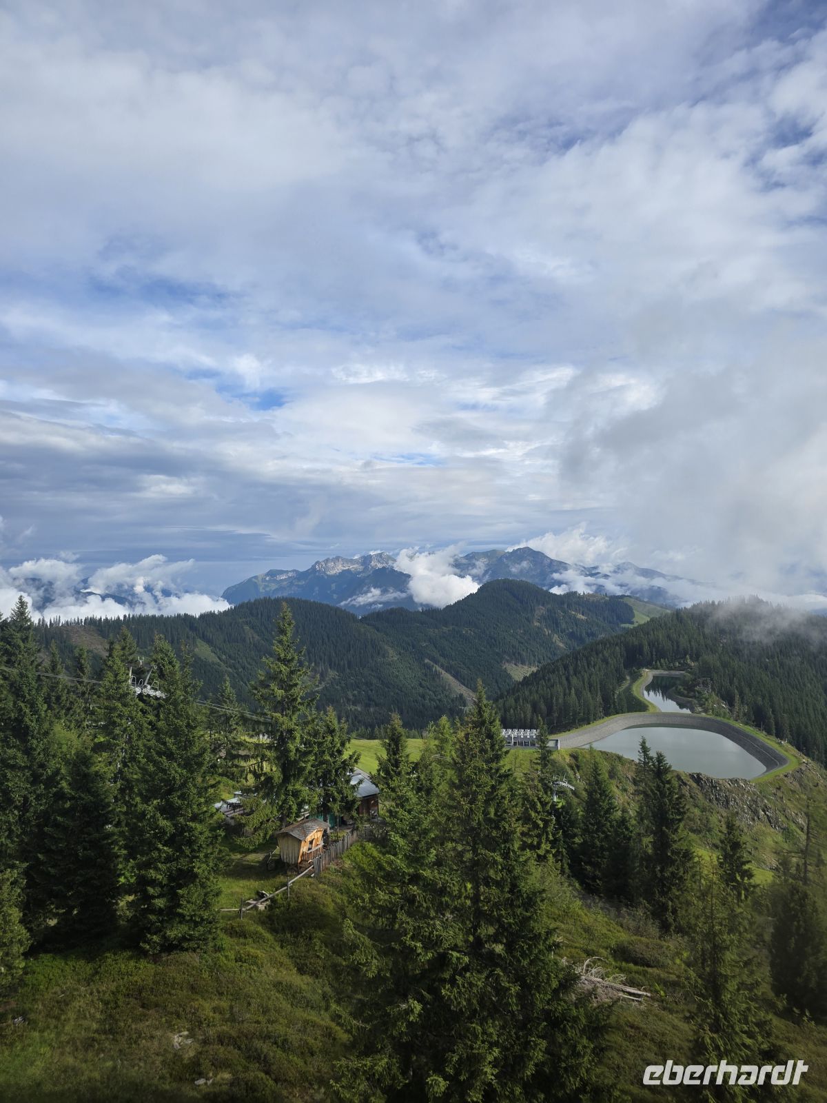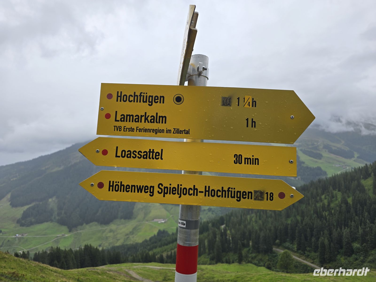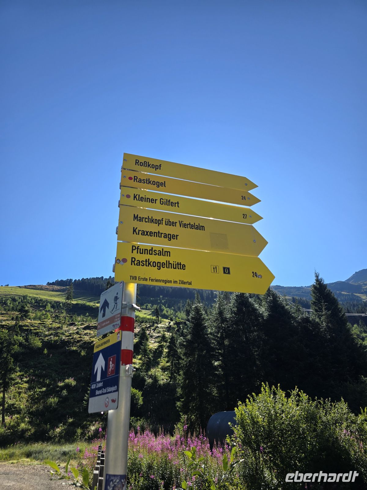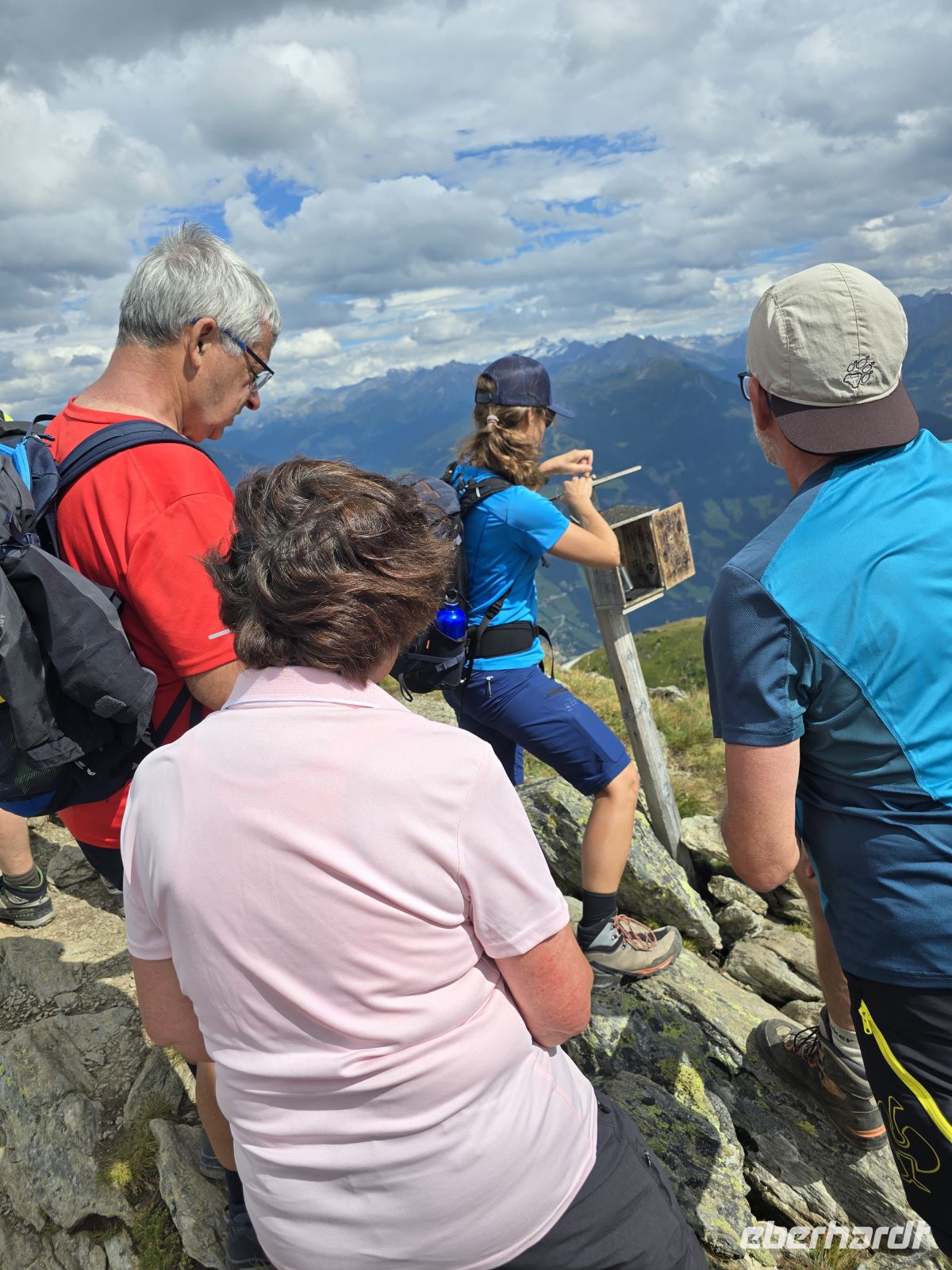 Unsere heutige Tour startete gleich gegenüber vom Hotel an der Talstation der Spieljochbahn. Mit dieser schwebten wir den Berg hinauf bis zur oberen Station auf 1920 Metern Höhe. Bei kühlen Temperaturen, aber wenigstens trockenen Fußes, begannen wir unsere heutige Wanderung. Wir hatten einen fantastischen Ausblick auf die umliegende Bergwelt des Zillertals, das Karwendel- und Rofangebirge und bis zum Wilden Kaiser im Salzburger Land.