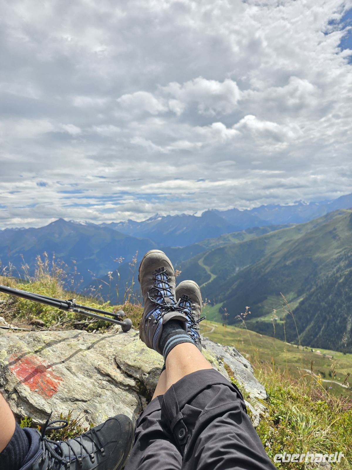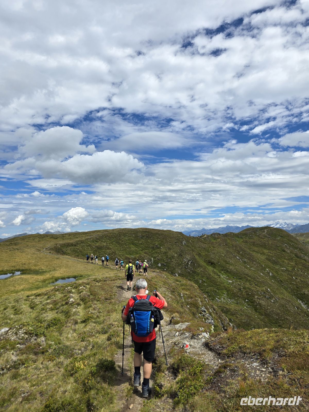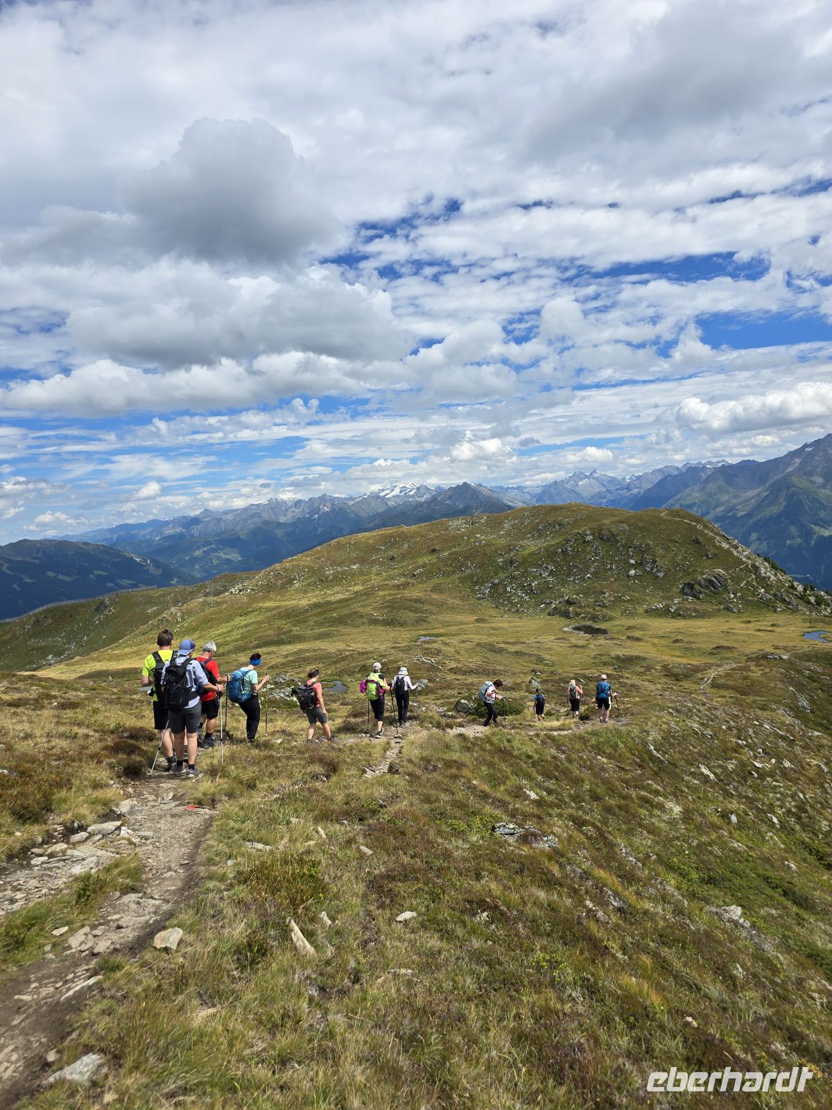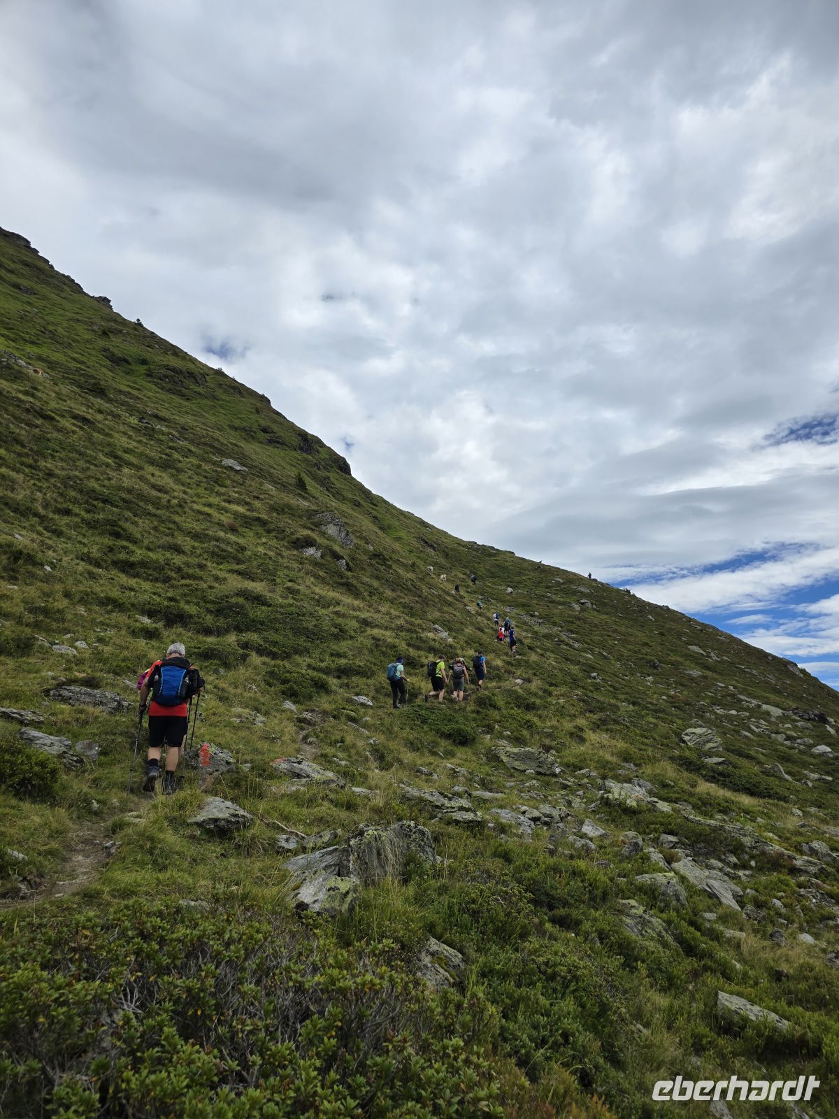 Das haben wir uns alles beim nächsten Aufstieg zum Mitterwandkopf, der mit 2280 Metern heute der höchste Punkt auf unserer Tour war, gleich wieder abgewandert. Es war herrlich, auf dem Sattel unterhalb des Kreuzjoches zu laufen, aber auch sportlich.
