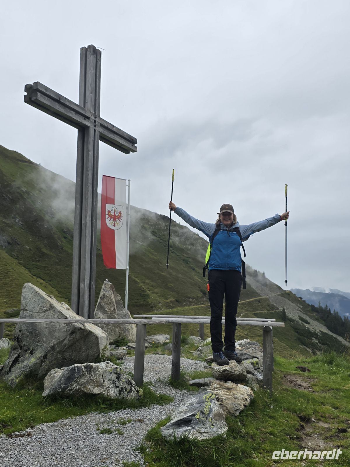 Unser erster Fotostopp – das Kreuz des Spieljochgipfels. Ein herrliches Fotomotiv mit einem unglaublichen Weitblick. Wir wanderten weiter auf dem Steig am Bergrücken empor, auf dem Höhenweg „Spieljoch – Hochfügen“.