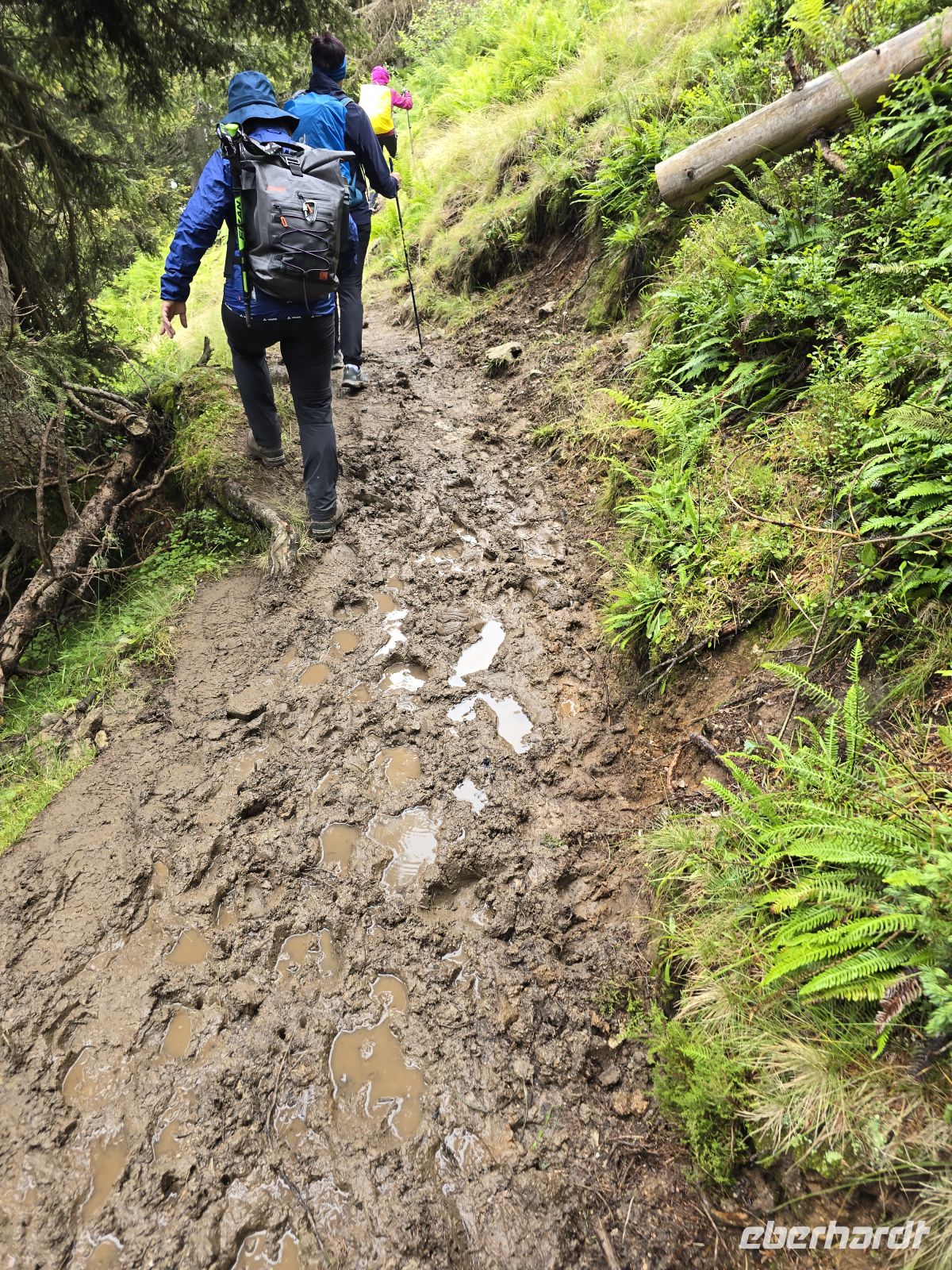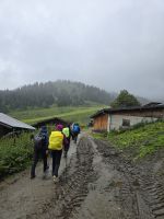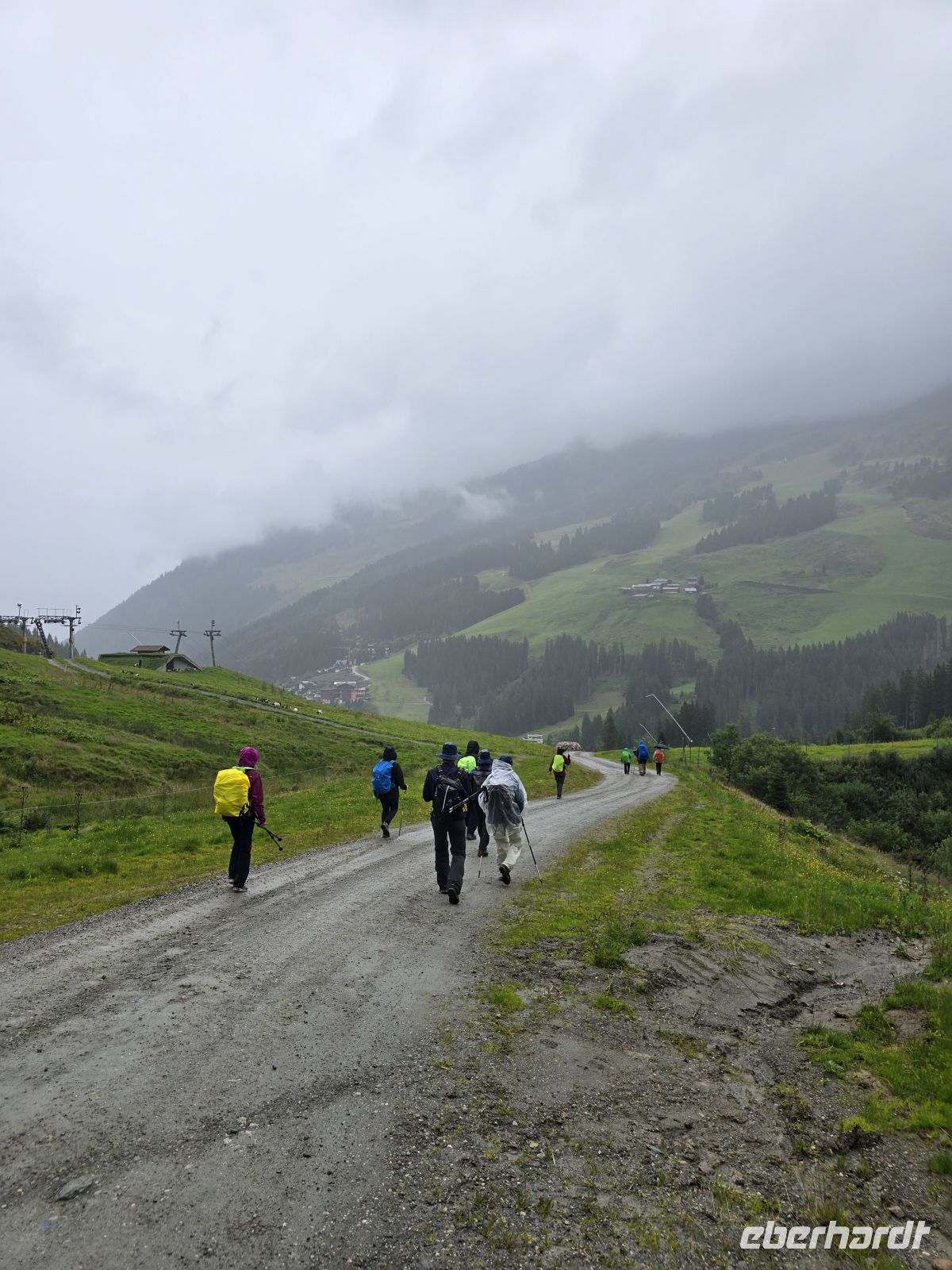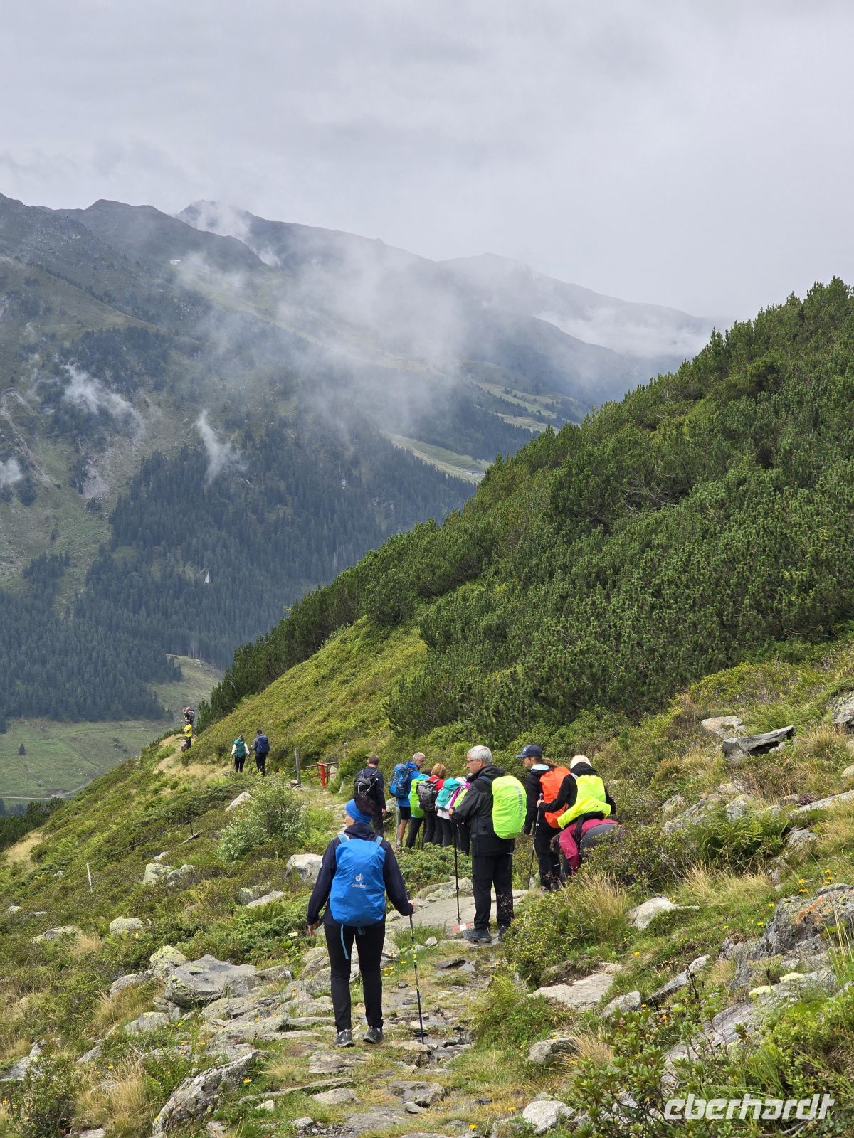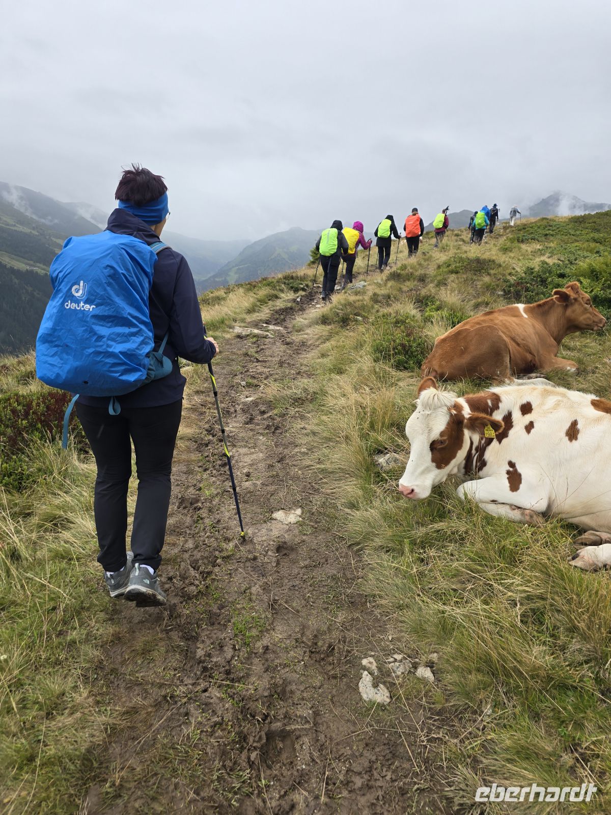 Frisch gestärkt und erholt ging es langsam an den Abstieg. Wir durchquerten viele Weidegebiete und hielten immer Ausschau nach Murmeltieren. Aber außer glücklich vor sich hin mampfenden Kühen haben wir keine anderen Tiere gesehen. Ein putziger kleiner Maulwurf wuselte am Wegesrand durch die Wiese. Frohgemut, zwischen Matsch und Regenrinnsalen – mittlerweile hatte sich der Regen wieder eingestellt – liefen wir durch die, auch bei Regen, wunderschönen Almlandschaften der Tuxer Alpen in Richtung unseres heutigen Hotels, das Lamark in Hochfügen. Durchnässt, aber glücklich, gelangten wir am Nachmittag zum Hotel. Der Check-in ging wieder wie von Zauberhand. Viele von uns nutzten wieder die freie Zeit bis zum Abendessen, um sich in der Sauna aufzuwärmen. Auch dieser Tag endete bei einem Abendessen mit einem tollen Menü, zubereitet von einem bekannten Fernsehkoch in Österreich.