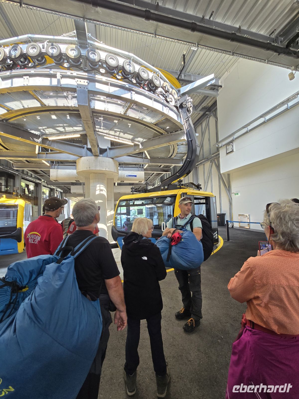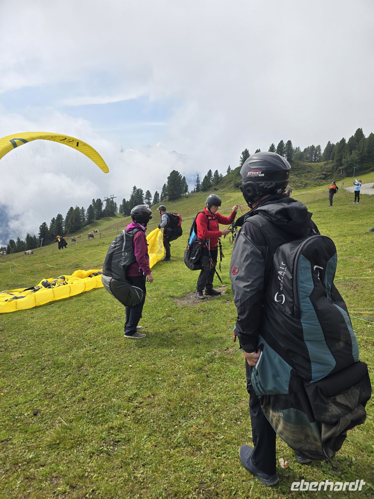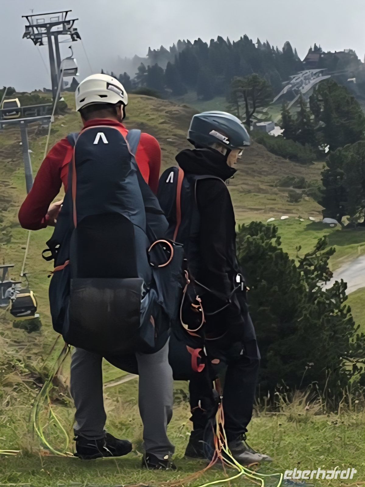 3 Wagemutige hatten sich für einen Tandemgleitschirmflug entschieden und fuhren mit mir die Penken Bergbahn bis ganz hinauf zum Gipfel auf 2000 Meter Höhe. In der Talstation trafen wir schon auf unsere lustigen Tandempiloten und halfen ihnen mit dem Gepäck wieder nach oben zu gelangen. Nach einer sehr professionellen Einweisung blieb uns auch kaum noch Zeit, es uns anders zu überlegen, und schwupps, hingen wir in der Luft und schwebten erstmal durch ein dichtes Wolkenfeld. Auch ein Erlebnis der besonderen Art, wenn man so gar nichts sieht und nur den Wind rauschen hört. Aber der Ausblick, als wir aus den Wolken rauskamen, war atemberaubend. Keine Wörter können das Hochgefühl beschreiben, wenn man durch das Zillertal fliegt, Runden mit Greifvögeln dreht und dabei 1400 Höhenmeter überwindet, um wieder in Mayrhofen zu landen. Ein unbeschreiblich schönes Erlebnis.