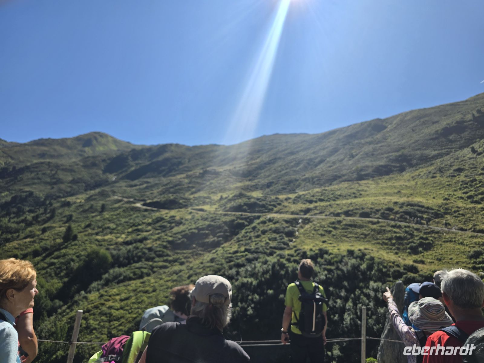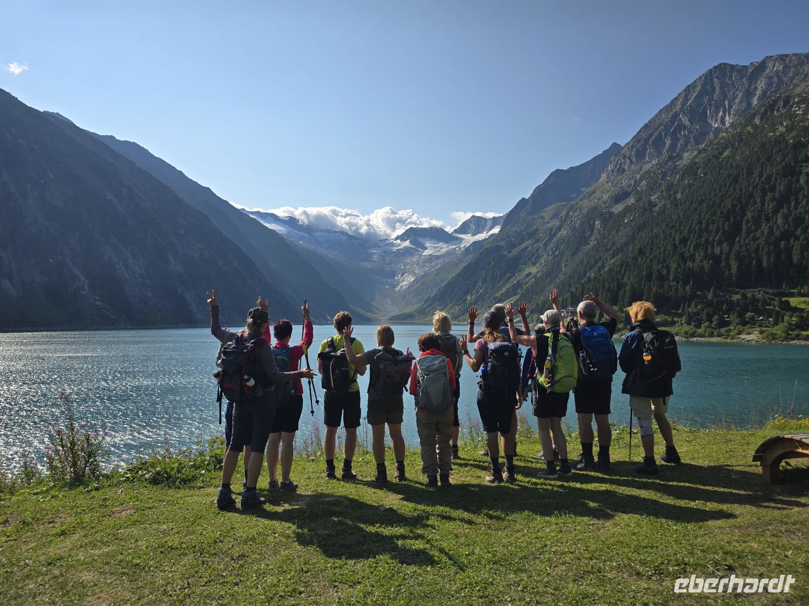 Zuerst wurden wir zum Ausgangspunkt der Wanderung, dem Schlegeis-Stausee auf 1800 Meter Seehöhe, gefahren. Das Panorama über den hellblauen See mit den dahinterliegenden Gletschern ist überwältigend. Ebenso beeindruckend ist die Staumauer mit einer Höhe von 131 Metern.