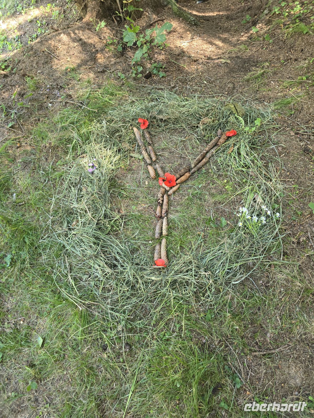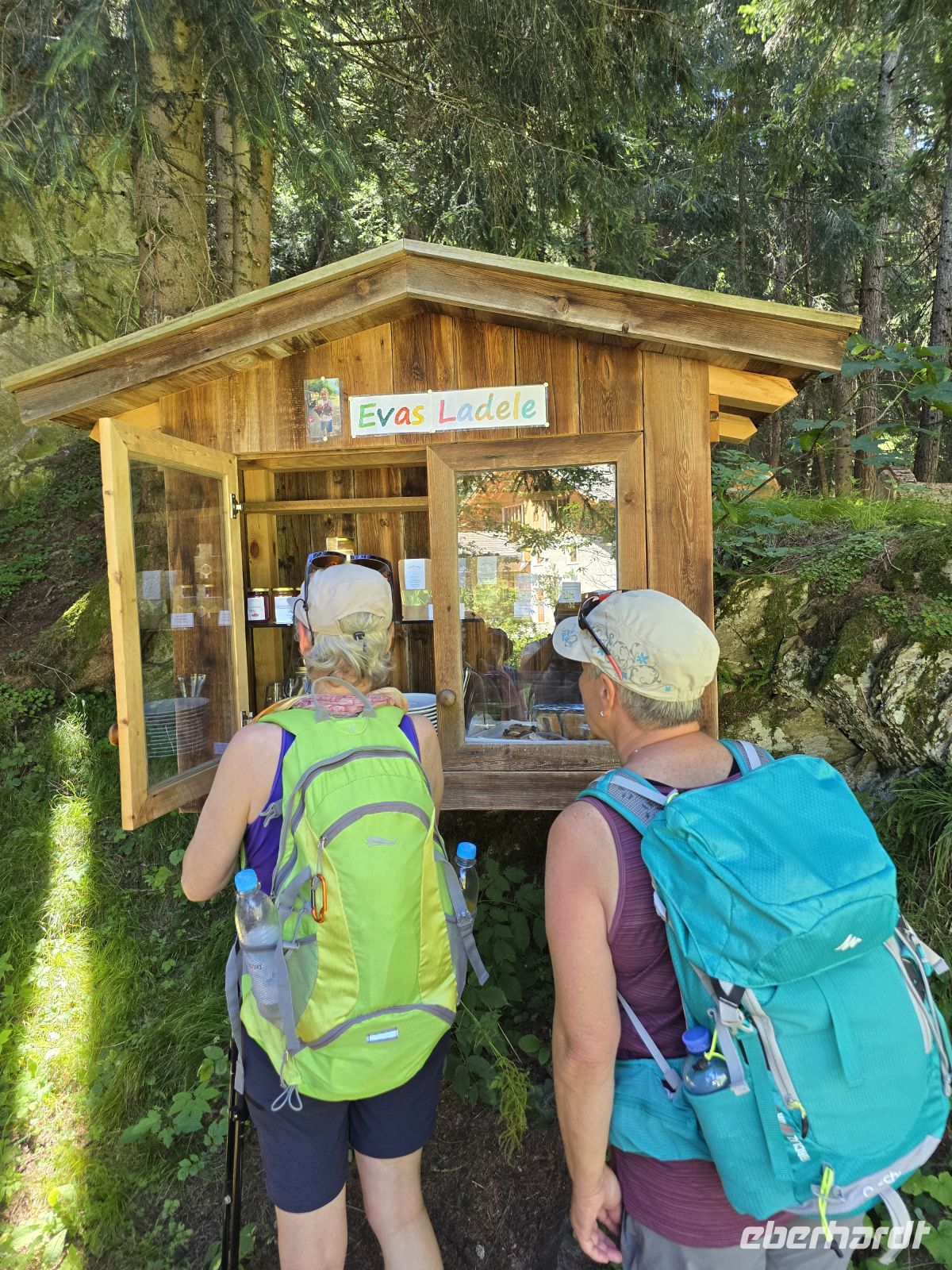 Nach dem Frühstück liefen wir, bei wieder strahlendem Sonnenschein, entspannt los. Über Waldwege, durch kleine urige Bergdörfer, querfeldein oder manchmal auch über kurze Passagen auf der Straße liefen wir Schritt für Schritt unserem Ziel näher. Unterwegs entdeckten wir Evas Hoflädle, einen Glasschrank mit einem leckeren Kuchenangebot, Honig und anderen tollen Dingen, gleich daneben eine wunderschöne Sitzecke aus Holzstämmen, die wir gleich für ein ausgiebiges Picknick in Beschlag nahmen. Und je mehr wir über unsere merkwürdige letzte Übernachtung nachdachten, umso mehr mussten wir darüber lachen. Immer nach dem Motto: „Wenn einer eine Reise tut, kann er was erzählen!“ Und je später der Tag, desto mehr haben wir gelacht.