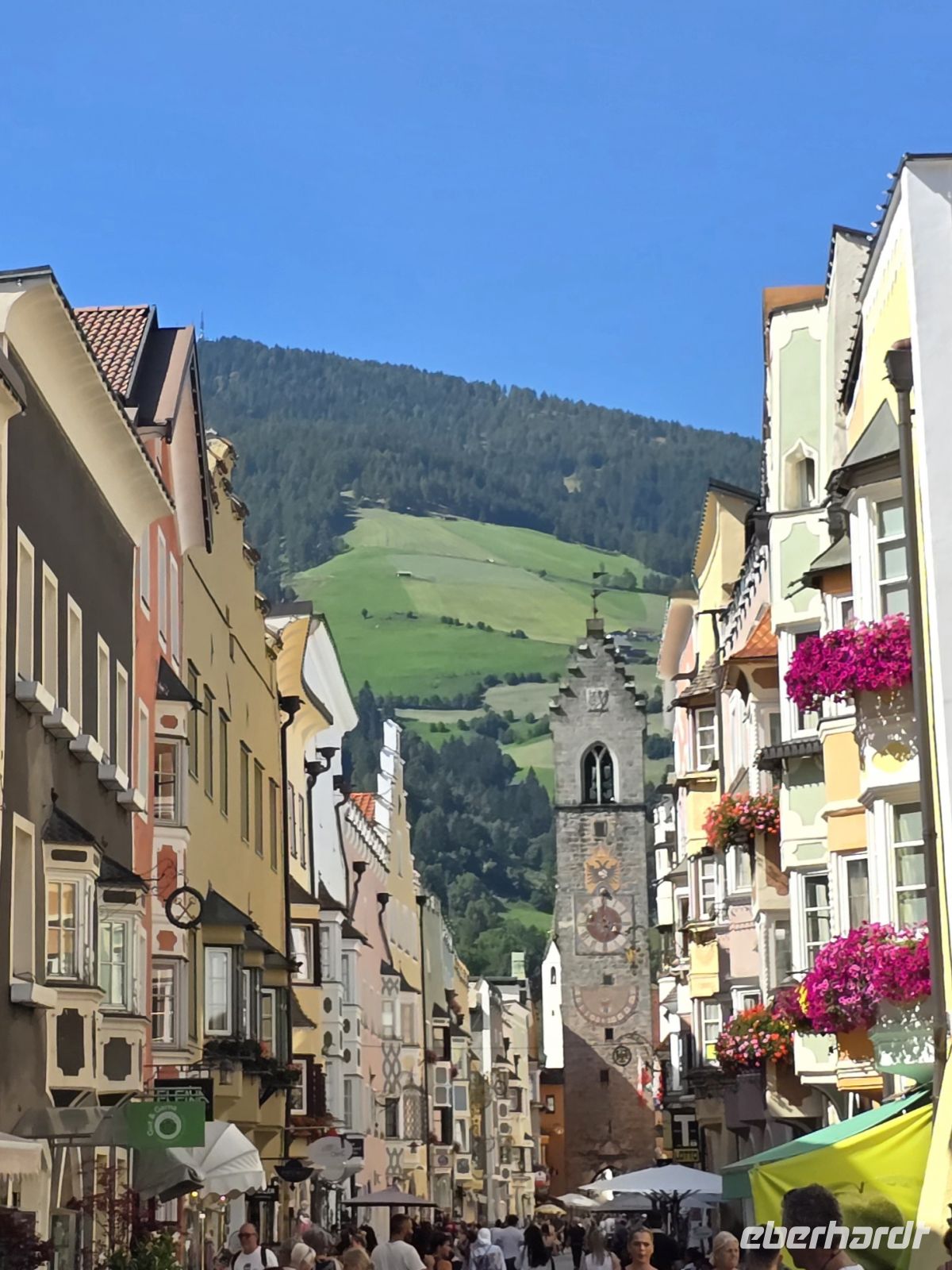 Schließlich erreichten wir Sterzing. Das Ziel lag vor uns. Glücklich und geschafft stürmten wir die Touristeninformation und erhielten eine offizielle Urkunde für die Alpenüberquerung, und wer wollte, auch einen Pin. Zur Feier des Tages ließen wir uns ein hervorragendes Eis munden, bevor wir unser letztes Hotel, das Steindl’s, erreichten. Auch hier gab es wieder eine Sauna, die trotz der heißen Außentemperaturen gut genutzt wurde.