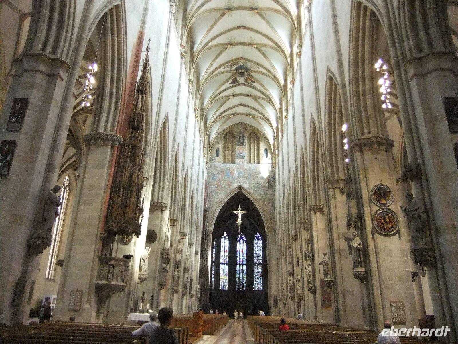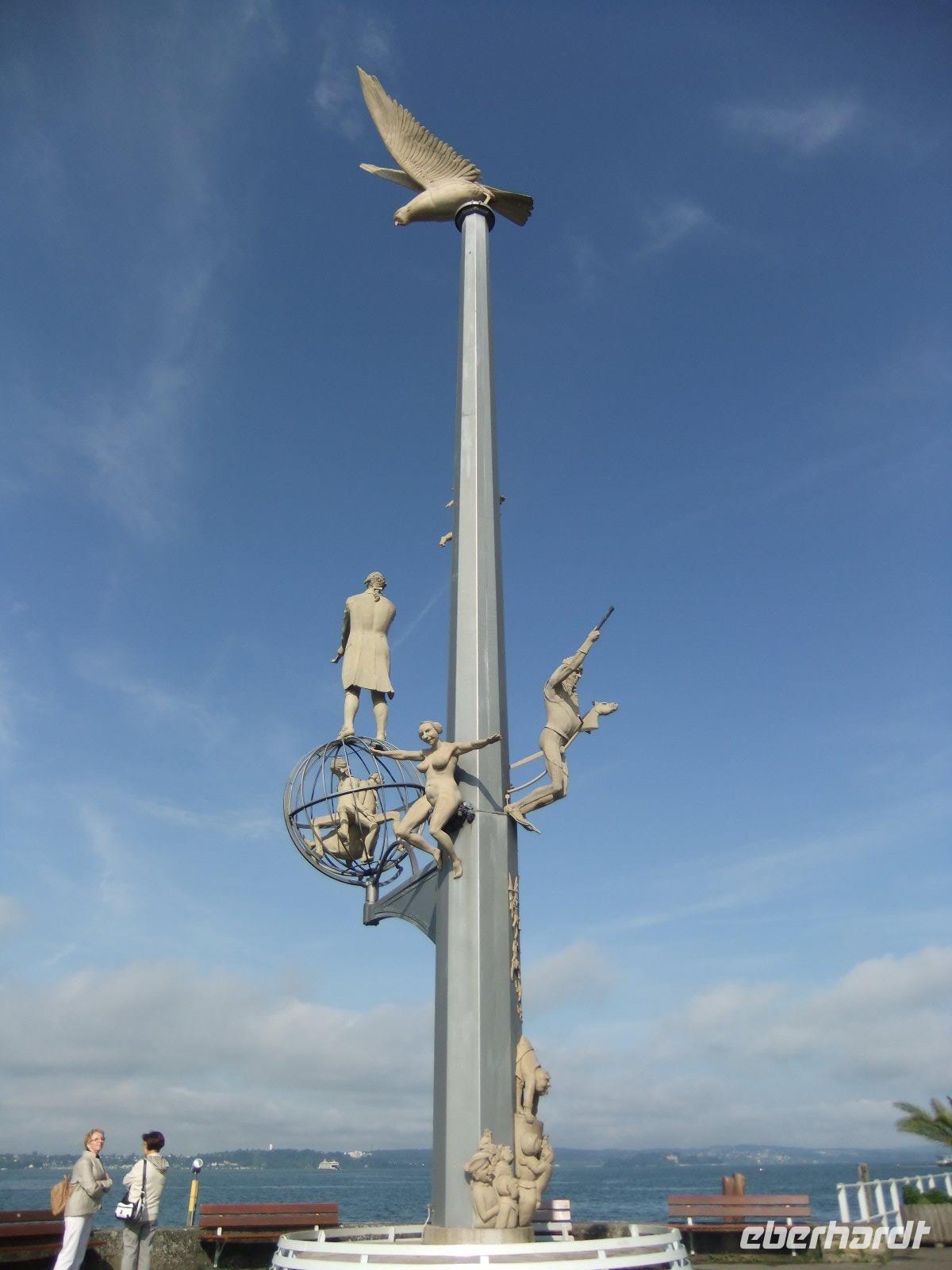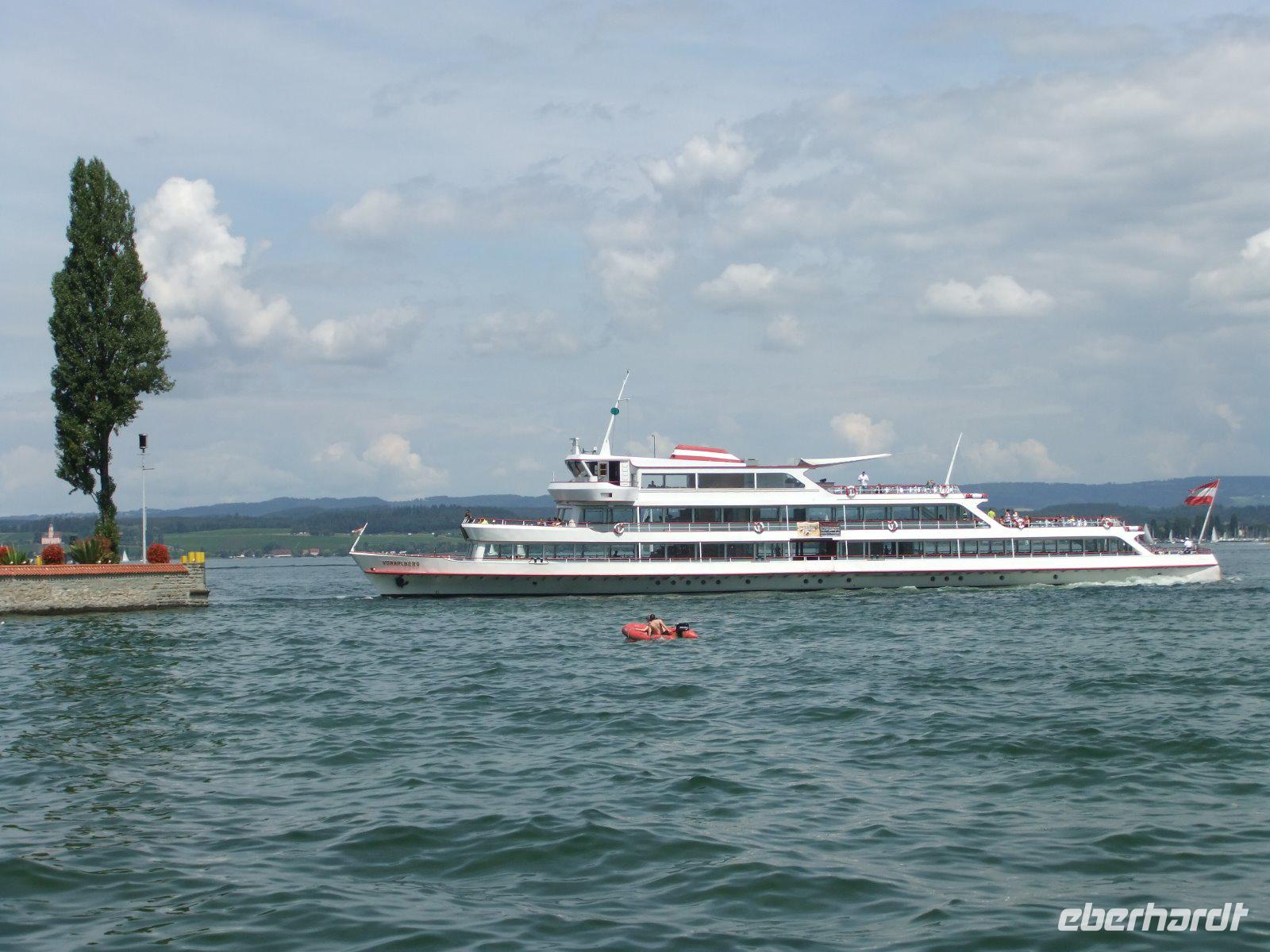 37 Reisegäste freuen sich heute auf ihre Fahrt an den Bodensee. Pünktlich stehen alle bereits an den Zustiegsstellen und in Münchberg ist unsere Gruppe komplett. Trotz zahlreicher Baustellen kommen wir sehr gut voran. So erreichen wir 15 Uhr Ulm. Hier legen wir eine Pause ein. Vom Parkplatz ist es nicht weit bis zum Ulmer Münster. Der Kirchturm ist mit 161,53 Metern der höchste der Welt. Auch das Innere der Kirche ist sehenswert, beispielsweise das imposante Chorgestühl, die Kanzel mit Schalldeckel und die Orgel. Sie besteht aus fast 9000 Pfeifen, wobei die größte 10 Meter misst. Dem Münster gegenüber befindet sich das Stadthaus, ein sehr moderner weißer Bau. Wenige Schritte weiter präsentiert sich das Ulmer Rathaus. Vor allem die opulente Fassadenbemalung bewundern wir hier. Die Sonne meint es fast zu gut mit uns, denn das Thermometer zeigt inzwischen schon 31 Grad. So finden sich nach 1 ½ Stunden wieder alle am Bus ein und wir setzten unsere Fahrt fort. Nun stehen wir doch noch im Stau, aber wir nutzen die Zeit, um uns per CD schon auf unseren morgigen Besuch der Bregenzer Festspiele einzustimmen.