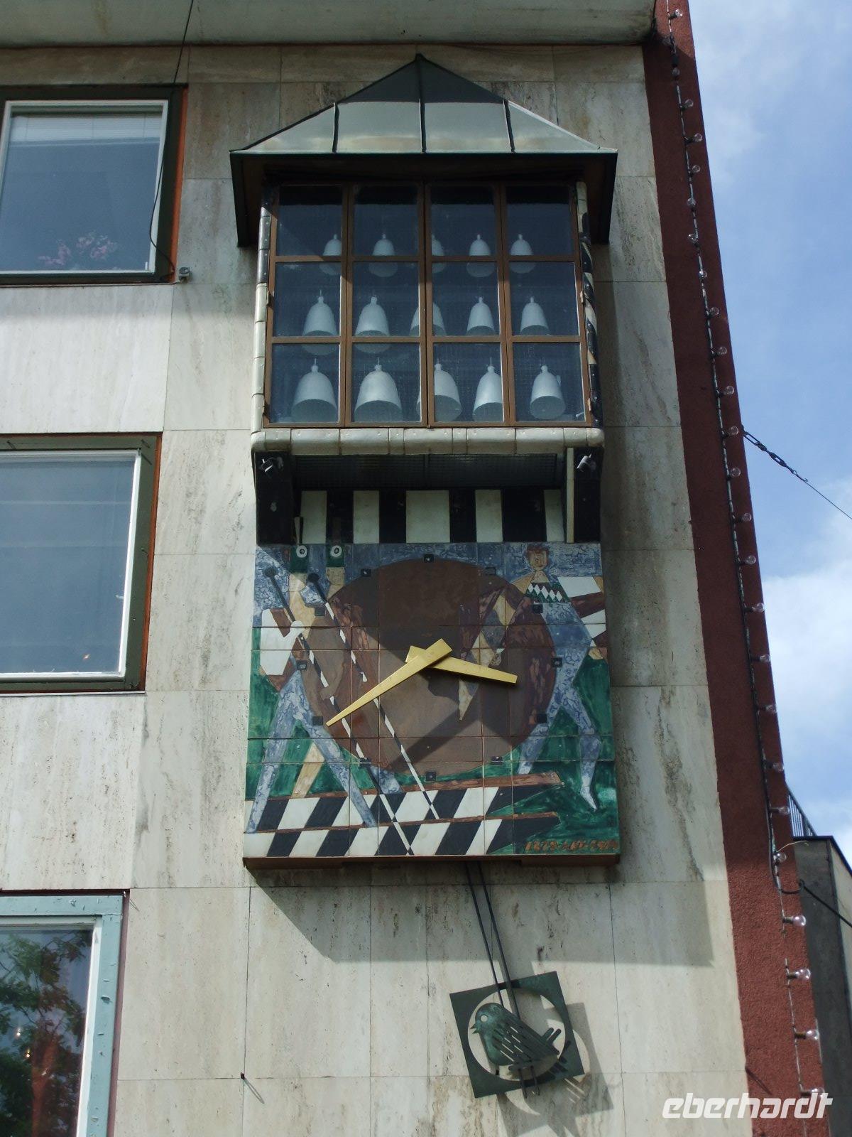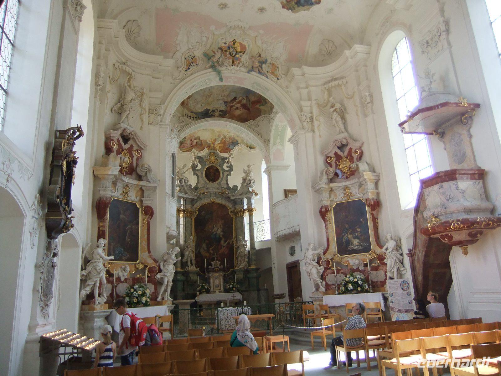 Den heutigen Tag wollen wir in Bregenz verbringen. Vom Hotel aus starten wir gemeinsam mit zwei Stadtführerinnen per Bus Richtung Zentrum. Da es leider regnet fahren wir zuerst zur Pfarrkirche St. Gallus. Am Eingang begrüßen uns die Sandsteinfiguren Petrus und Paulus. Ein besonderes Kleinod ist der Silberaltar im Inneren. Wir dürfen auch bis zum Chorgestühl und zum Hochaltar. Dann geht es mit dem Bus zurück zur Fußgängerzone. Hier teilen wir uns in zwei Gruppen auf. Die eine Gruppe spaziert hinauf zur historischen Altstadt, wo auch der Wahrzeichen von Bregenz, der Martinsturm steht. Er gilt als der größte Zwiebelturm Mitteleuropas. Die andere Gruppe geht zur Seekapelle und zum Vorarlbergmuseum. Hier ist zur Zeit die Ausstellung „Bregenzer Festspiele 1946 - 2016" zu sehen. Zahlreiche Bühnenmodelle erinnern an die Aufführungen der vergangenen Jahre. Eigentlich wollten wir nun noch etwas durch Bregenz bummeln, doch leider regnet es inzwischen so heftig, dass uns Jens mit dem Bus wieder zum Hotel bringt. Hier lassen sich die meisten Gäste zur Mittagszeit typisch österreichische Schmankerln schmecken.