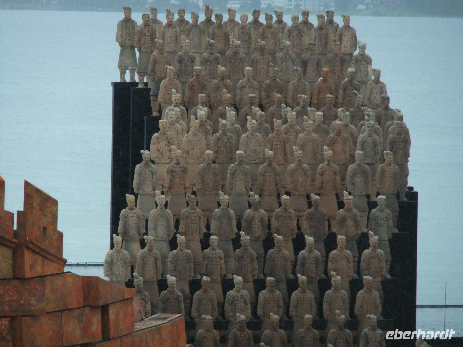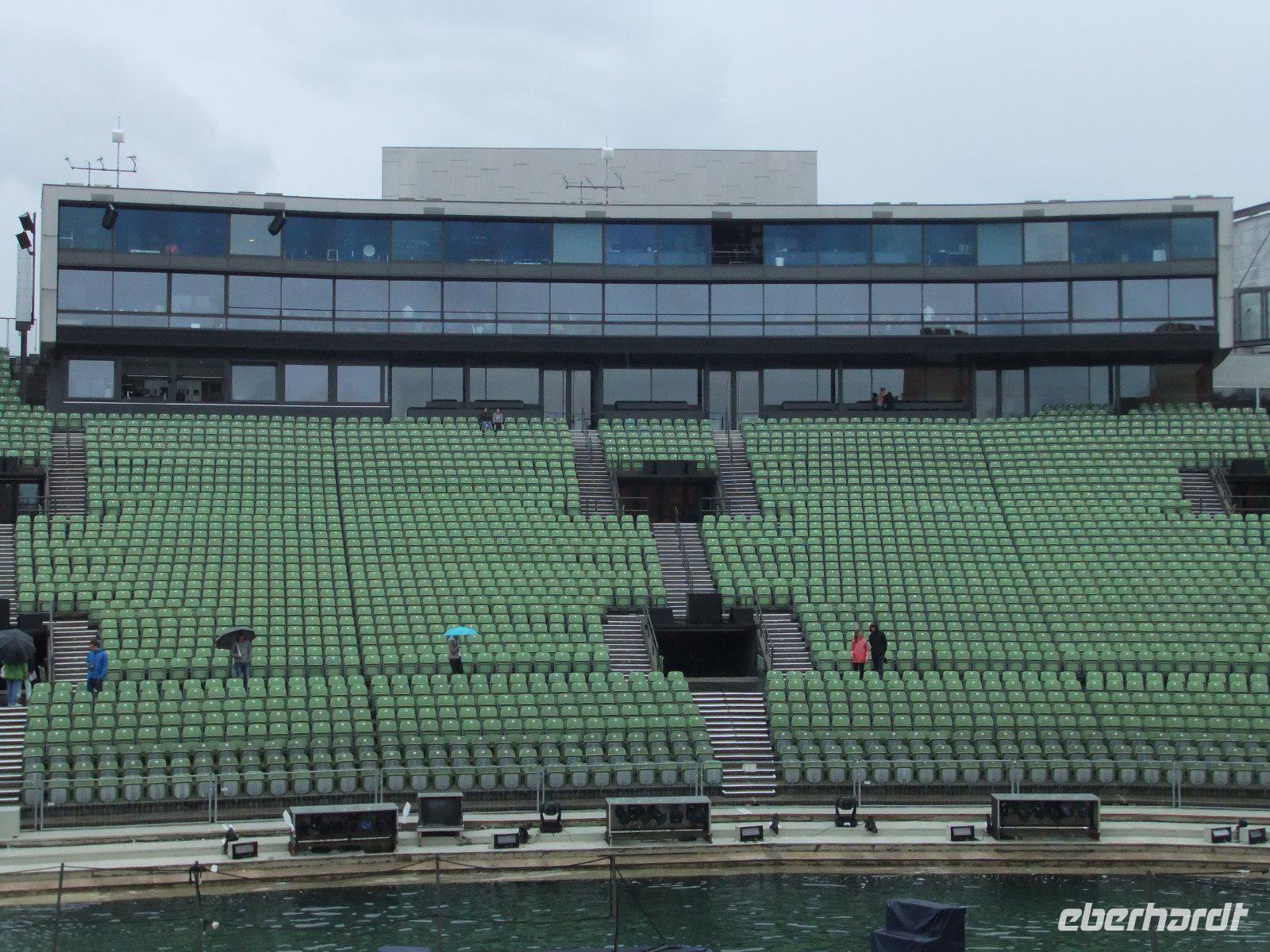 Am Nachmittag sind wieder alle Gäste startklar, denn wir wollen während einer Führung einen Blick hinter die Kulissen der Seebühne werfen. Zuerst nehmen wir in der VIP-Lounge Platz. Hier hat man natürlich den besten Blick auf die Bühne. Zur diesjährigen Aufführung von „Turandot" wir das Bühnenbild von einem Abbild der Chinesischen Mauer beherrscht. 27 Meter hoch und 72 Meter breit. Schaut man genauer hin, erkannt man, dass sie in ihrer Form einem Drachen ähnelt. Hinter ihr und auch vor ihr im See wachen 200 Soldatenfiguren. Sie sind der sagenumwobenen chinesischen Terrakotta-Armee nachempfunden. Wir erfahren Interessantes zur Geschichte der Bregenzer Festspiele und auch zur besonderen Akustik der Seebühne. Für diese sorgen u.a. 780 Lautsprecher, die rund um die Tribünen angebracht sind und das sogenannte „Richtungshören" ermöglichen. Dann geht es hinter die Bühne. Wir sehen von hier die große Tribüne, die 7000 Plätze umfasst und kommen auch den Terrakotta-Kriegern ganz nah. Nun schauen wir uns noch den Konzertsaal an, in dem während der Vorstellungen die Wiener Symphoniker spielen. Nach diesen interessanten Einblicken freuen wir uns umso mehr auf die Vorstellung am Abend.