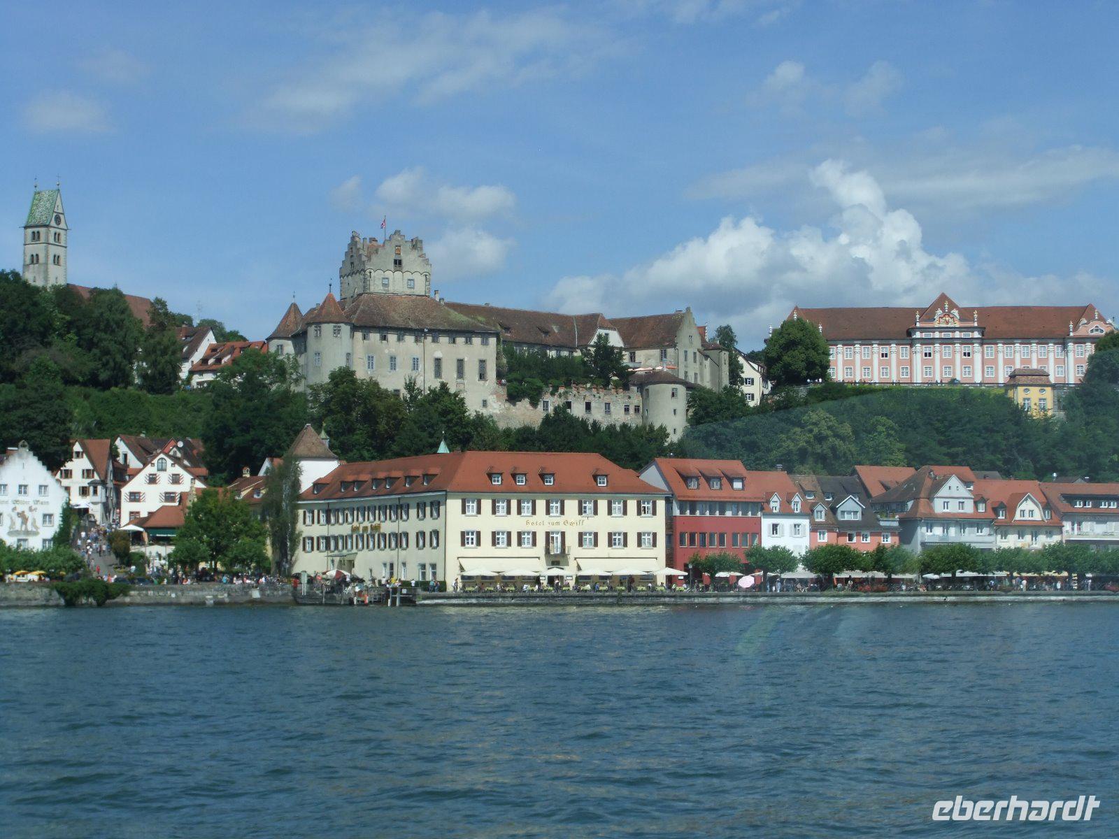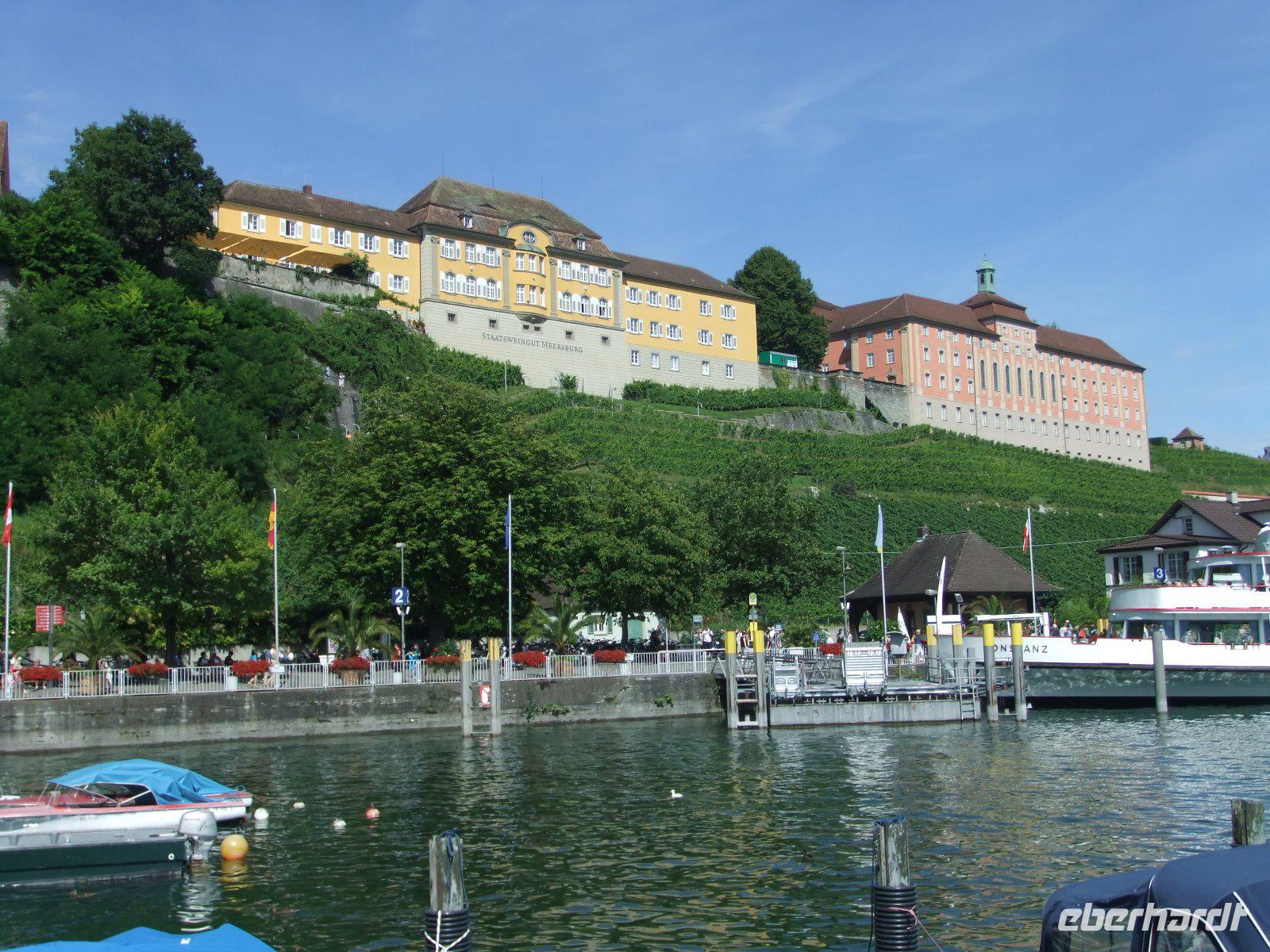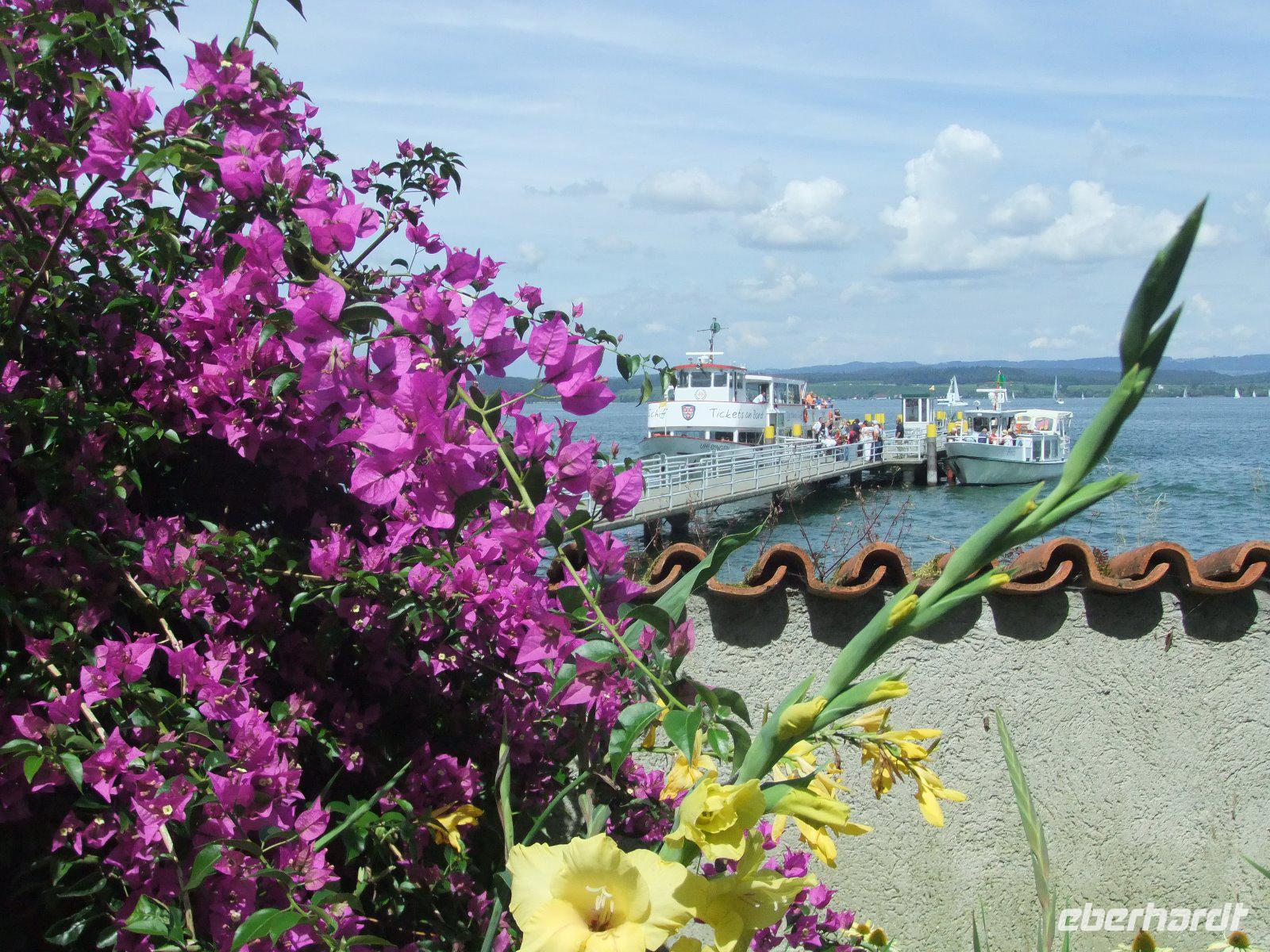 Nach vier sonnigen Stunden auf der Blumeninsel treffen sich alle wieder am Ausgang. Hier erwartet uns allerdings die Nachricht, dass unser Schiff wegen eines Motorschadens nicht fährt. So müssen wir auf das nächste Schiff warten. Doch dann geht es zurück nach Meersburg. Hier haben wir Zeit für individuelle Erkundungen. Einige Gäste gehen über eine der beiden Treppen in die Oberstadt, wo sich u.a. die Burg Meersburg und das Schloss befinden. Andere nutzen die Zeit für eine Kaffeepause am Bodenseeufer.