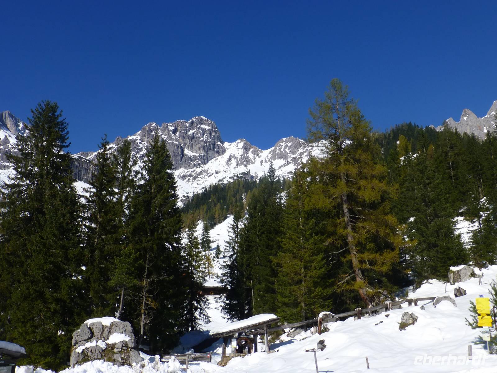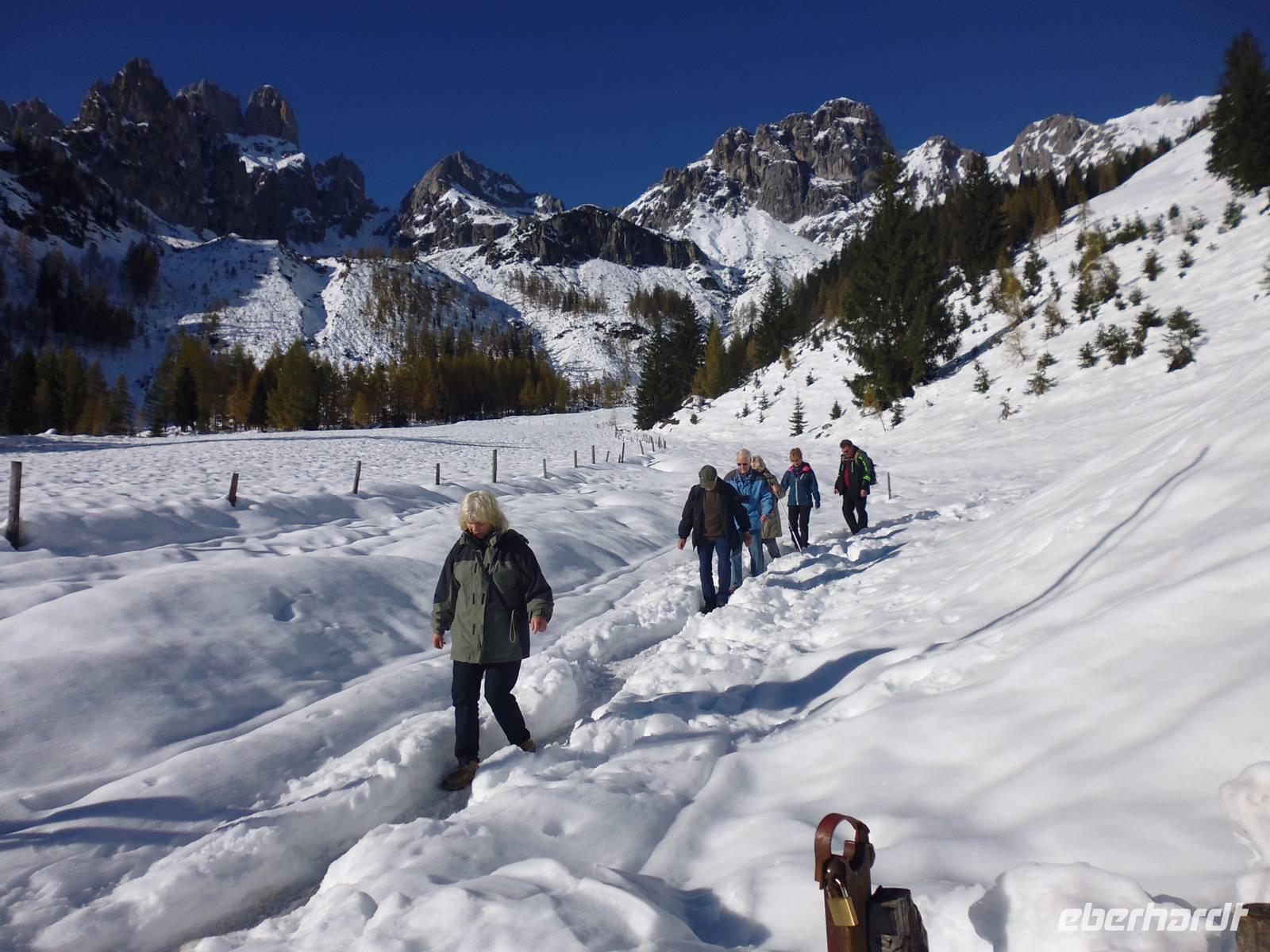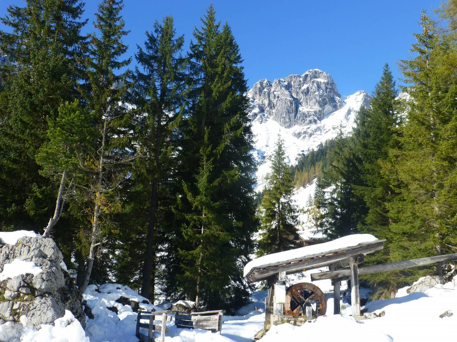 Die Oberhofalm, auf die wir im Anschluss fuhren, liegt am Fuße der imposanten Bischofsmütze im herrlich gelegenen Talschluss des Hofalmgebiets. Die Alm umfasst ein Areal von 463 Hektar - der größte Teil davon ist Weidegebiet für etwa 120 Rinder und Pferde und ca. 120 Schafe. In der urgemütlichen Almhütte wartete bereits das bestellte Essen auf uns, doch der herrliche Sonnenschein zog magisch alle ins Freie. Gemeinsam wanderten wir zum etwas höher gelegenen Almsee und bestaunten in ihm das Spiegelbild der weiß verschneiten Berge. Rundum gibt es Steine mit eingemeißelten Sinnsprüchen und unser Bergführer ließ es sich nicht nehmen, durch den Tiefschnee zu diesen Tafeln zu stapfen und die von ihrer Schneelast zu befreien, um allgemein Menschliches aus Uromas philosophischem Nähkästchen vorzutragen.