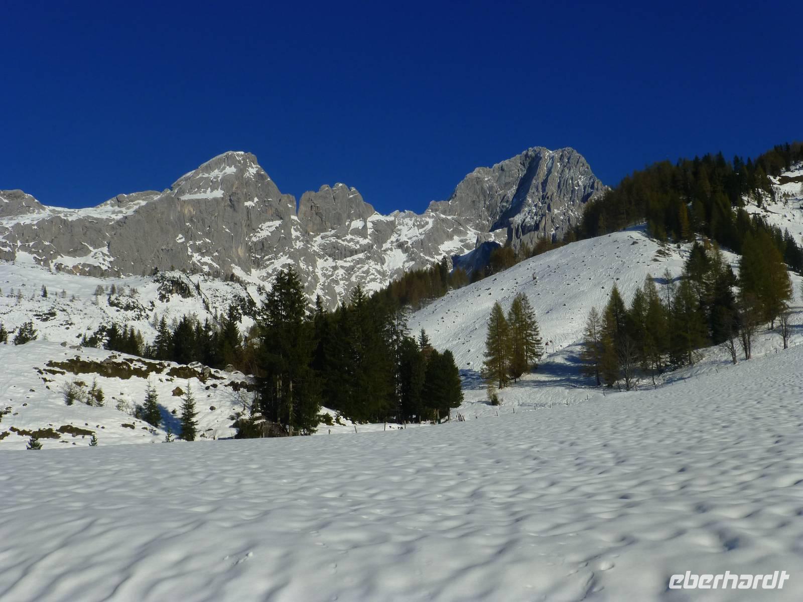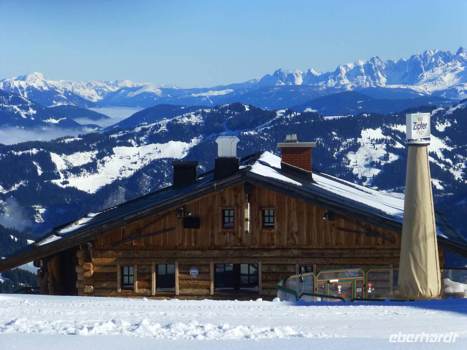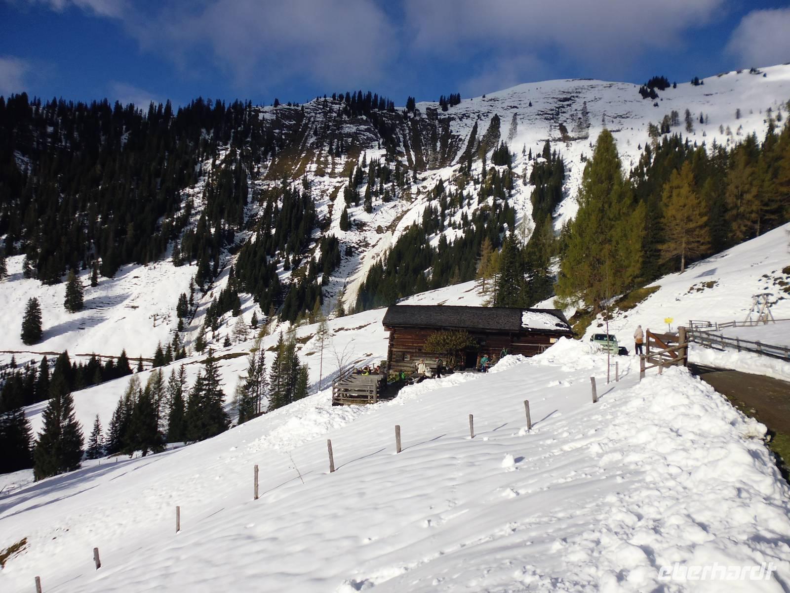 Die Oberhofalm, auf die wir im Anschluss fuhren, liegt am Fuße der imposanten Bischofsmütze im herrlich gelegenen Talschluss des Hofalmgebiets. Die Alm umfasst ein Areal von 463 Hektar - der größte Teil davon ist Weidegebiet für etwa 120 Rinder und Pferde und ca. 120 Schafe. In der urgemütlichen Almhütte wartete bereits das bestellte Essen auf uns, doch der herrliche Sonnenschein zog magisch alle ins Freie. Gemeinsam wanderten wir zum etwas höher gelegenen Almsee und bestaunten in ihm das Spiegelbild der weiß verschneiten Berge. Rundum gibt es Steine mit eingemeißelten Sinnsprüchen und unser Bergführer ließ es sich nicht nehmen, durch den Tiefschnee zu diesen Tafeln zu stapfen und die von ihrer Schneelast zu befreien, um allgemein Menschliches aus Uromas philosophischem Nähkästchen vorzutragen.