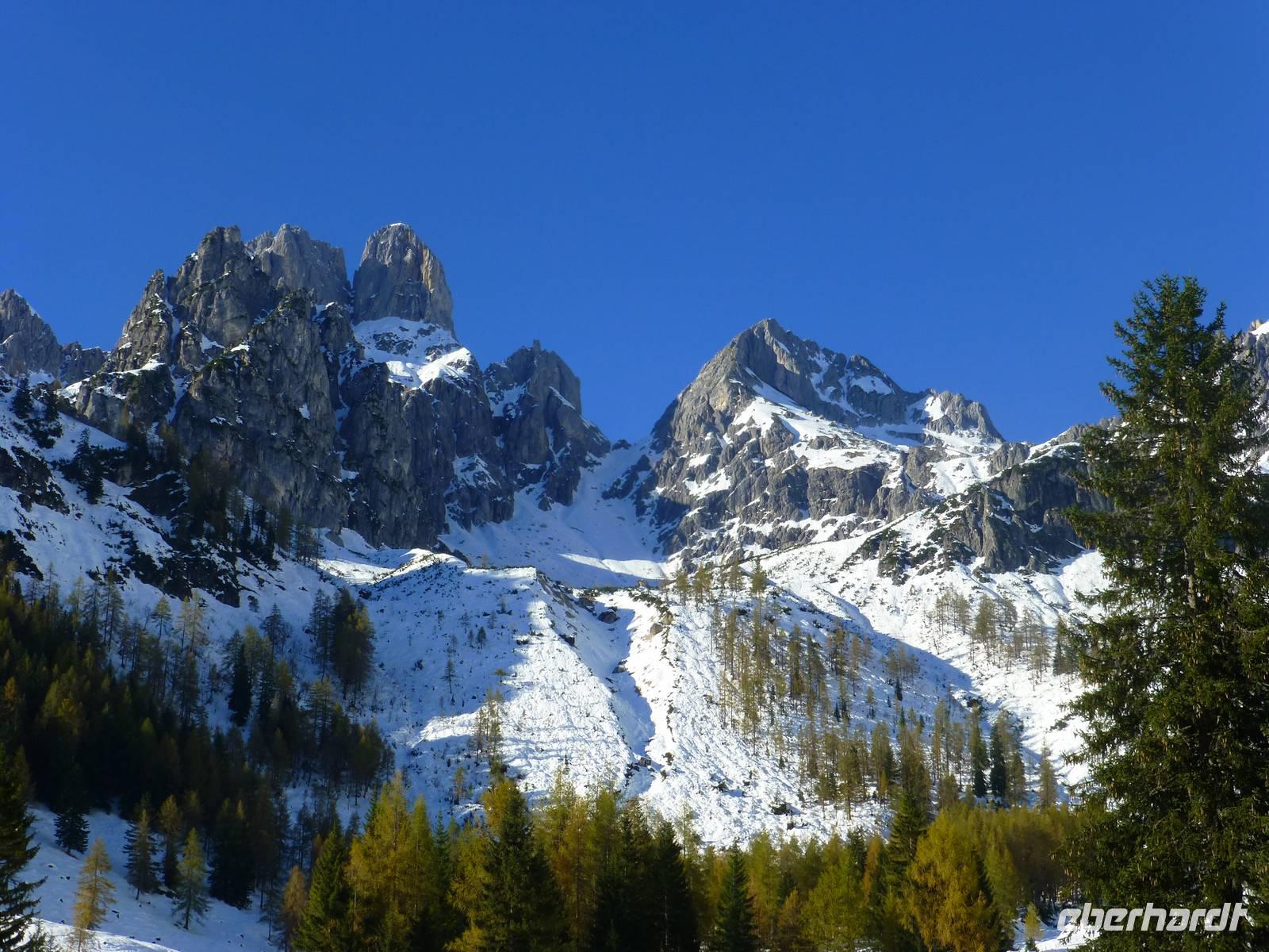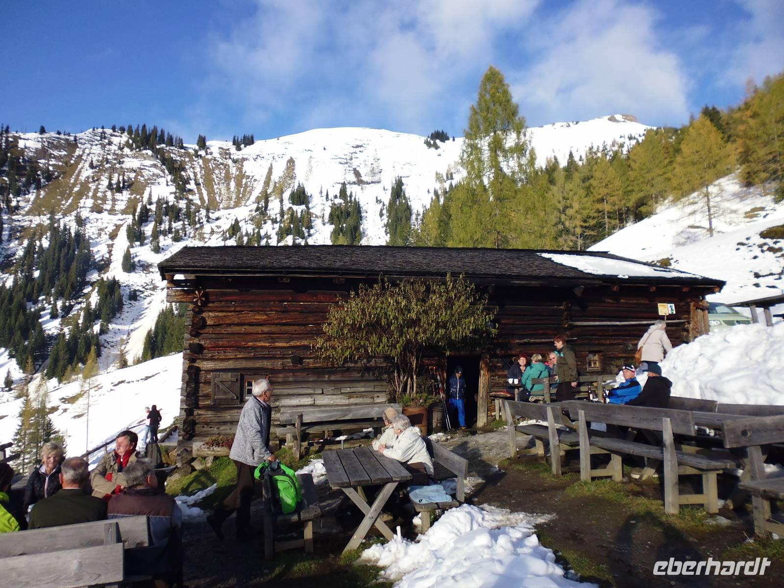 Unser Wirt war auch aktiver Waidmann und die Herren seiner Jagdzunft boten im Rahmen eines sonntäglichen Frühschoppens allerlei Gedichte und Geschichten aus Jagd und Brauchtum dar, umrahmt und bereichert durch den Klang ihrer Jagdhörner. Dann brachten uns insgesamt sieben Kleintransporter zur auf über 1600 Metern liegende Karseggalm, deren gemütliche Almhütte zum letzten Mal vor dem nächsten Frühjahr geöffnet hatte. Auf offenem Herdfeuer brodelte Wasser in zwei rußgeschwärzten Töpfen, denn Strom gibt es nicht hier oben. Nach anfänglichem Nebel riss der Himmel auf und es wurde ein sonniger Nachmittag. Alle Besucher strömten aus den engen Räumen der Almhütte nach draußen und die jungen Musiker, die uns schon im Hotel erfreuten, spielten, bis die Sonne hinterm Berg verschwand und wir wieder ins Tal fuhren. Ein überaus leckeres Abendessen mit anschließendem gemütlichem Beisammensein beschloss diesen herrlichen Tag.