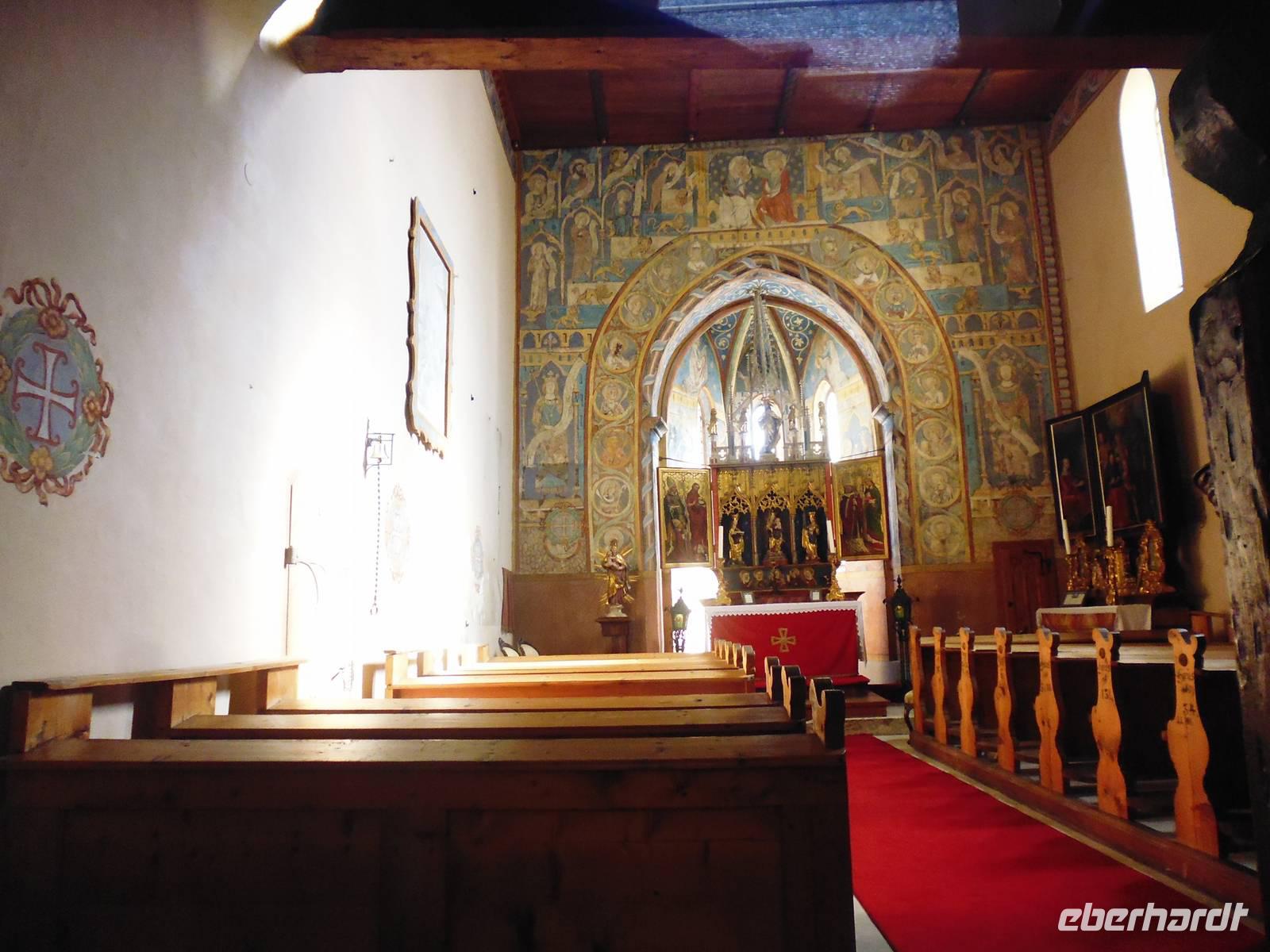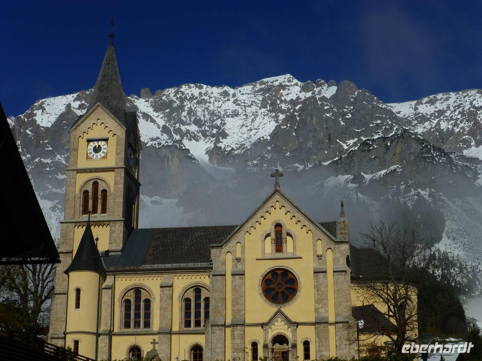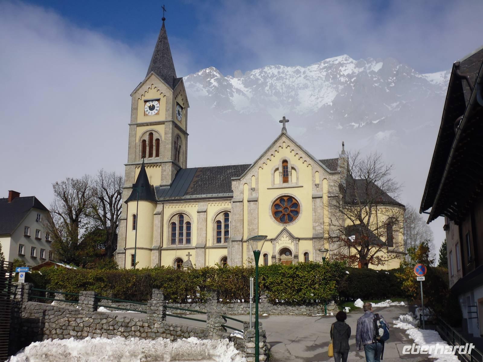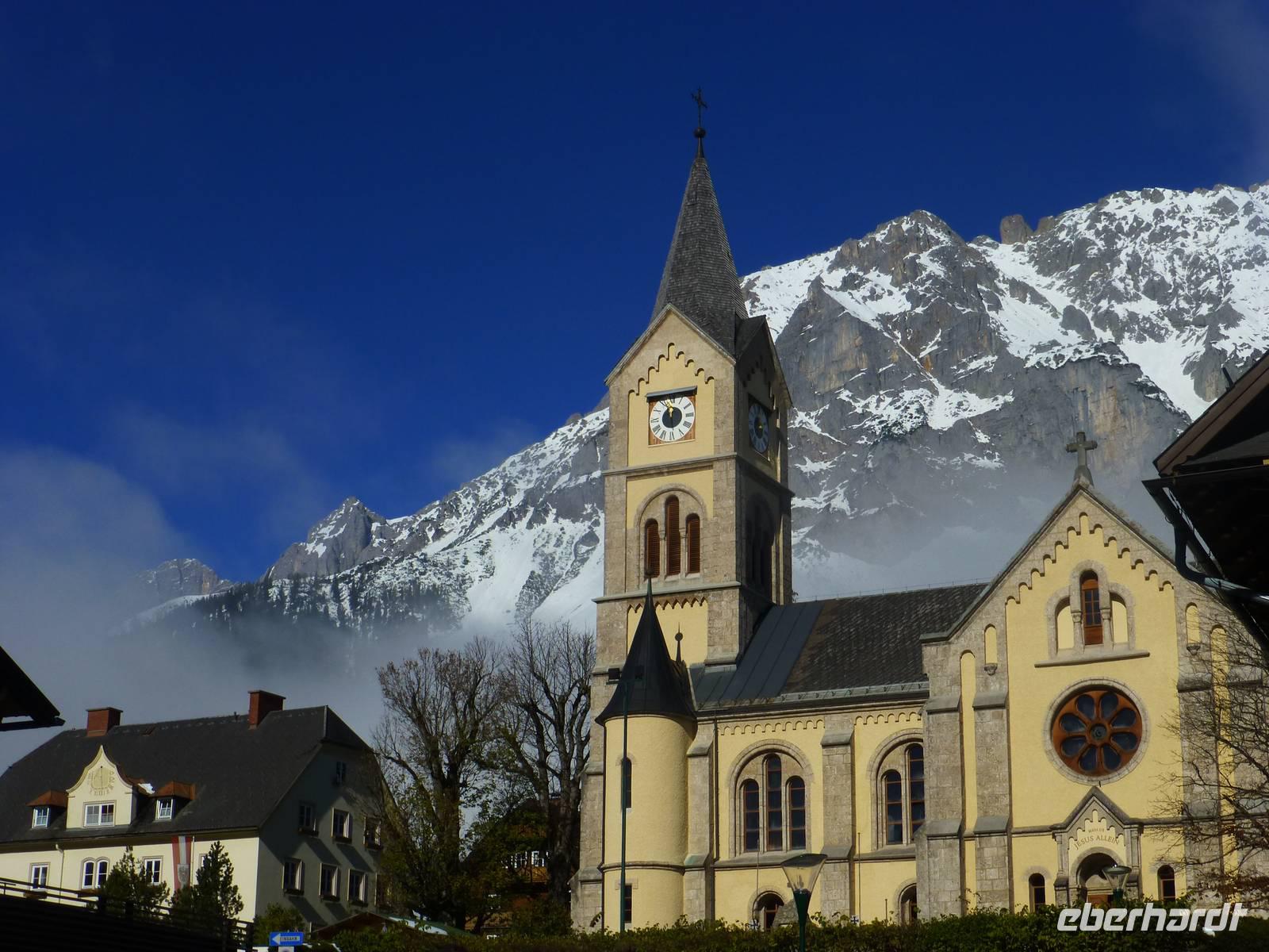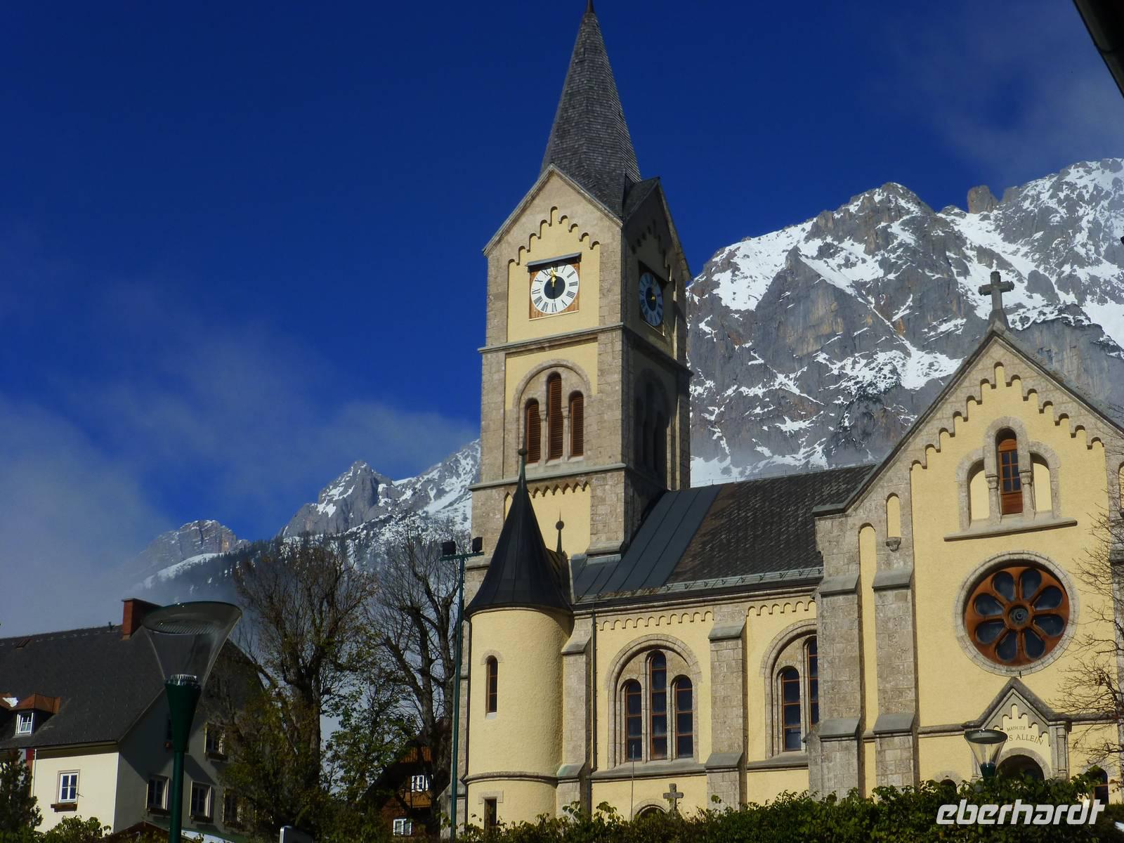 An diesem sonnigen Morgen waren extra zwei örtliche Führer bestellt, die mit uns über Radstadt, Schladming und Ramsau am Dachstein nach Filzmoos fuhren. Die erste Pause legten wir in Radstadt ein, einer im 13. Jahrhundert an der Enns entstandenen Siedlung, die 1289 zur Stadt erhoben wurde. Imposant die bedeutenden Reste der Stadtbefestigung mit drei wuchtigen Ecktürmen. Das Stadtbild wird vom hohen Turm der Stadtpfarrkirche Mariä Himmelfahrt beherrscht. Weiter ging es in den kleinen Ort Ramsau, malerisch vor dem Dachsteinpanorama gelegen. Hier interessierte uns die 1888 gebaute evangelische Kirche. Trotz der radikalen Maßnahmen der katholischen Gegenreformation hatte sich im Geheimen in Ramsau immer eine kleine Gemeinschaft evangelischer Christen halten können, die sich erst in Folge des josephinischen Toleranzedikts wieder offen zu ihrem Glauben bekennen konnte. Im Innern wurde viel Zirbelkiefer verbaut, was nicht nur lange Haltbarkeit, sondern feinen Harzgeruch bringt.
