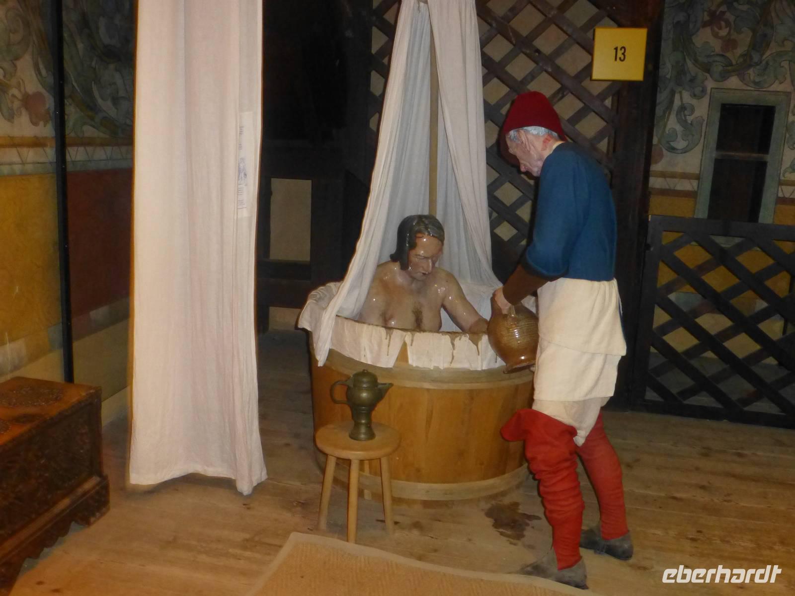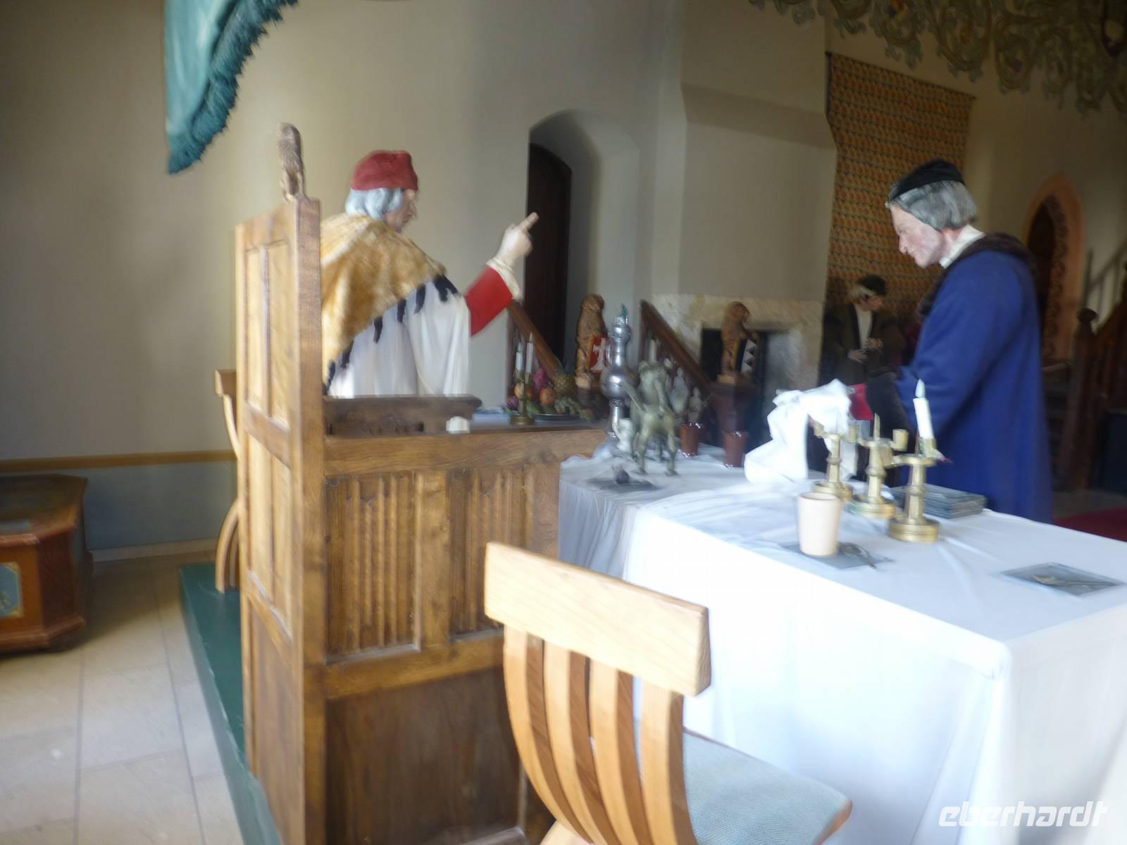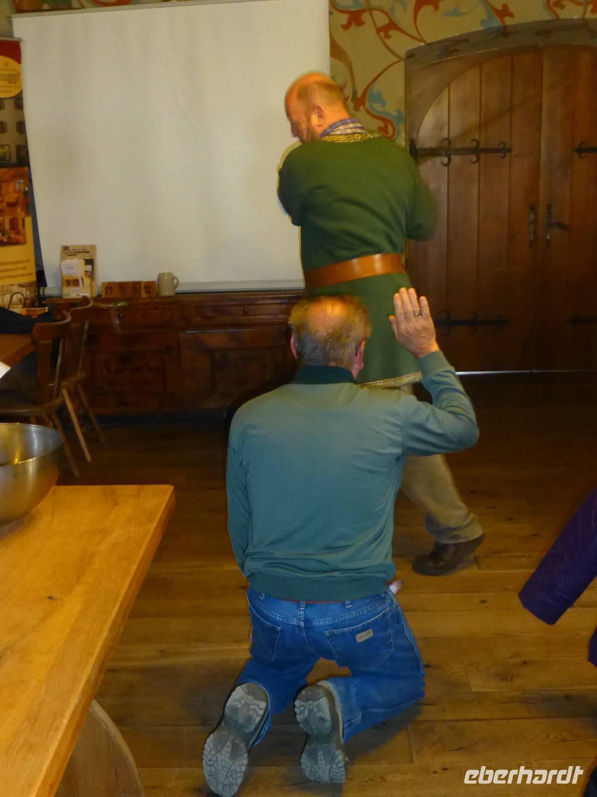 Ausgerüstet mit Audioguides konnte jeder eintauchen in die Geschichte der Mautburg aus dem 13. Jahrhundert. Zu den Höhepunkten zählte die Besichtigung des Wehrturms, der in seiner guten Beschaffenheit einzigartig in Europa ist. Auf seinen vier Etagen zeigen liebevoll mit Figurinen eingebaute Stillleben anschaulich das mittelalterliche Leben auf einer Burg. Vom obersten Stock des Bergfrieds hatte man einen faszinierenden Ausblick auf Mautendorf, die Radstädter Tauern, die Hohen Tauern sowie die Nockberge. Anschließend stärkten wir uns in der Burgschänke. Hier wurde unser jüngster Mitreisender, der neunjährige Tobias, zum Ritter und Fürsten ernannt und huldvoll überschaute er das Geschehen von seinem Thron aus. Sein zum Knecht ernannter Reiseleiter und mehrere Burgfräuleins und Ritter aus dem Reisetross vergnügten sich nun bei Ritterspielen und heiterem Geplänkel. Gar köstlich mundeten Blutwurst und Käsenockerln aus der großen Ritterpfanne.