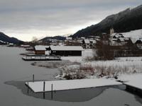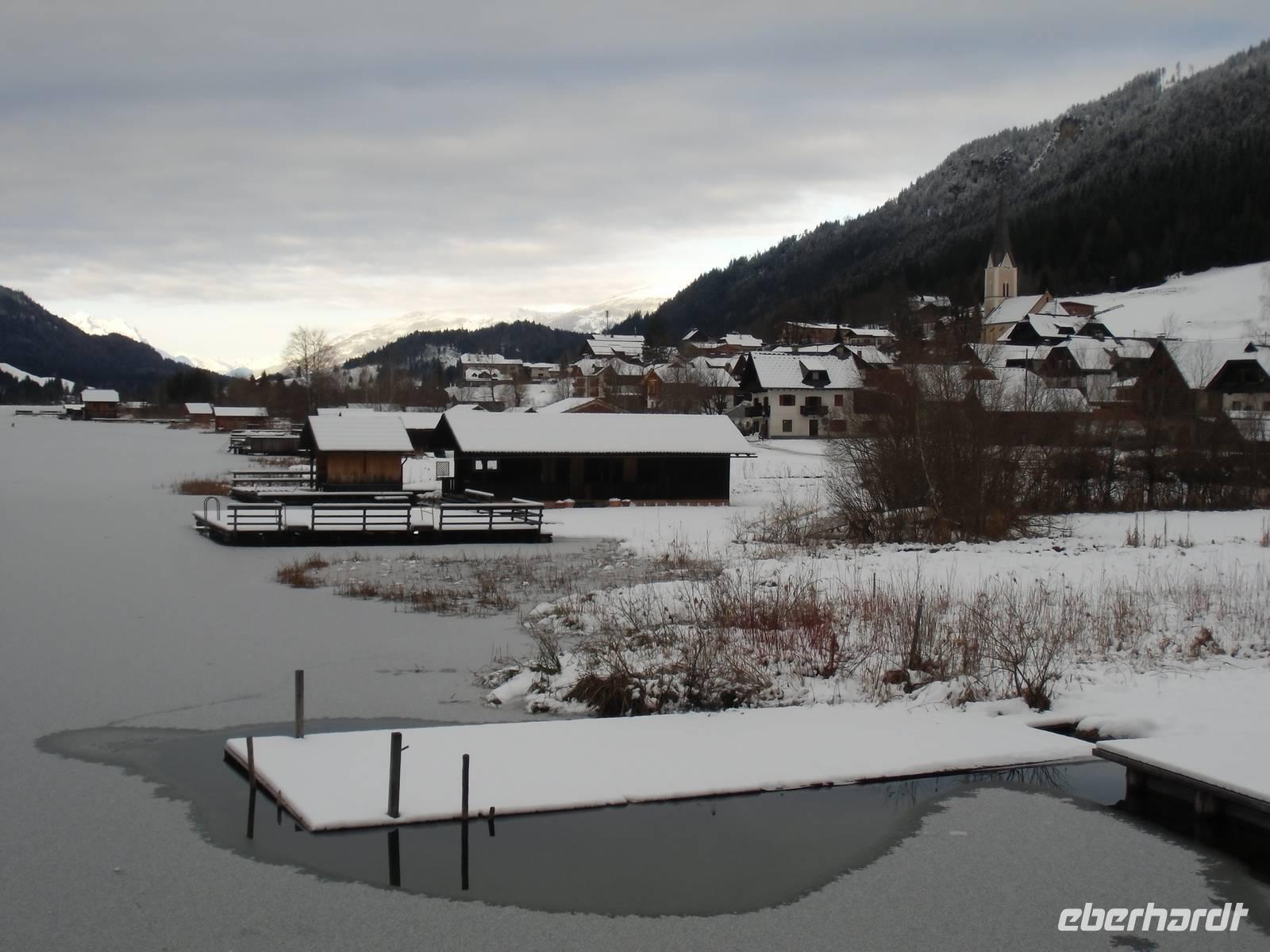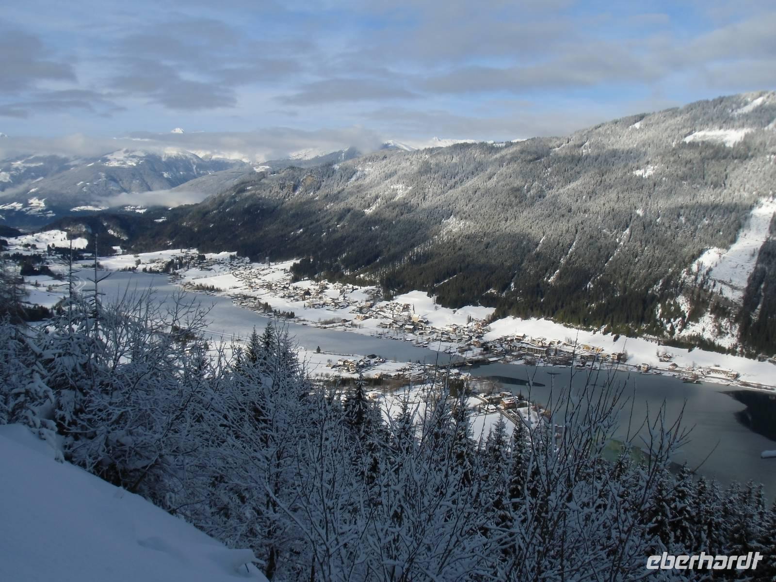 Die Brücke über den Weißensee zu Fuß überquerend, gelangten wir zur Bergbahn, die uns hinauf zur Naggler-Alm brachte. Die Wolkendecke riss zunehmend auf, die Sonne strahlte vom Firmament - ein perfektes tief verschneites Winterbild! Oma Friedel war unsere Führerin durch ihre Heimat, die unterwegs in ihrer unvergleichlich charmanten Art die kleinen Geheimnisse der Einheimischen verriet. Wer den Abstieg zum See über die Rodelbahn zu Fuß wagte, denen eröffneten sich herrliche Blicke auf den Weißensee, in dem sich die schneebedeckten Bäume des Gegenhanges spiegelten. Zum Silvster-Menü tafelte unsere Wirtfamilie auf, was nur Küche und Keller hergaben; und mit Live-Musik und Tanz rutschten wir fröhlich ins neue Jahr.