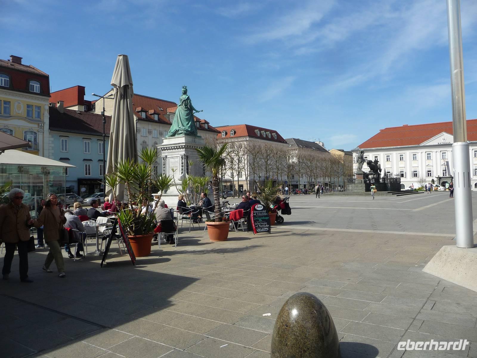 Strahlender Sonnenschein wird auch der Wegbegleiter zu unserem heutigen Ausflug in die Landeshauptstadt Kärntens, nach Klagenfurt sein. Die beiden Eberhardt-Reiseleiter führen ihre jeweilige Busgruppe vom Jugendstil - Stadttheater aus zur Stadthauptpfarrkirche mit dem 97 m hohen und damit höchsten Turmbau Kärntens. Von dort zum Heuplatz kommen wir am Floriani - Denkmal vorbei, das an den verheerenden Stadtbrand vom Jahre 1514 erinnert.