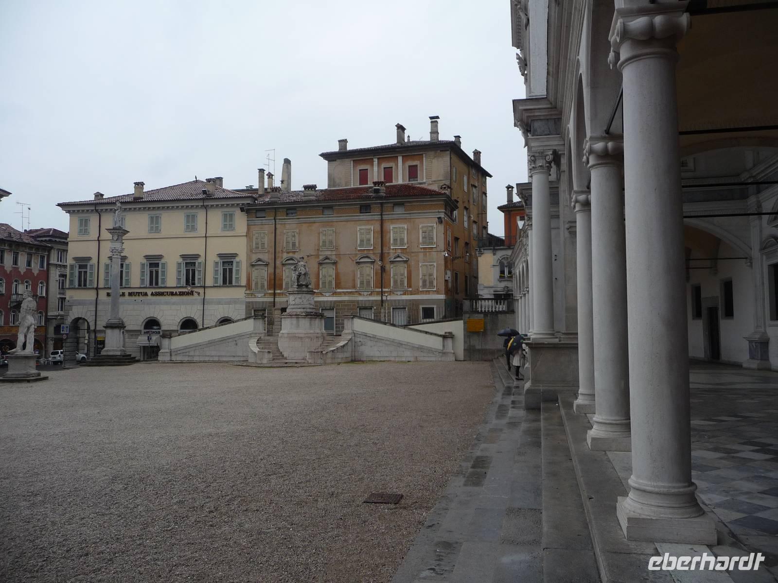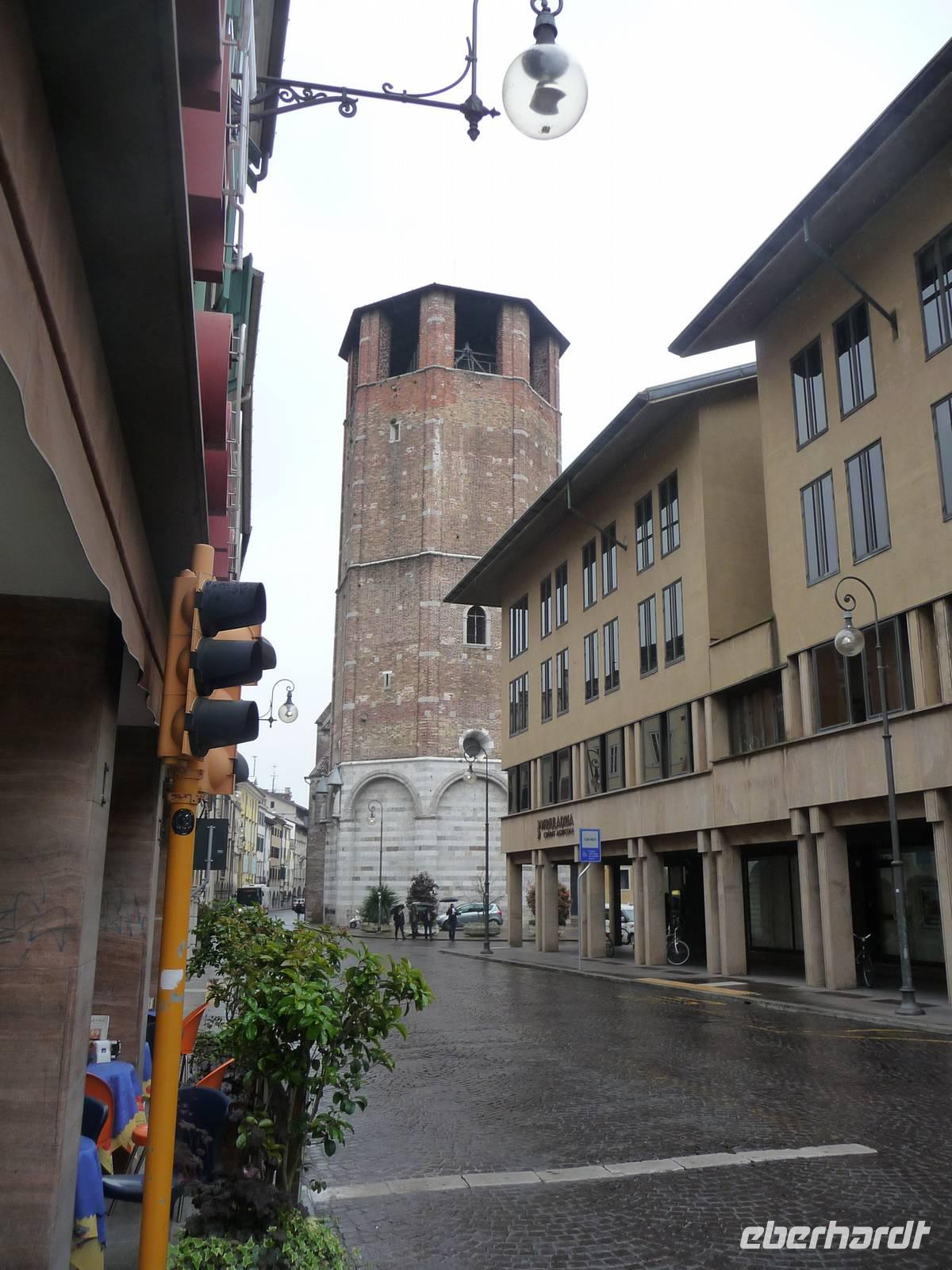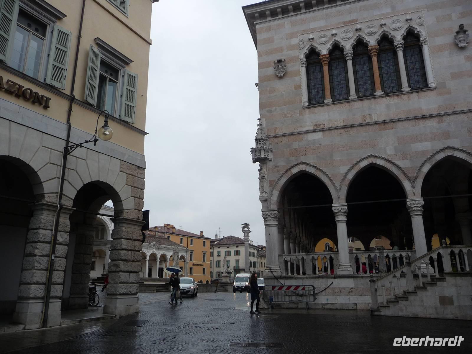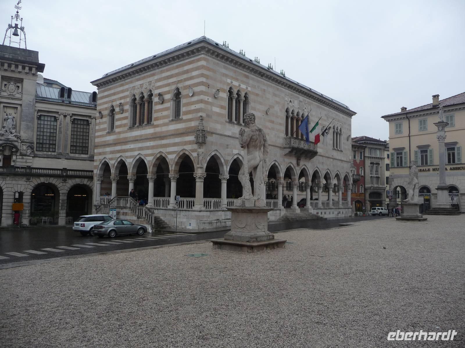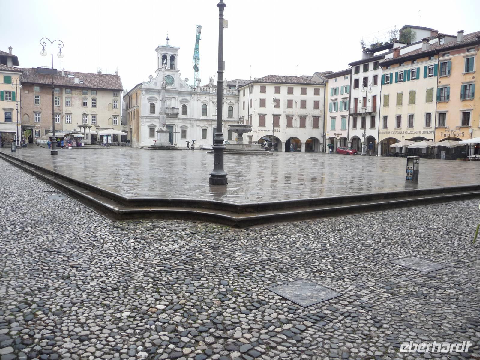 In Udine findet ein Strassenfest statt, das unsere beiden Busfahrer Ralf und Jürgen fordert, durch enge Sträßchen zu fahren, schließlich, angeleitet durch unsere ortskundigen Stadtführer, aber den gewünschten Busparkplatz innerstädtisch erreichen. Den Gästen hat es als eine zusätzliche Stadtrundfahrt recht gut gefallen, noch dazu, da es leicht zu nieseln angefangen hat, von wegen sonniges Italien! Uns hat der dann sich anschließende Stadtrundgang mit kompetenter Erklärung viel Wissenswertes über Udine vermittelt. Besonders der Hauptplatz, die "Piazza della Liberta" , einer der schönsten Plätze Norditaliens in manchem an Venedig erinnernd, hat bei uns Eindruck hinterlassen.
